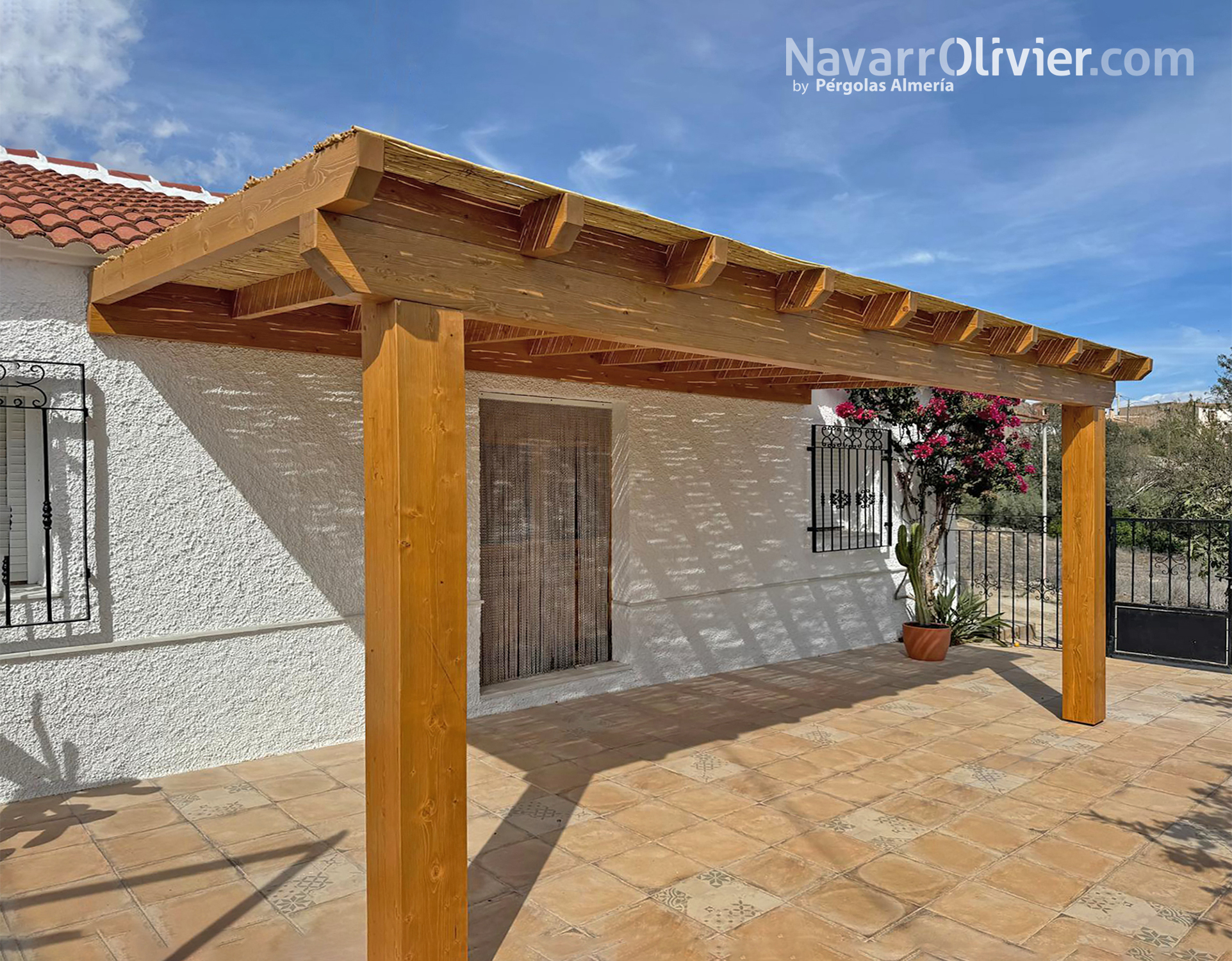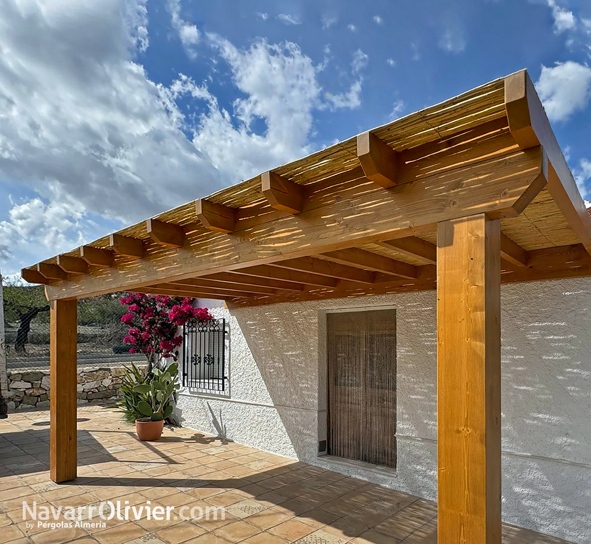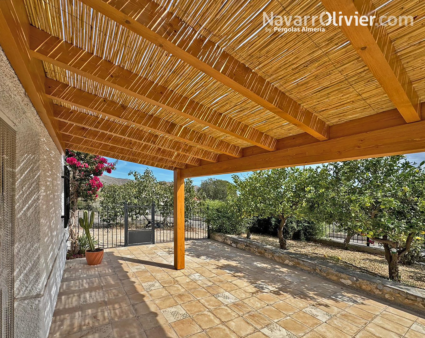 La estructura está construida de madera laminada y maciza tratadas para exterior, cuenta con una cubierta de cañizo de caña entera que brinda un sombraje ventilado natural.