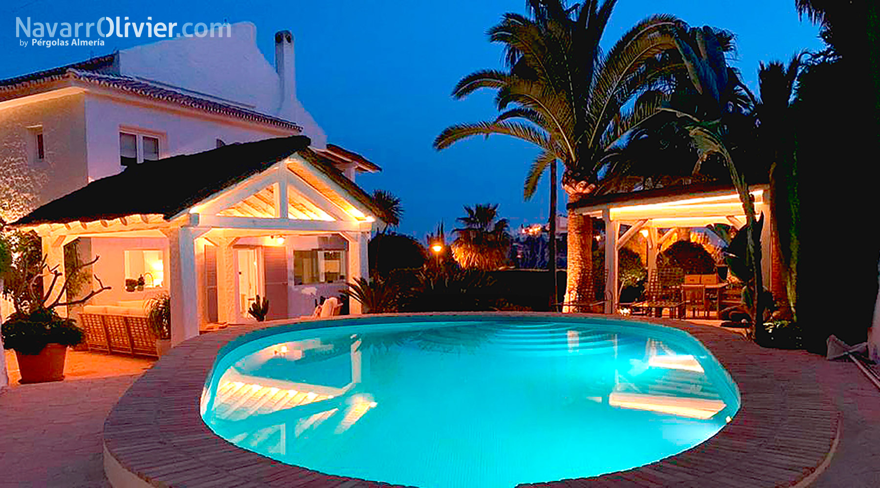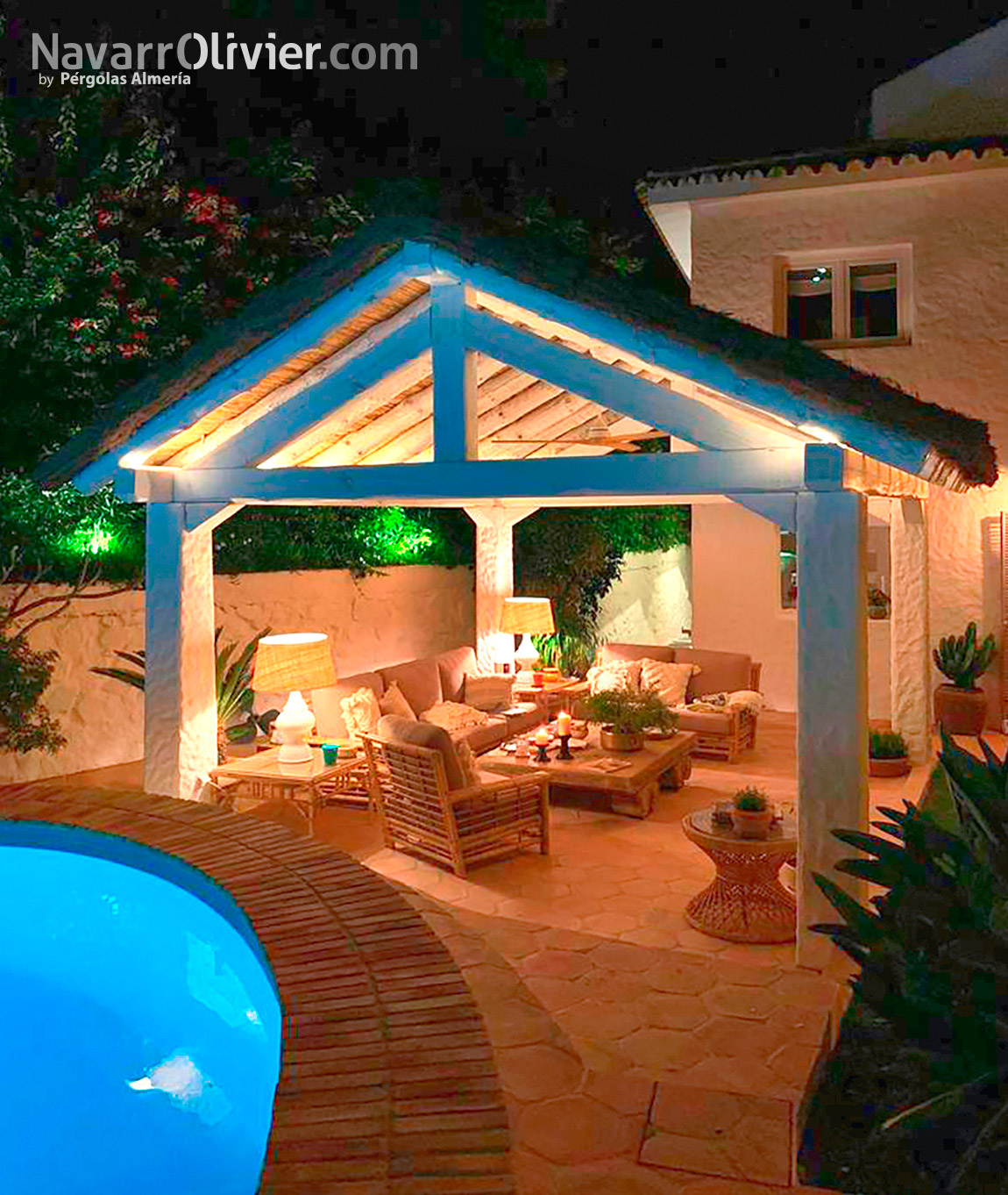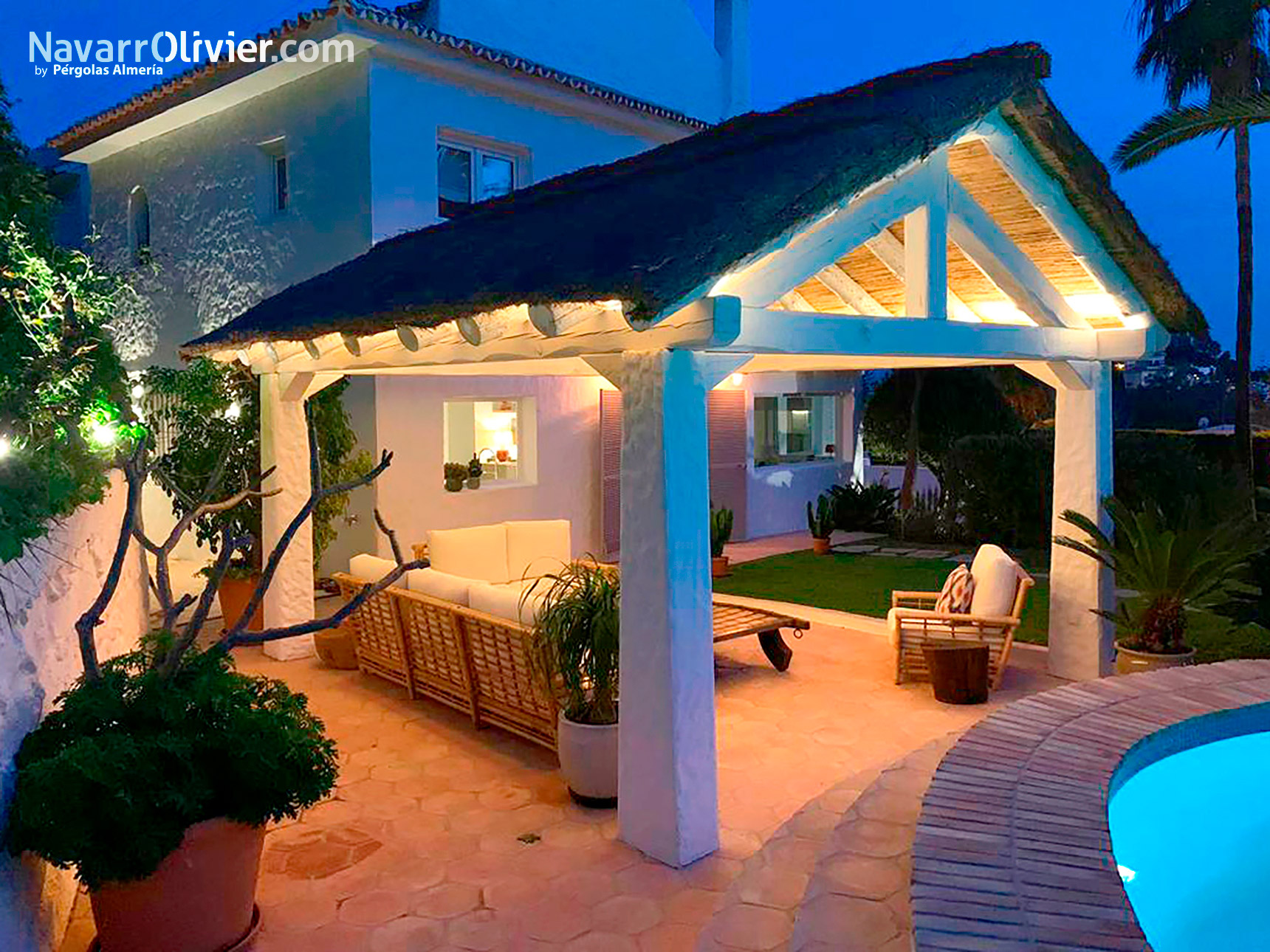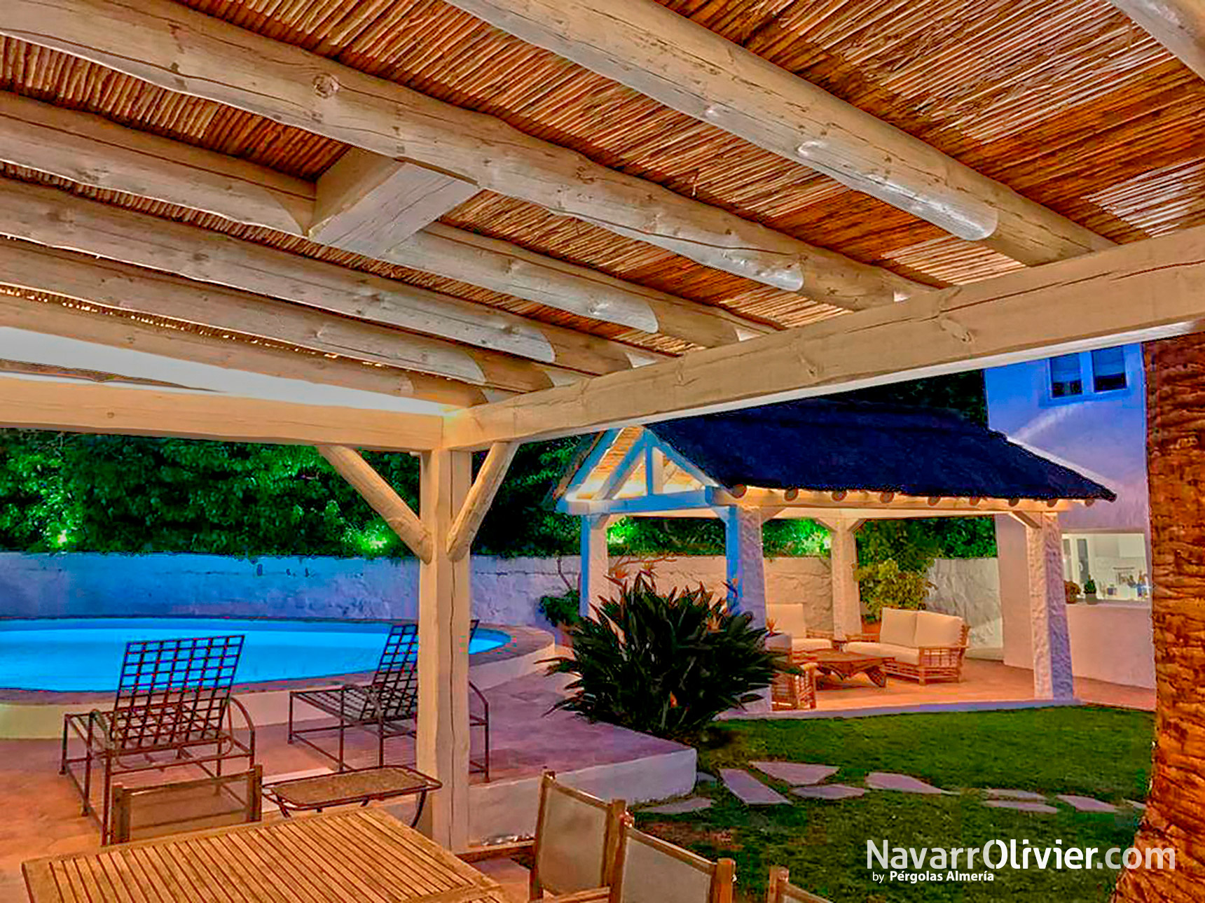 La estructura de gran valor decorativo se integra con la vivienda y crea un nuevo activo en el jardín como antesala de la piscina.