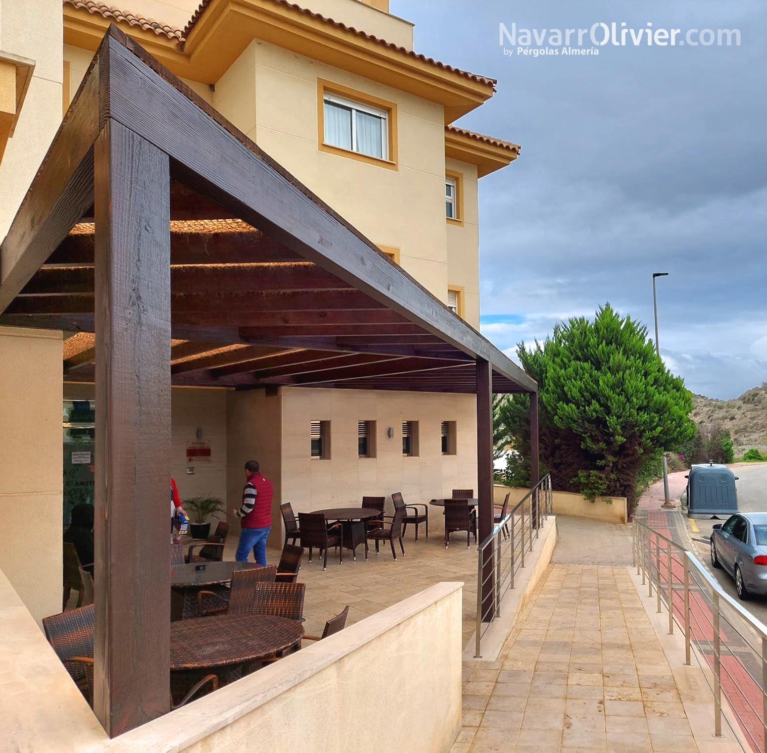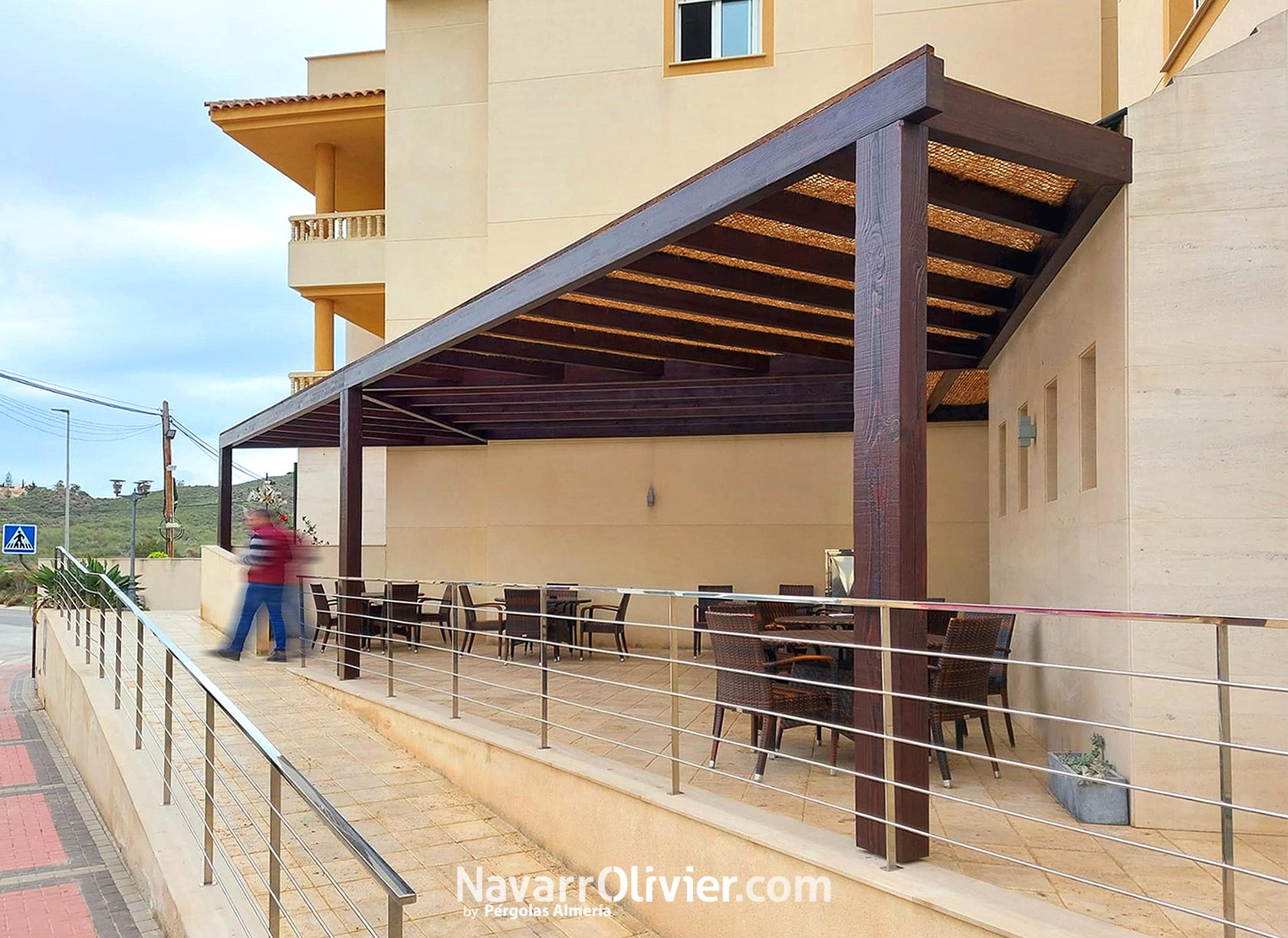Pérgola de madera tratada para exterior para dar sombra a la terraza de la cafetería.