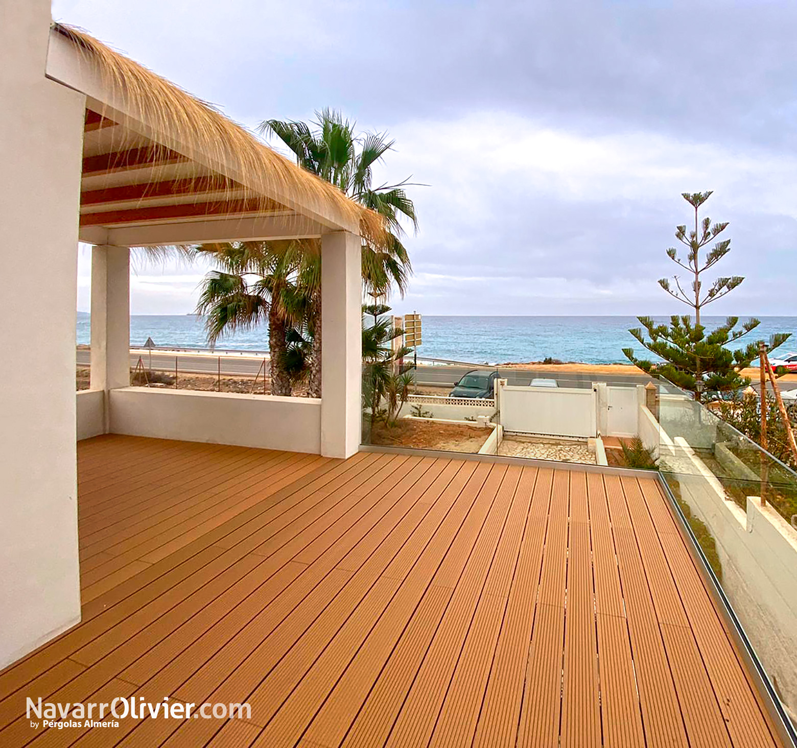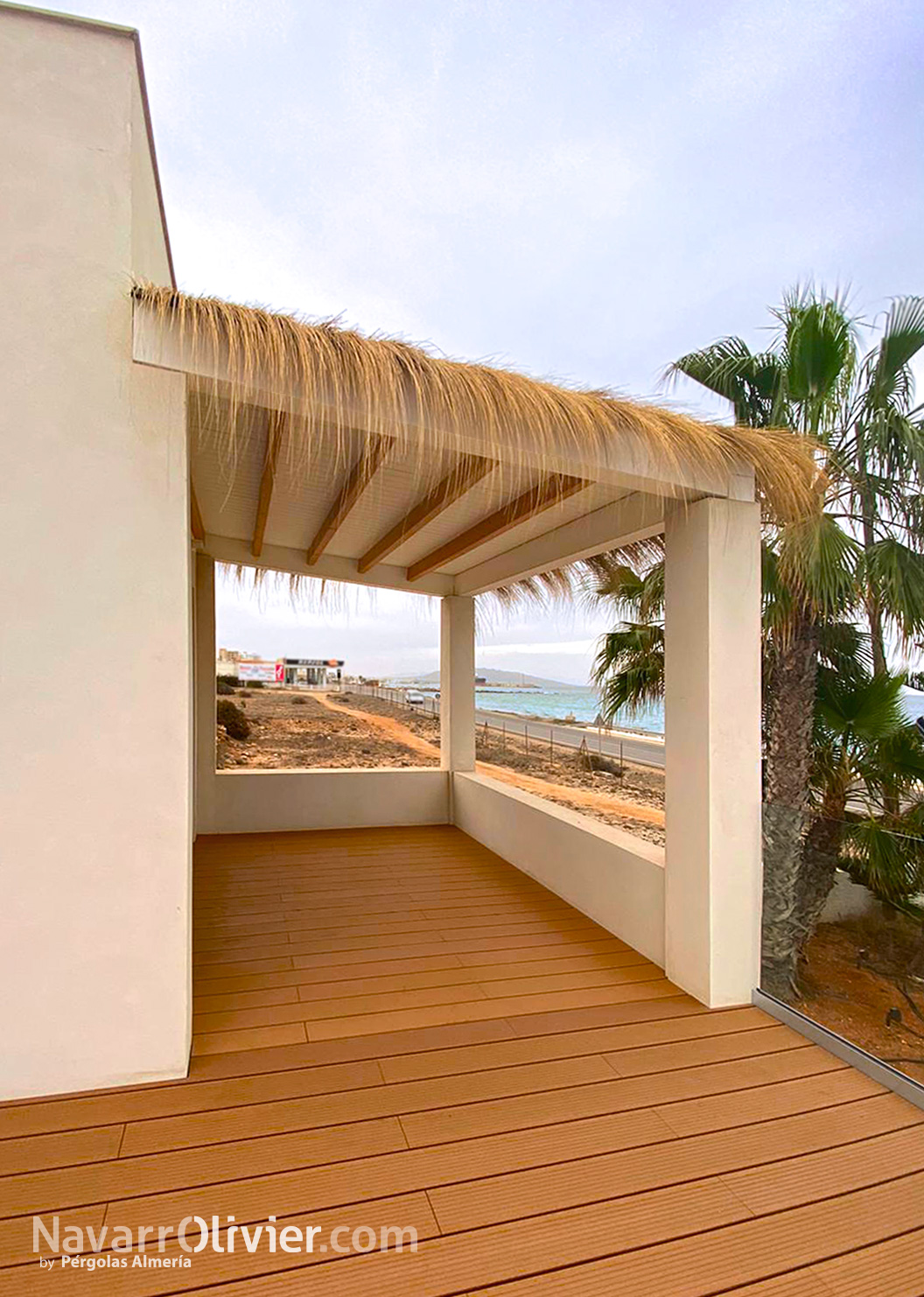 Esta reforma realizada en la localidad de Mojácar destaca además por el remate perimetral de la cubierta en carritx natural y la barandilla de la nueva terraza fabricada en cristal de seguridad para una vista al mar libre libre de obstáculos.