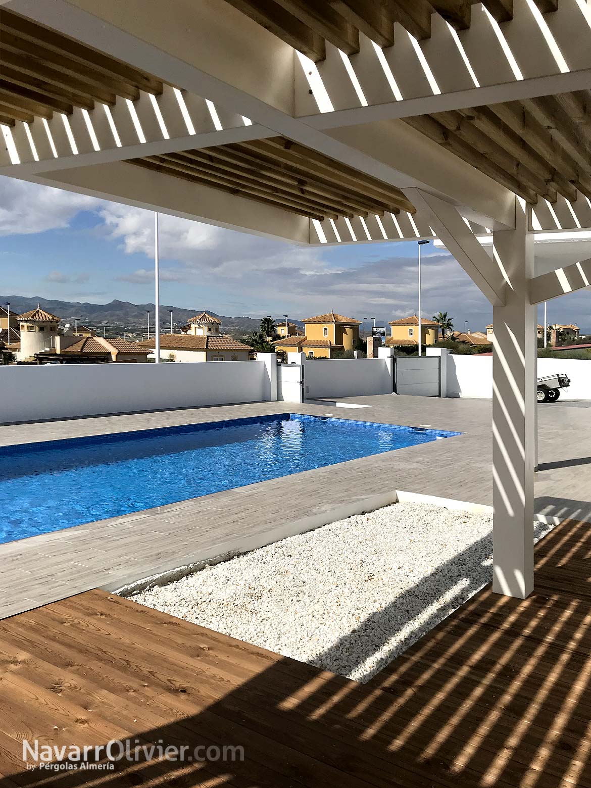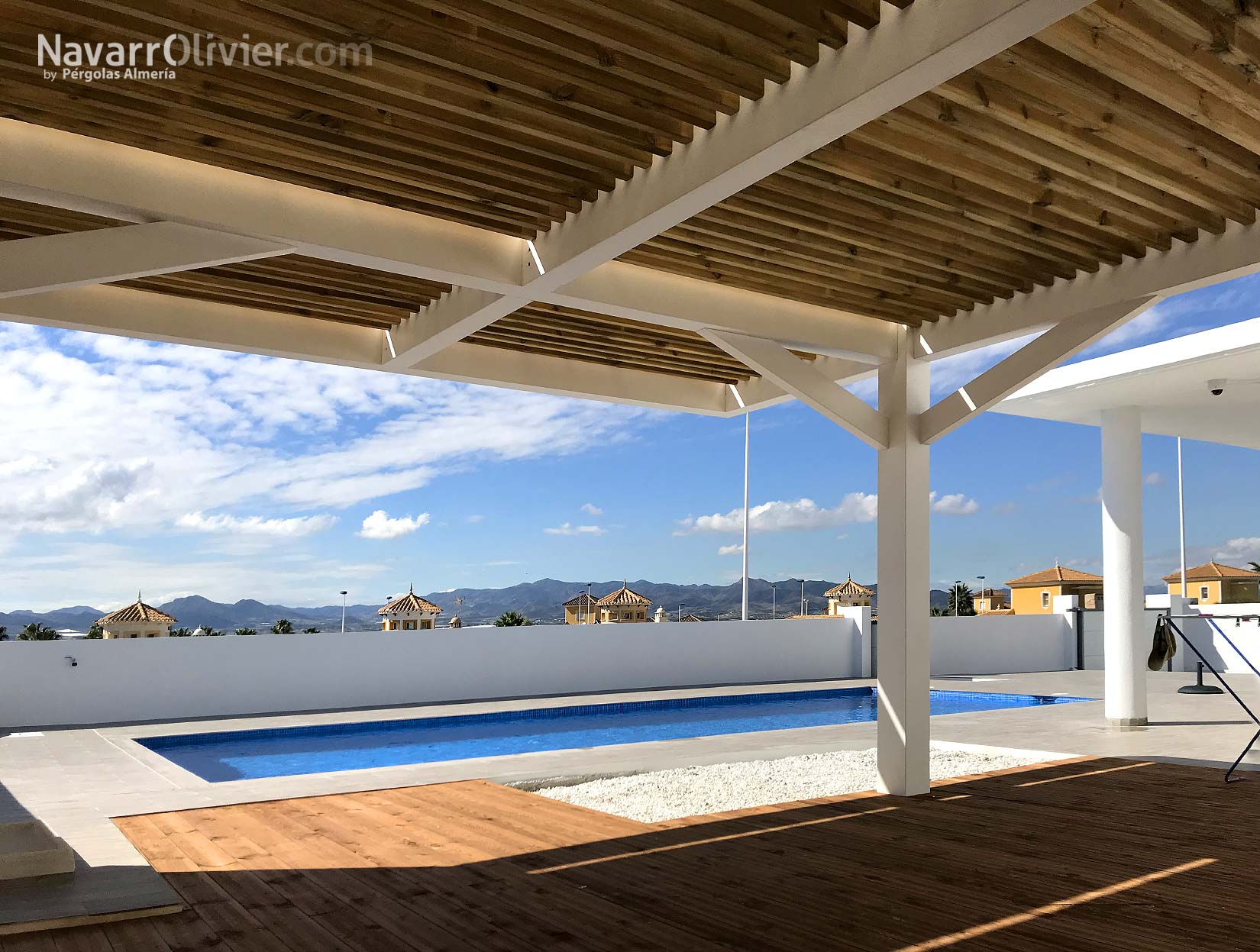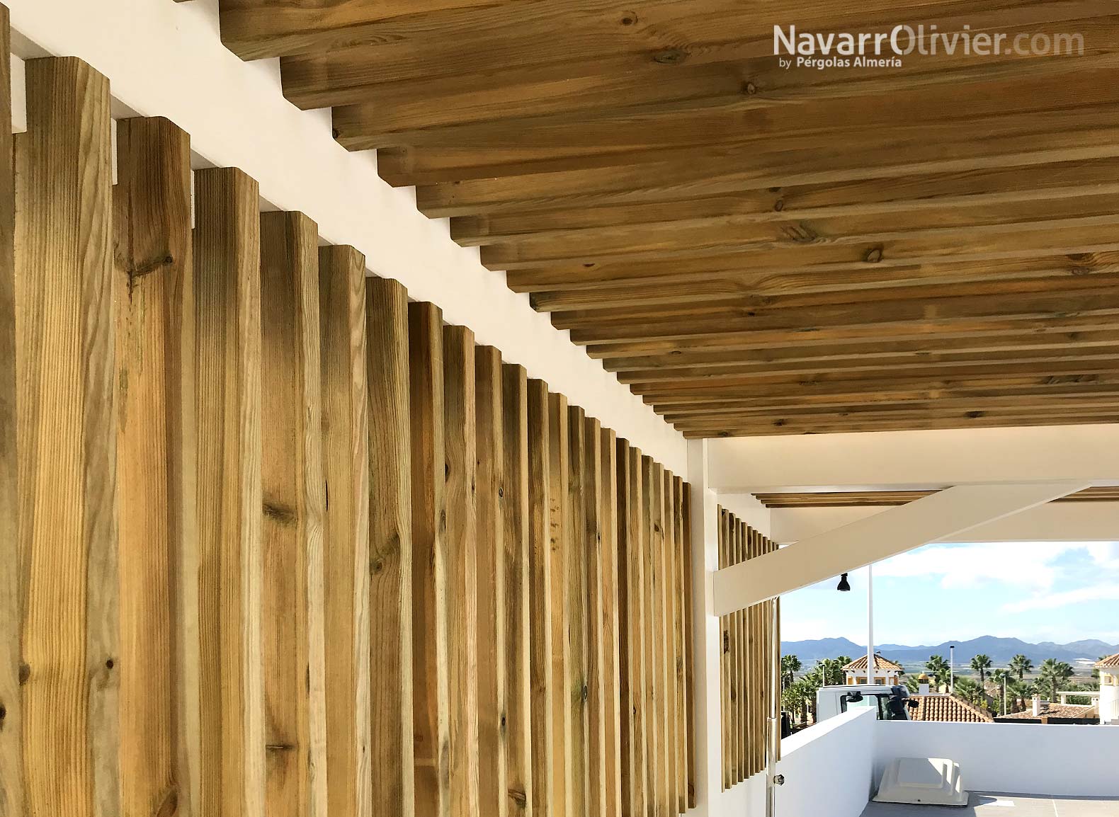 La instalación realizada en una vivienda unifamiliar de Mazarrón cuenta con una pérgola en madera laminada acabada en blanco con una cubierta ventilada en listones paralelos con continuidad hasta el muro que aporta refugio y procacidad, el suelo de la terraza en madera de abeto con ranurado antideslizante tratado en autoclave aporta calidez a la instalación e incluye luces led empotradas.