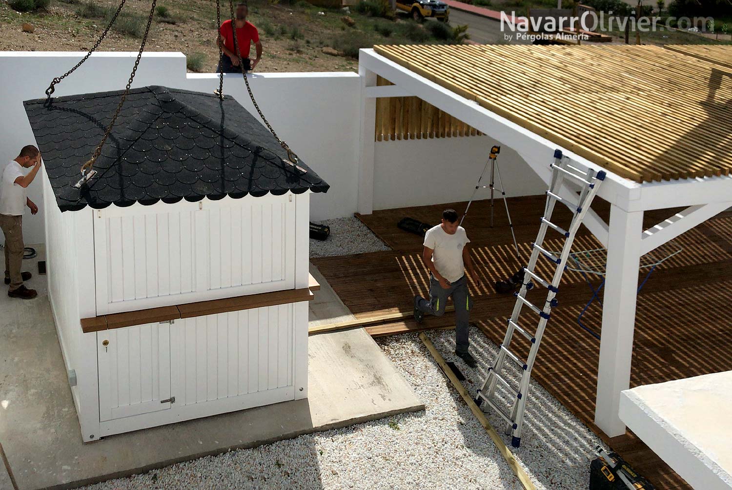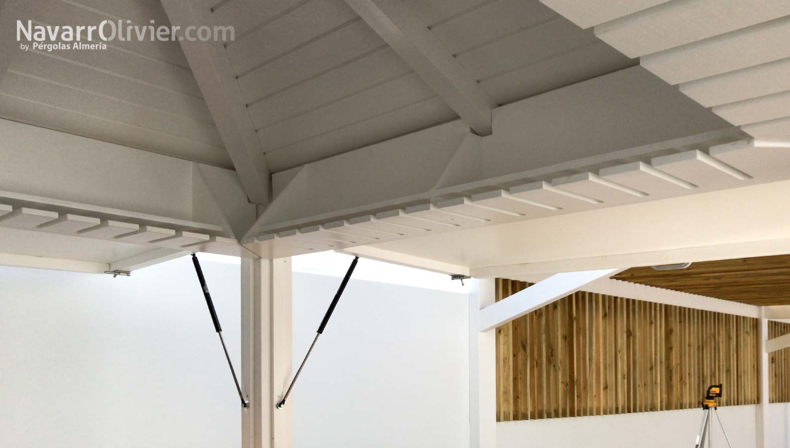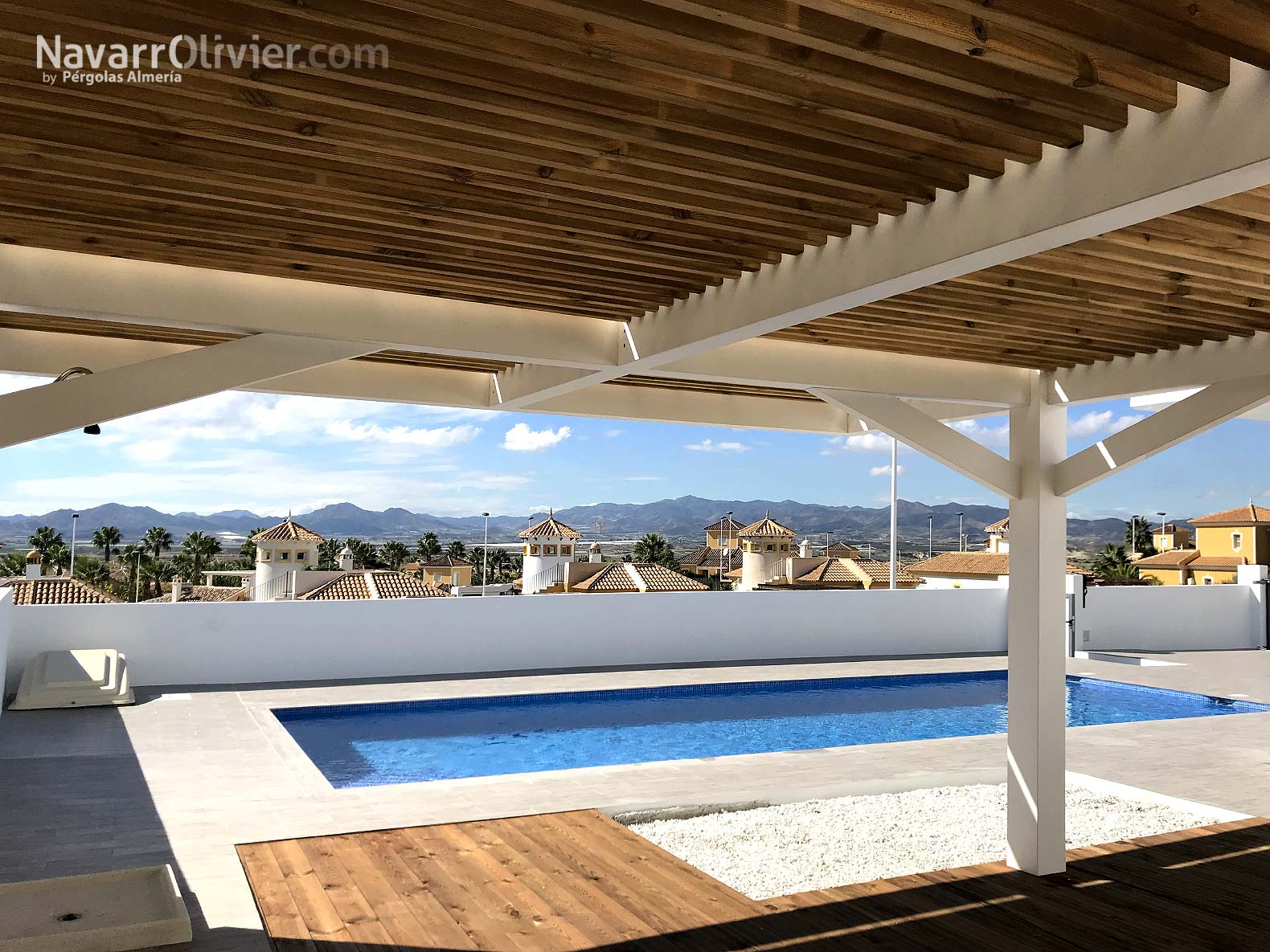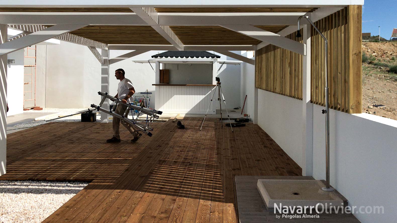 La instalación realizada en una vivienda unifamiliar de Mazarrón cuenta con una pérgola en madera laminada acabada en blanco con una cubierta ventilada en listones paralelos con continuidad hasta el muro que aporta refugio y procacidad, el suelo de la terraza en madera de abeto con ranurado antideslizante tratado en autoclave aporta calidez a la instalación e incluye luces led empotradas.