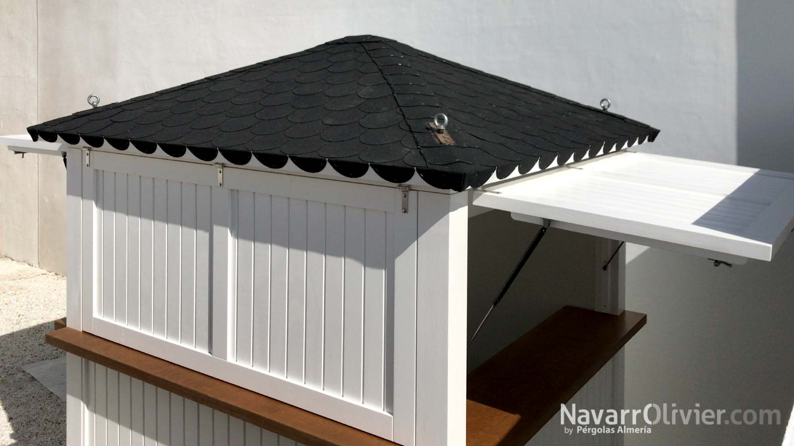 En la zona exterior de la vivienda también se instaló un chiringuito modular modelo Lemon, una pequeña caseta en madera para exterior acabada en blanco con cubierta a 4 aguas rematada en tégola negra equipada con estantes cuelga copas e instalación eléctrica.