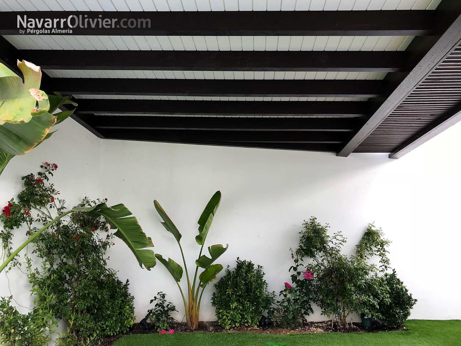 La cubierta aprovecha el muro perimetral y la propia vivienda para crear un espacio de sombraje mixto con la mayor superficie impermeable y un espacio de luz filtrada mediante listones paralelos.