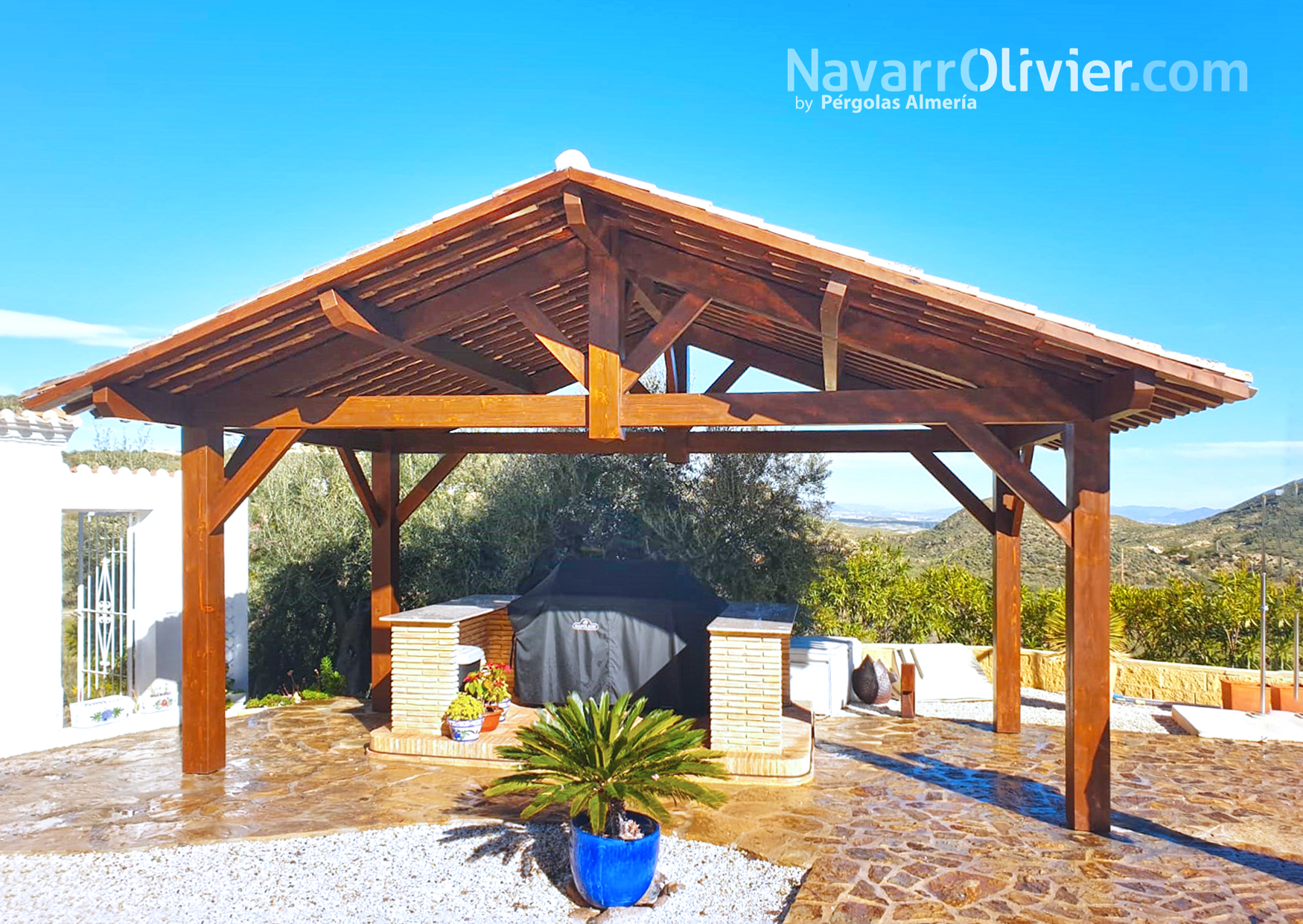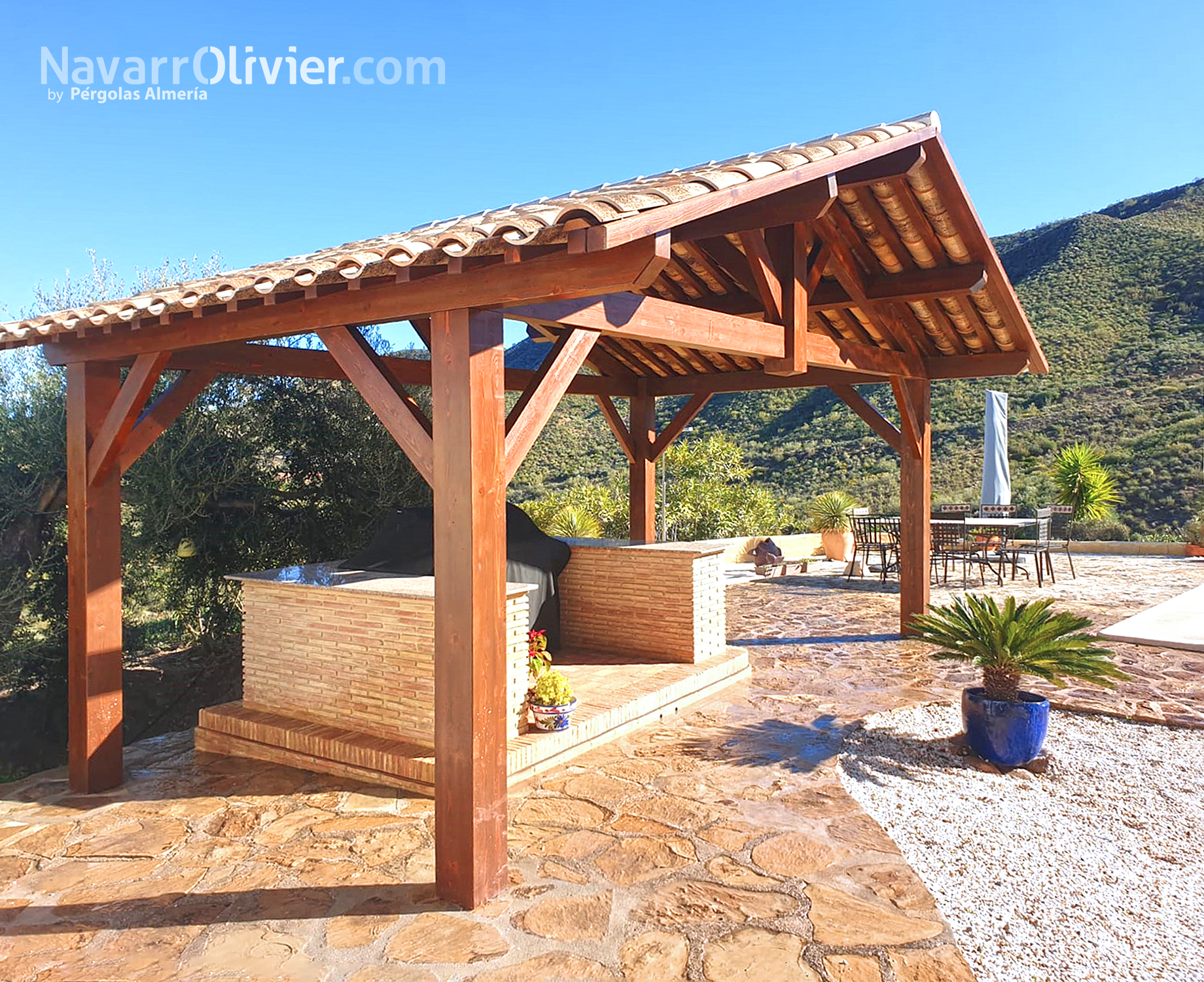 Pérgola de madera con cubierta a 2 aguas para cocina exterior de casa rural.