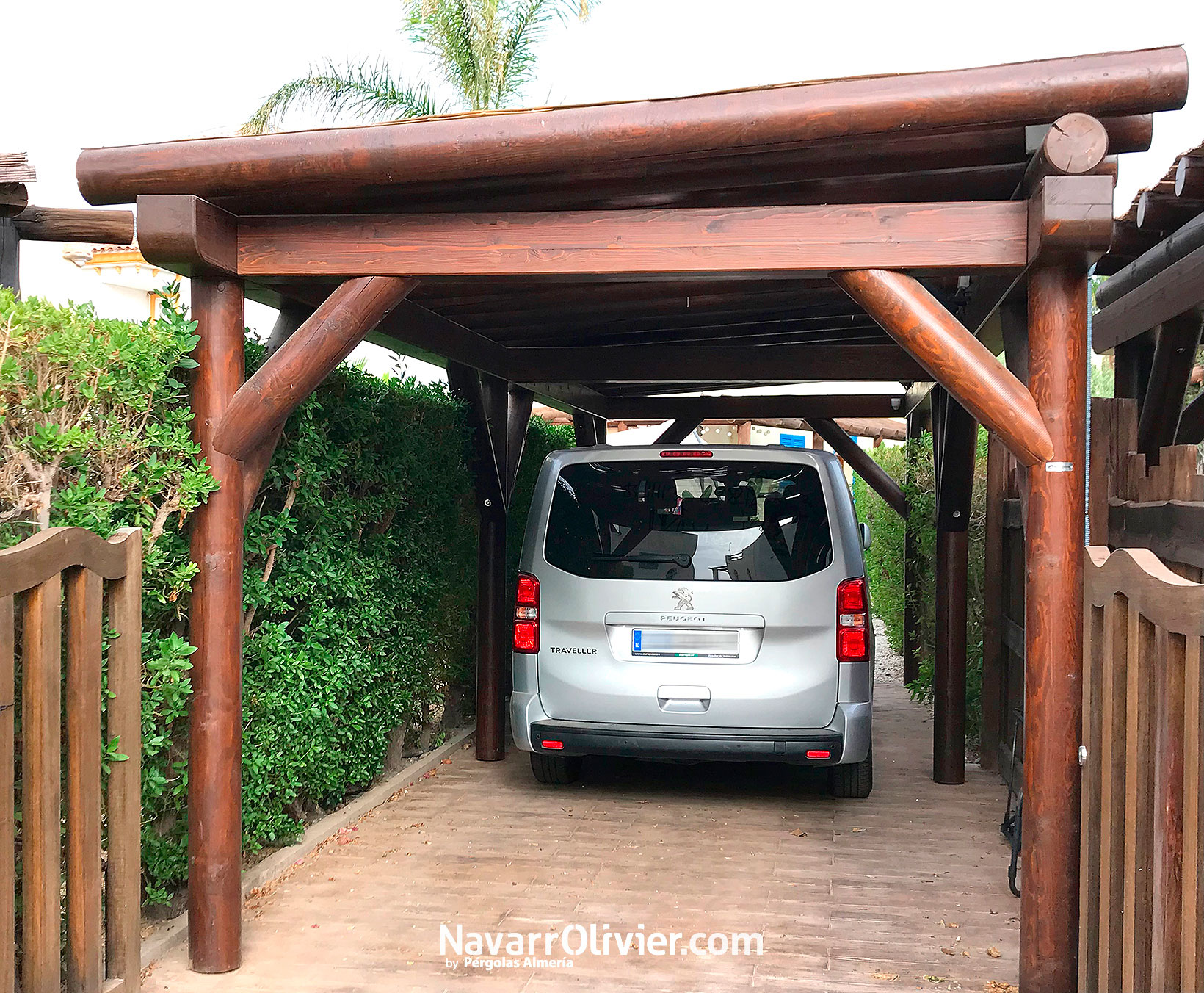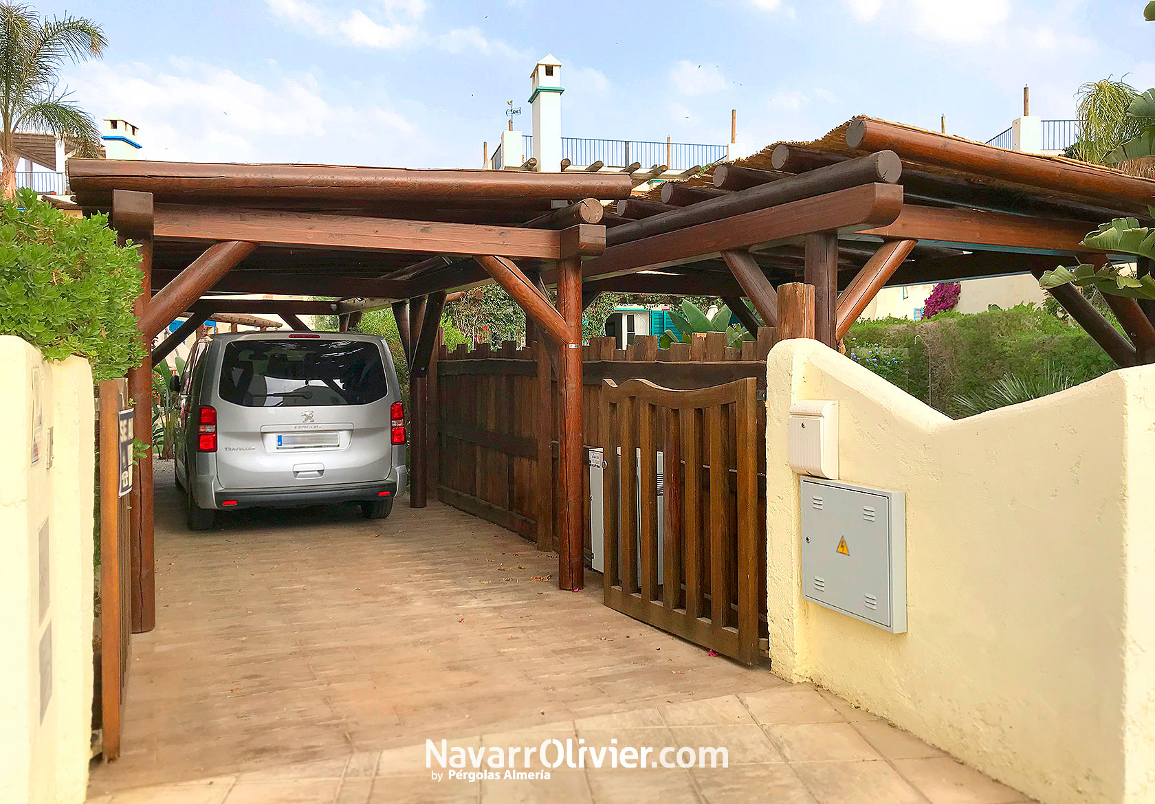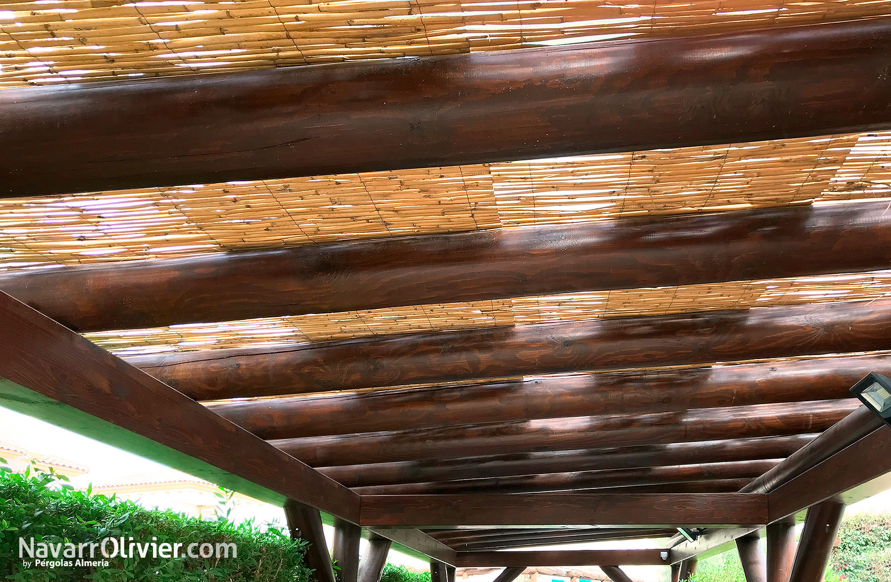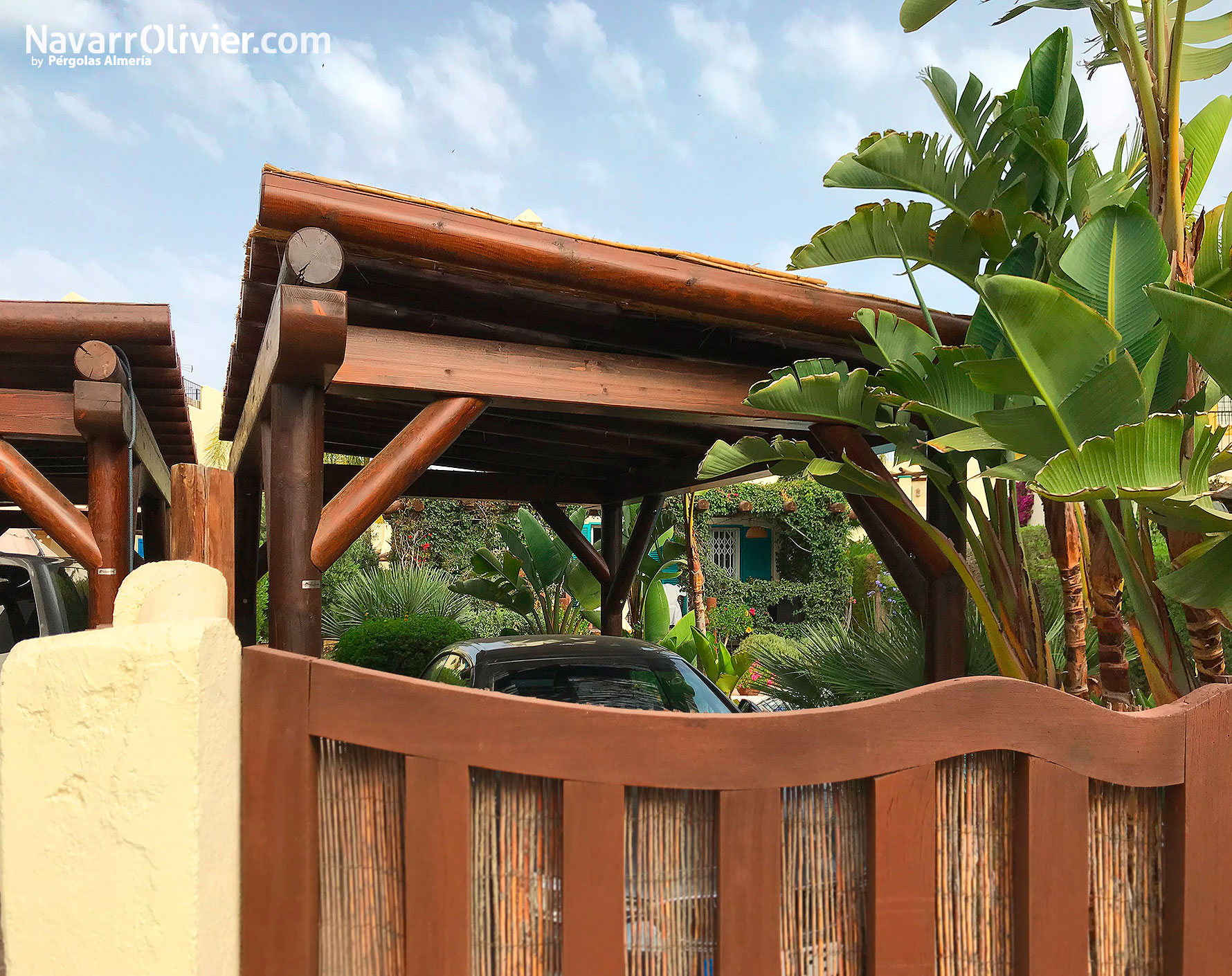 Aparcamiento cubierto de estilo rústico y natural formado por estructuras fabricadas en palo calibrado y madera laminada con cubierta en cañizo natural. Madera con tratamiento exterior con tinte al agua con pigmento mineral y acabado en barniz al agua a poro abierto de bajo mantenimiento.