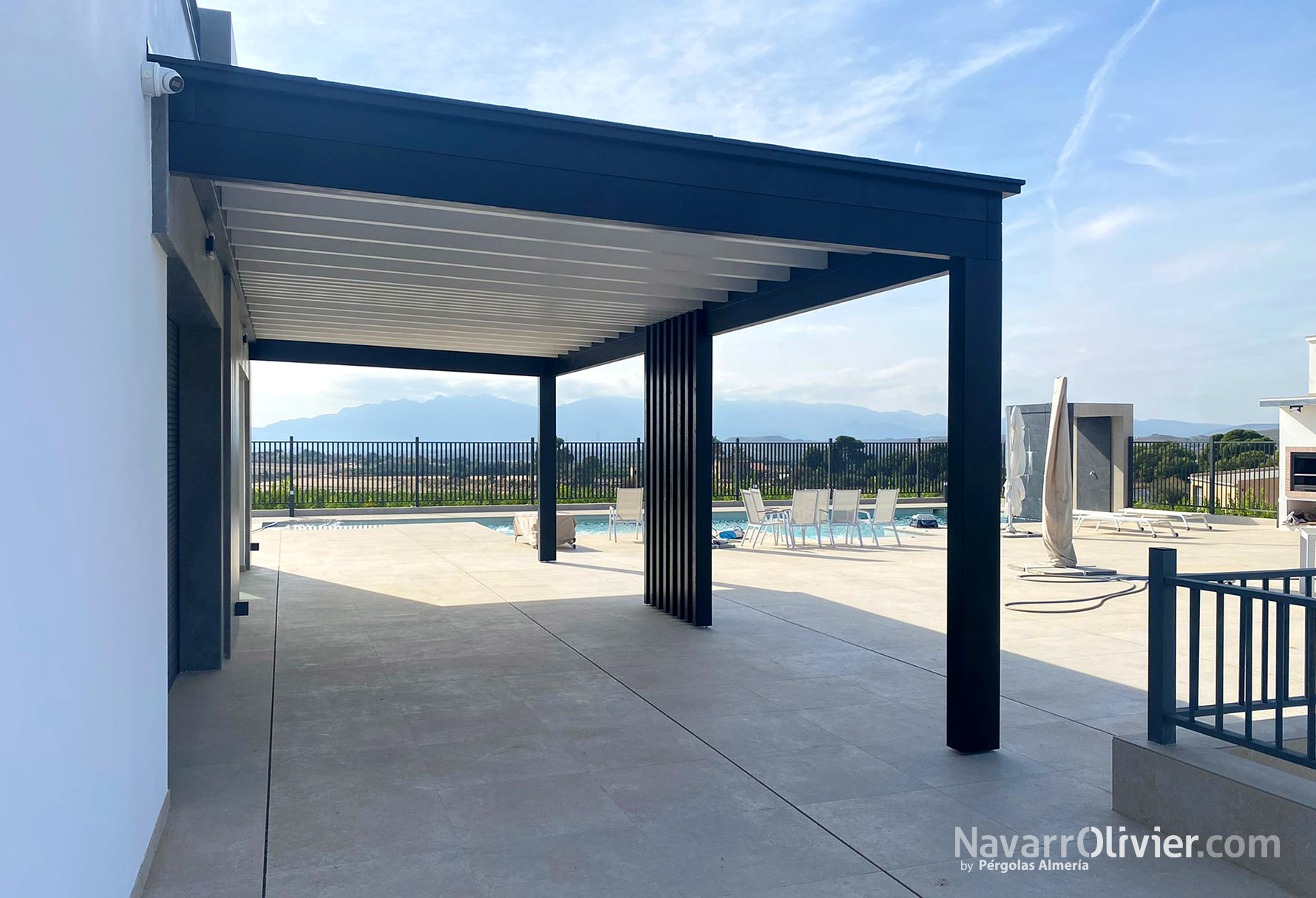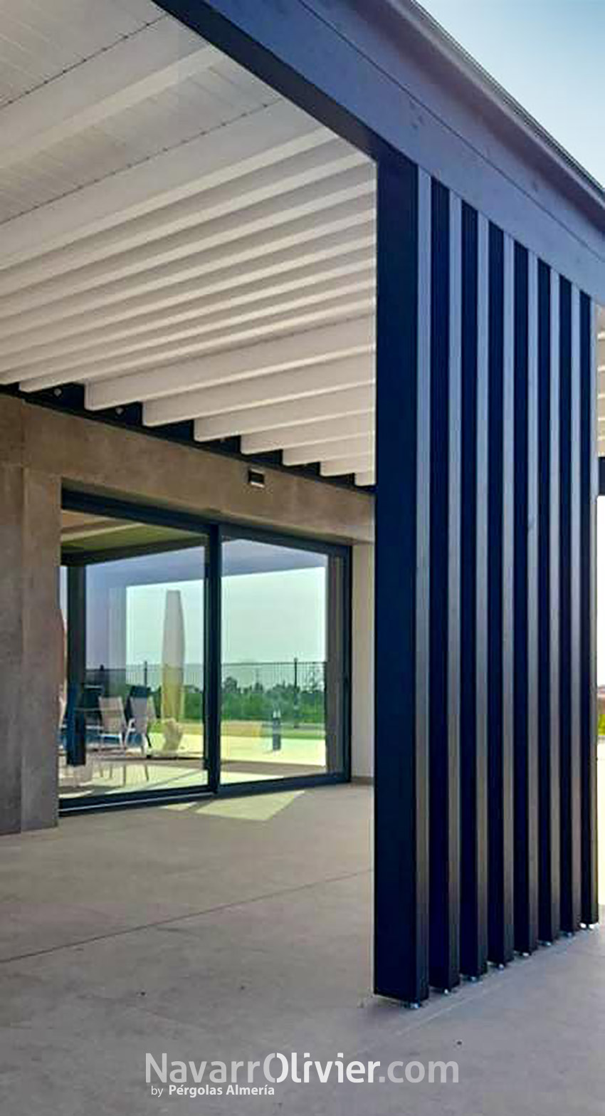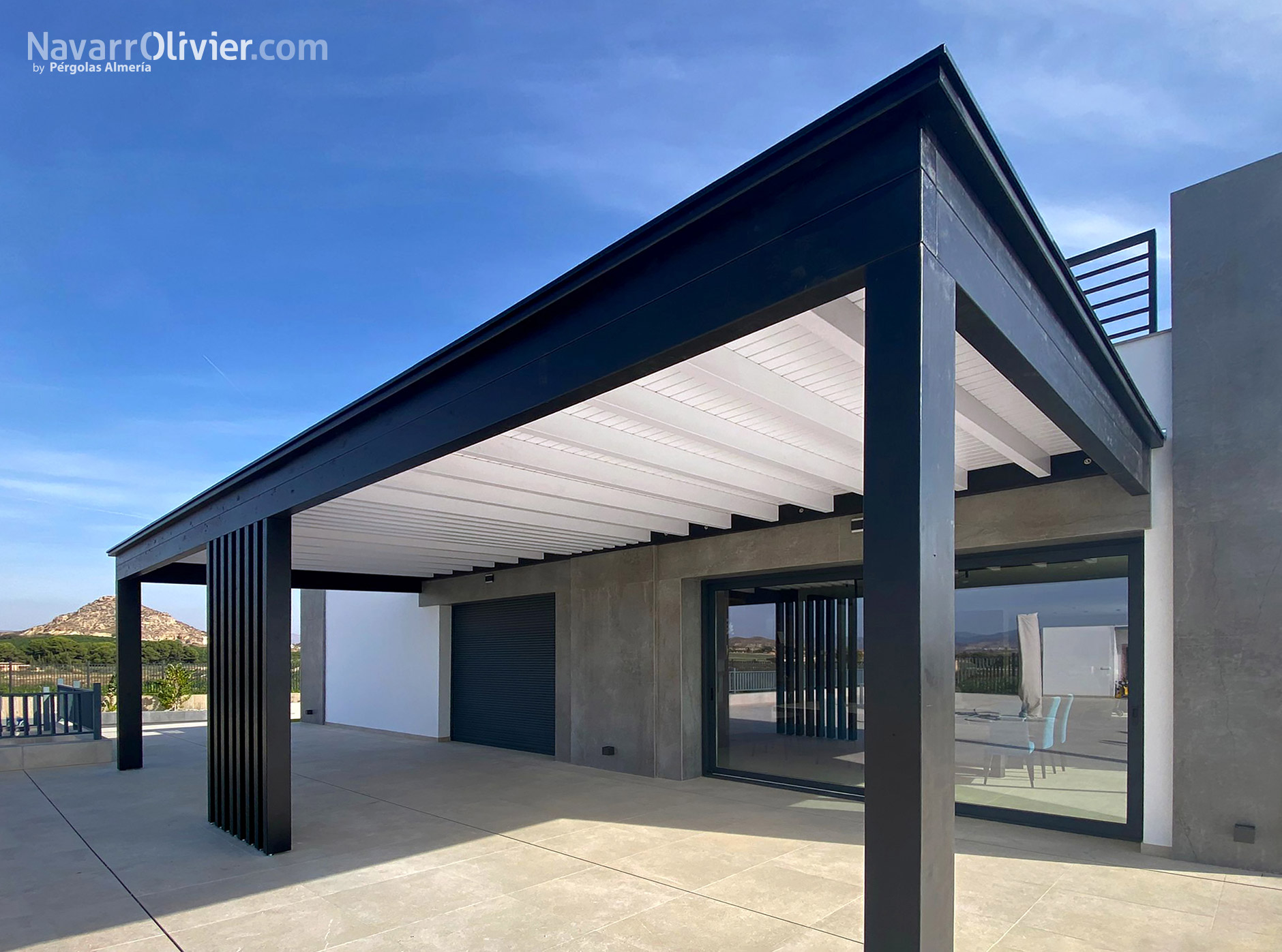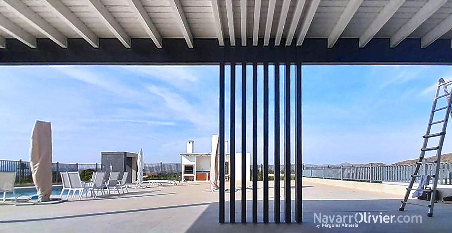 La estructura de la pérgola negra con la cubierta blanca de diseño minimalista, donde destaca el conjunto de pilares paralelos en el centro, con continuidad en los huecos del entrevigado.