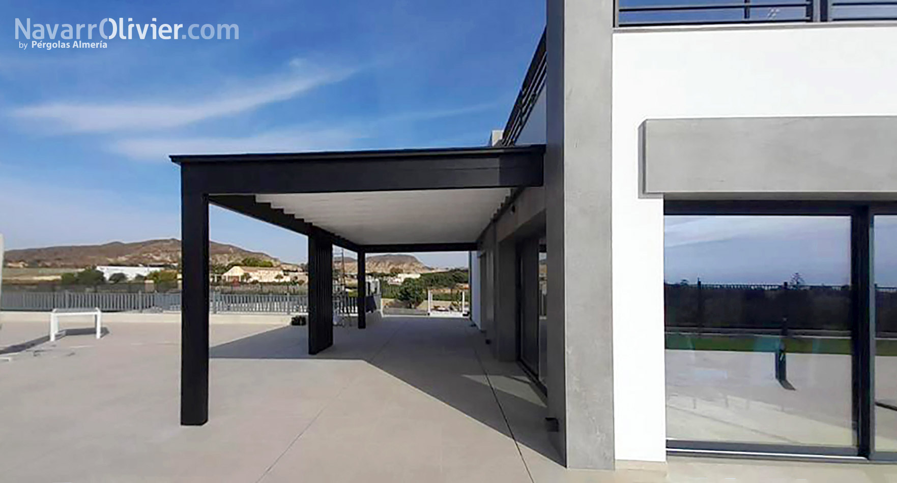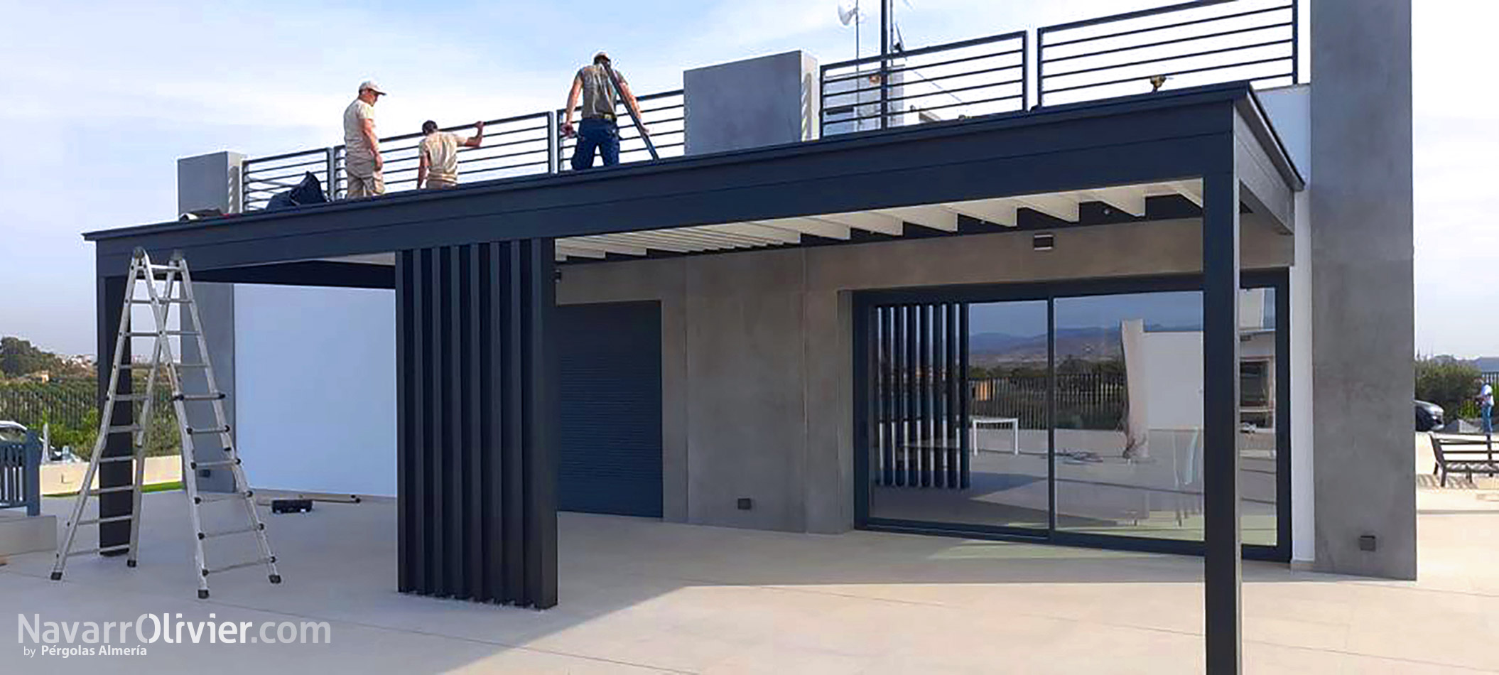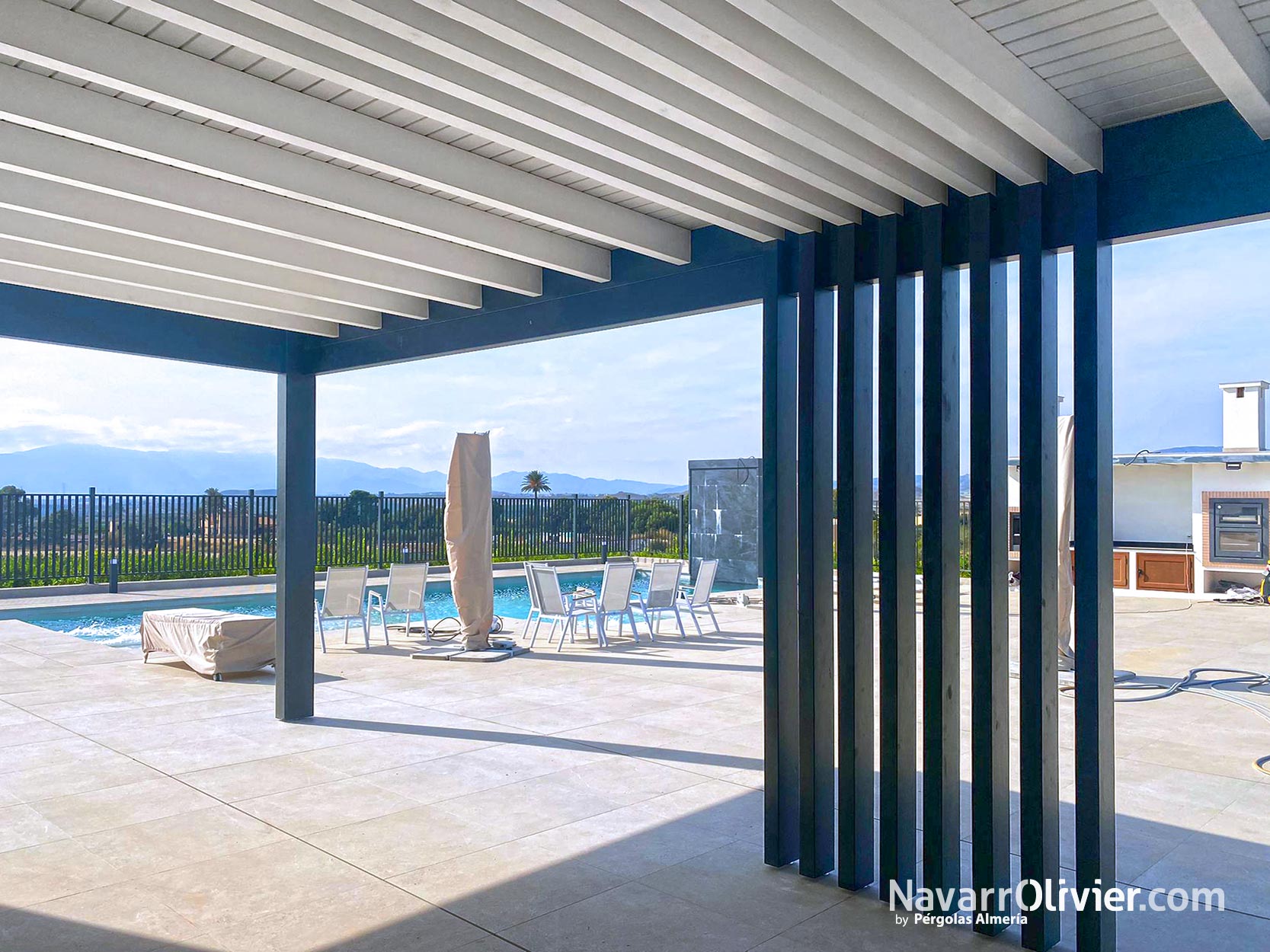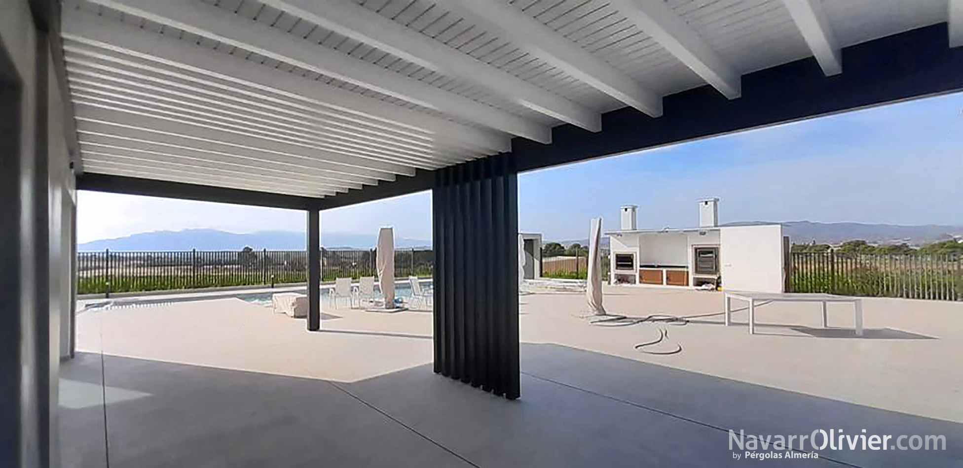 La estructura de la pérgola negra con la cubierta blanca de diseño minimalista, donde destaca el conjunto de pilares paralelos en el centro, con continuidad en los huecos del entrevigado.