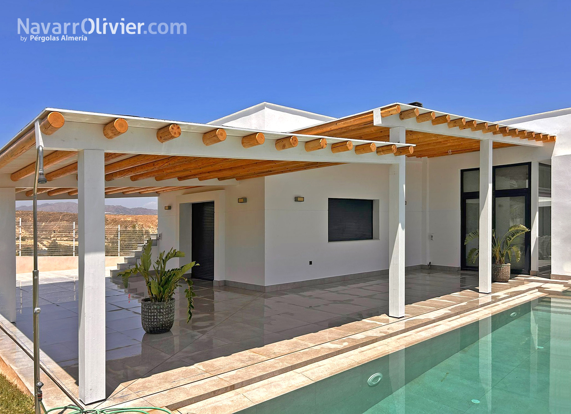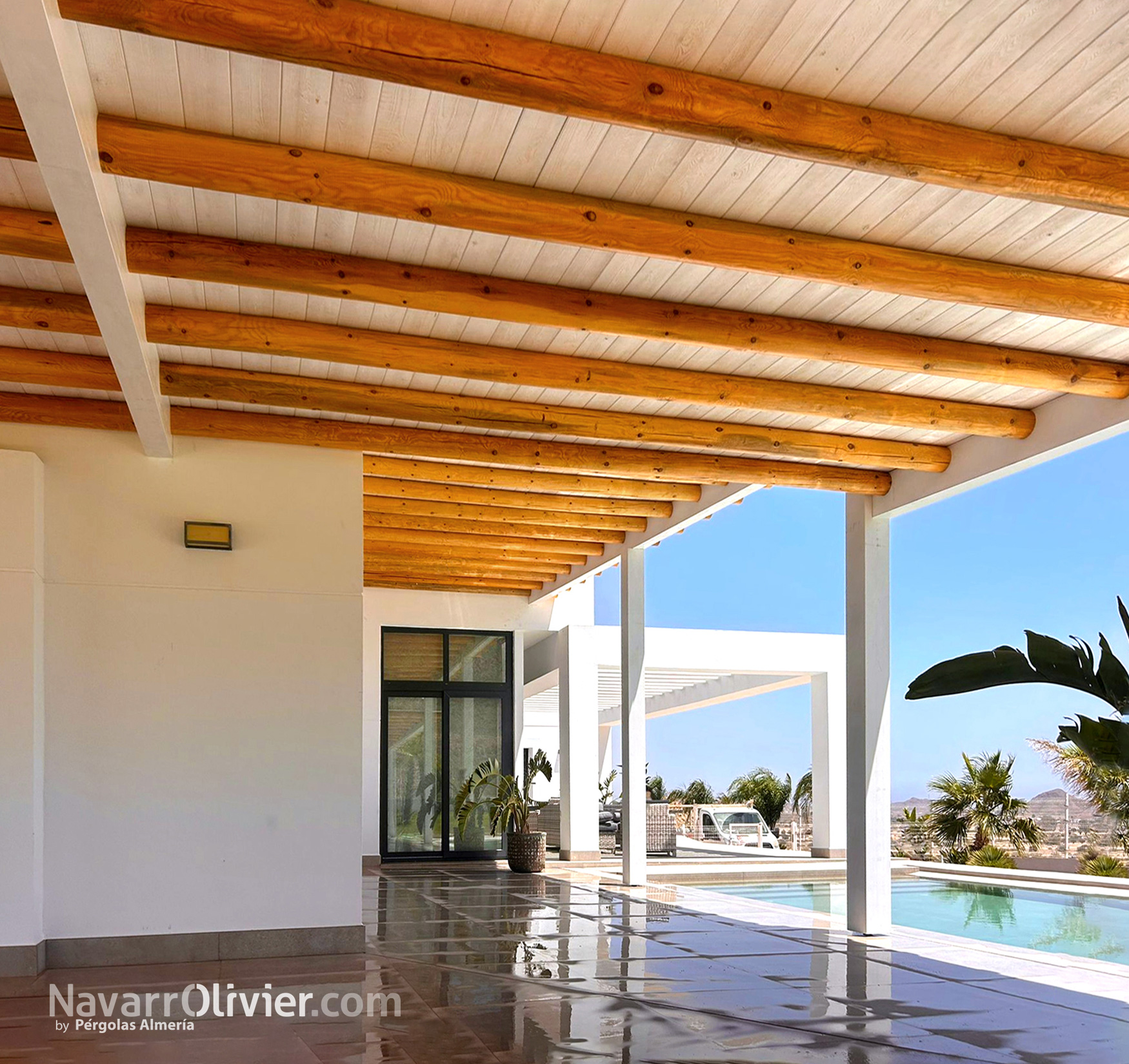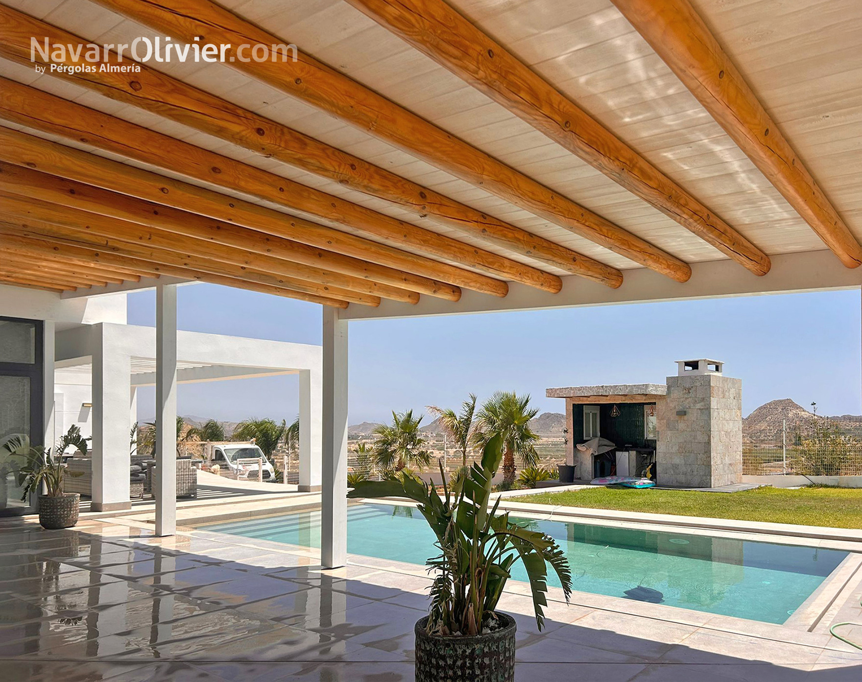 Pérgola de madera estructural y tronco calibrado para vivienda unifamiliar con piscina en Vera, Almería.