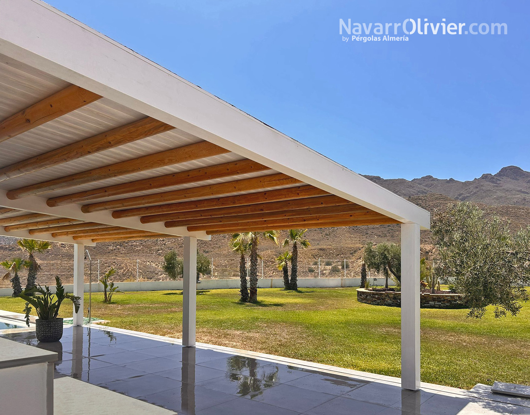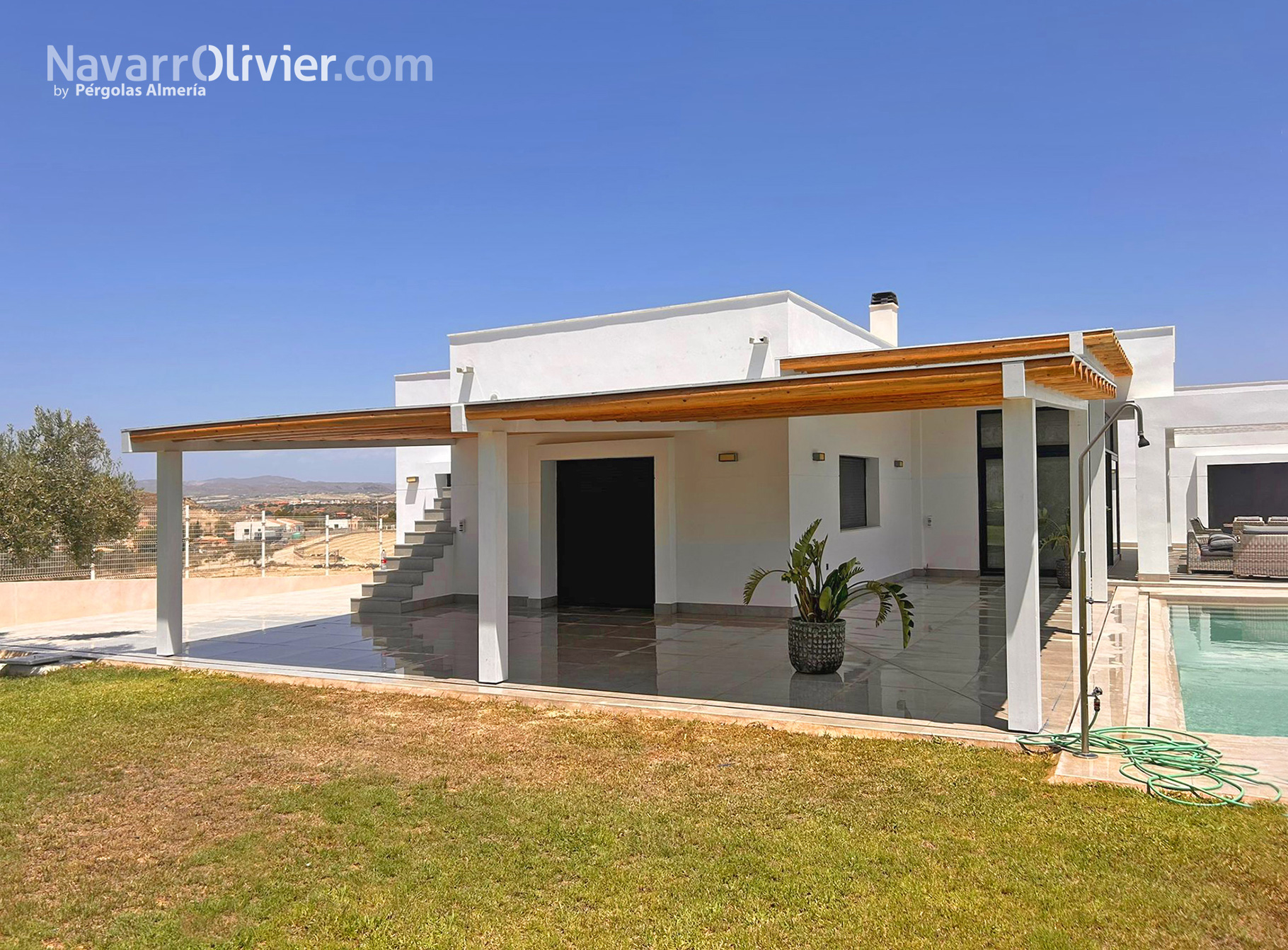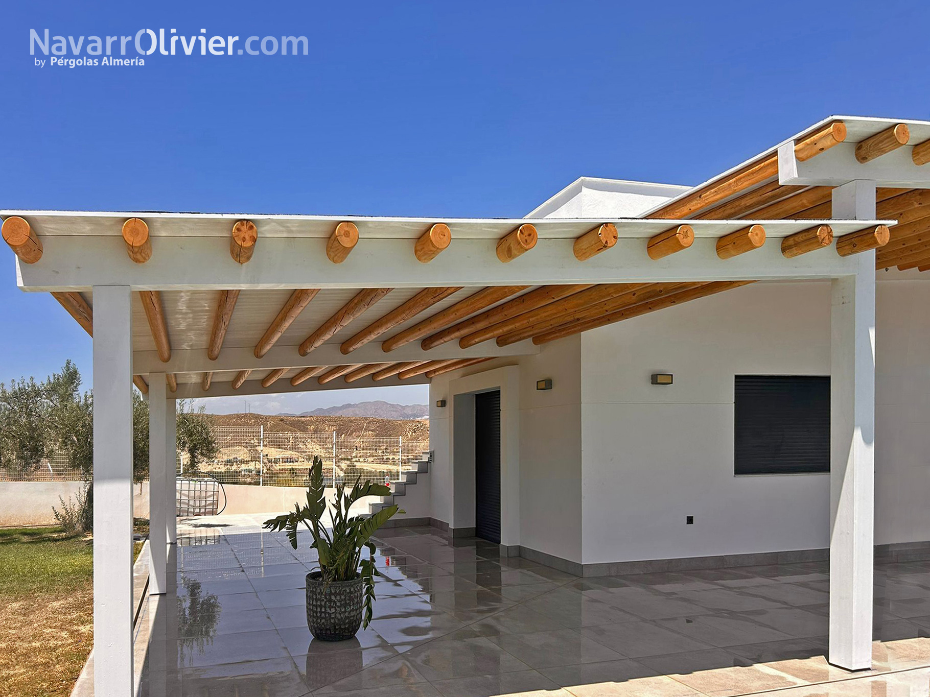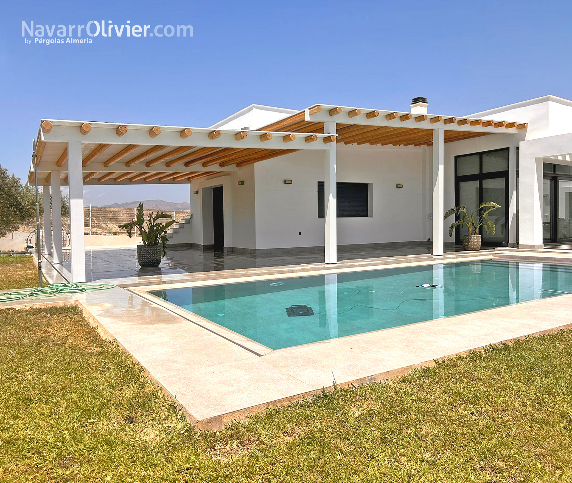 Pérgola de madera estructural y tronco calibrado para vivienda unifamiliar con piscina en Vera, Almería.