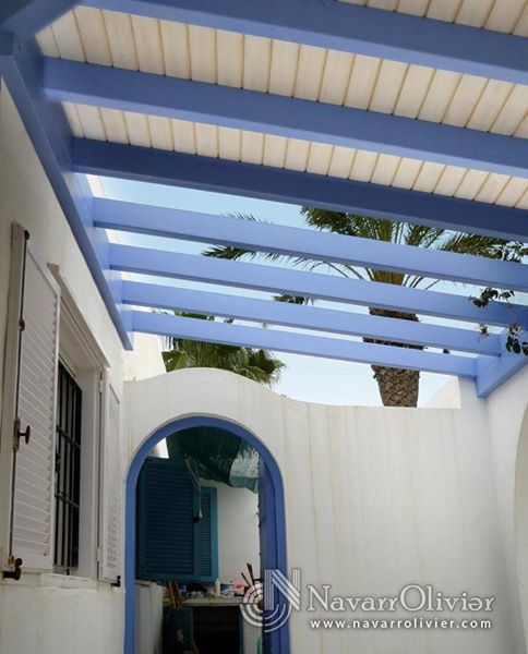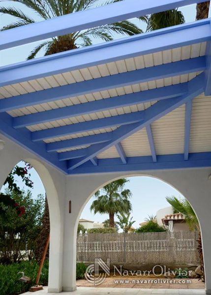 Estructura adosada en madera laminada encolada y madera maciza con cubierta en tablero fenólico ranurado. El diseño del porche se integra en la casa de estilo mediterráneo manteniendo la estética y paleta de colores predominantes en la localidad de Mojácar, Almería. La techumbre cubre la zona perimetral de la vivienda dejando espacios donde solo están las correas para permitir el ingreso de la luz hacia las ventanas y permitir la correcta ventilación de la galería.