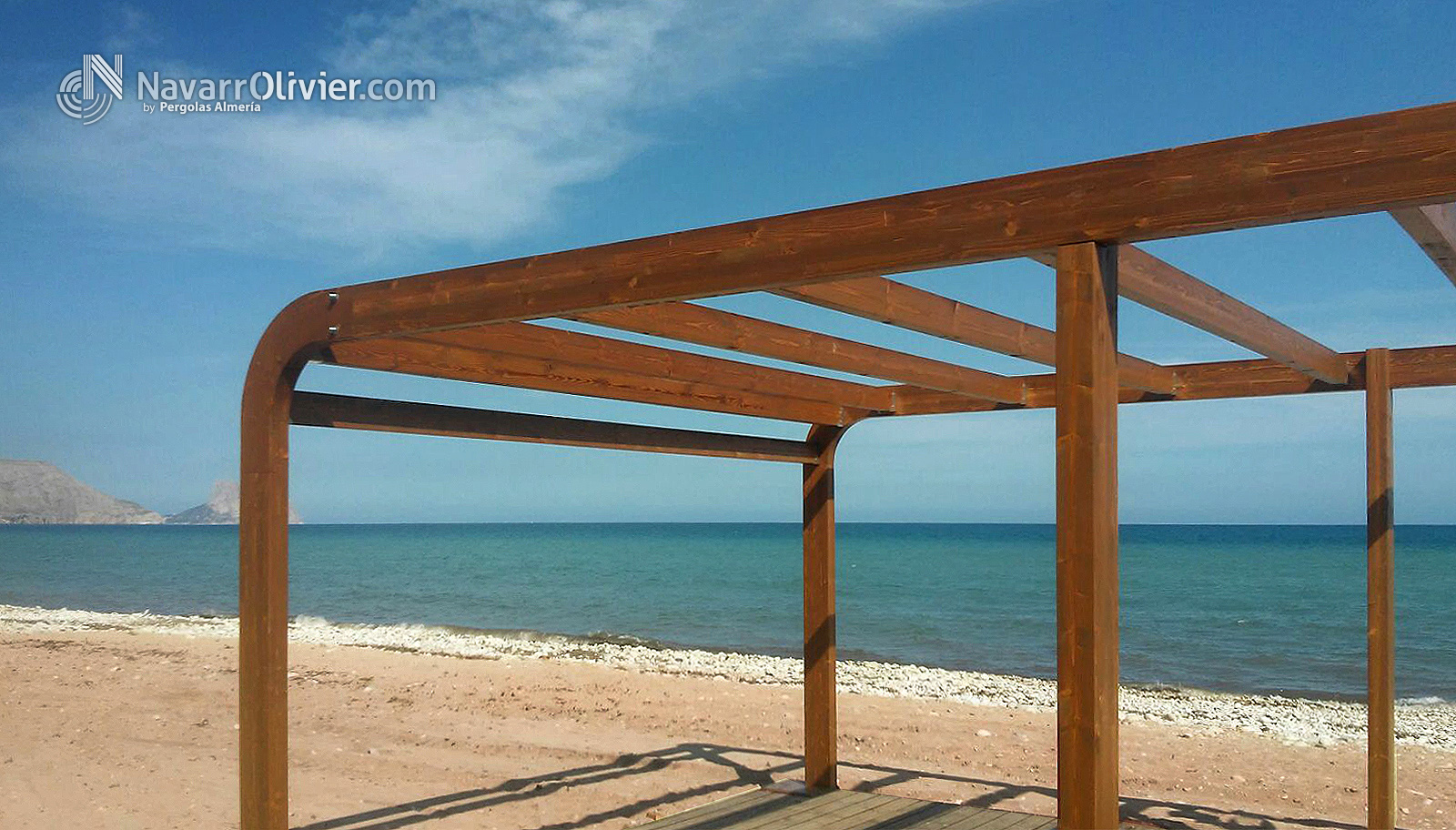 Construcción compuesta por suelo en módulos de madera ranurada tratada en autoclave. Pérgola de sombraje de diseño singular fabricada en madera laminar unida mediante anclajes y estribos metálicos galvanizados, siguiendo el estilo del chiringuito, cubierta en cañizo natural.