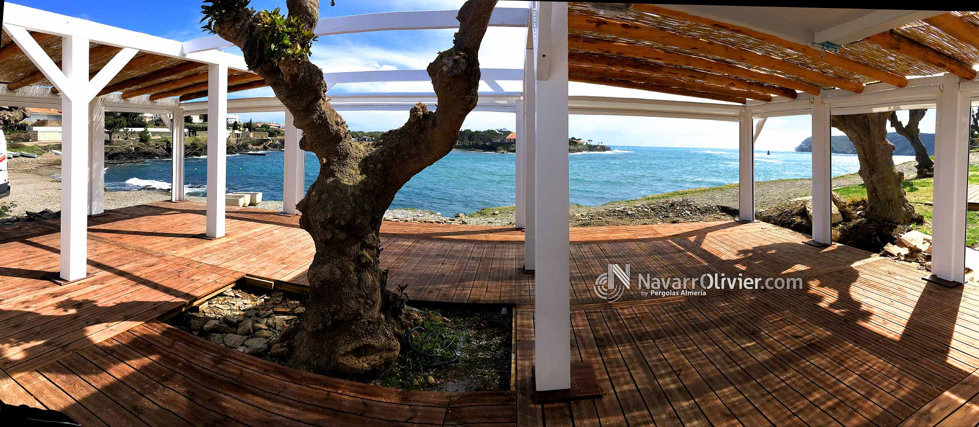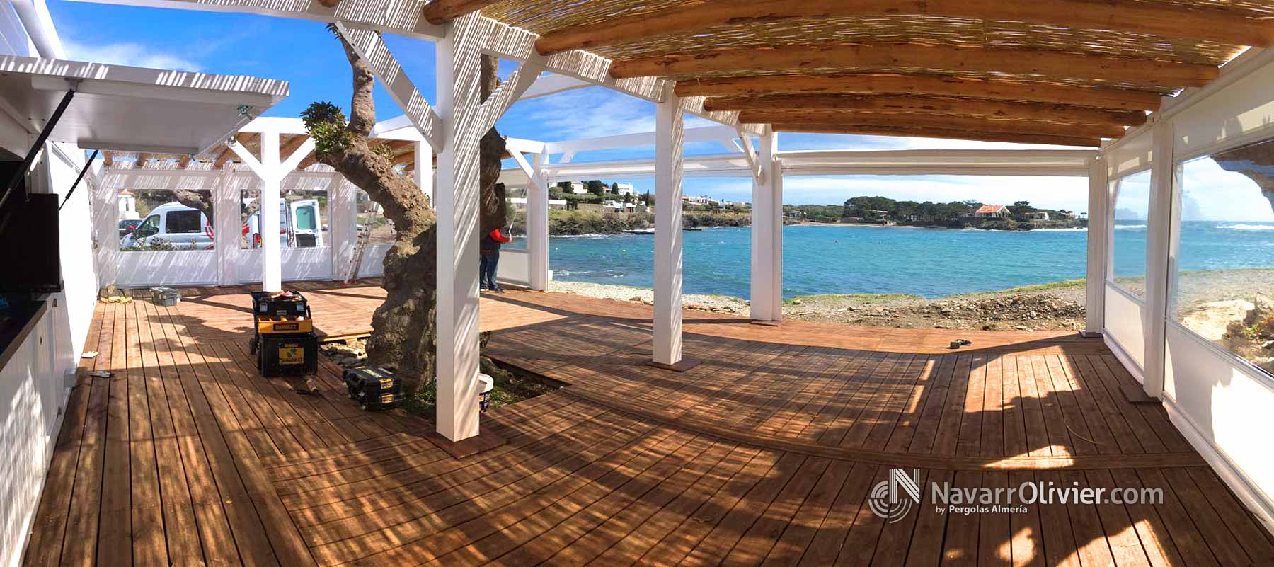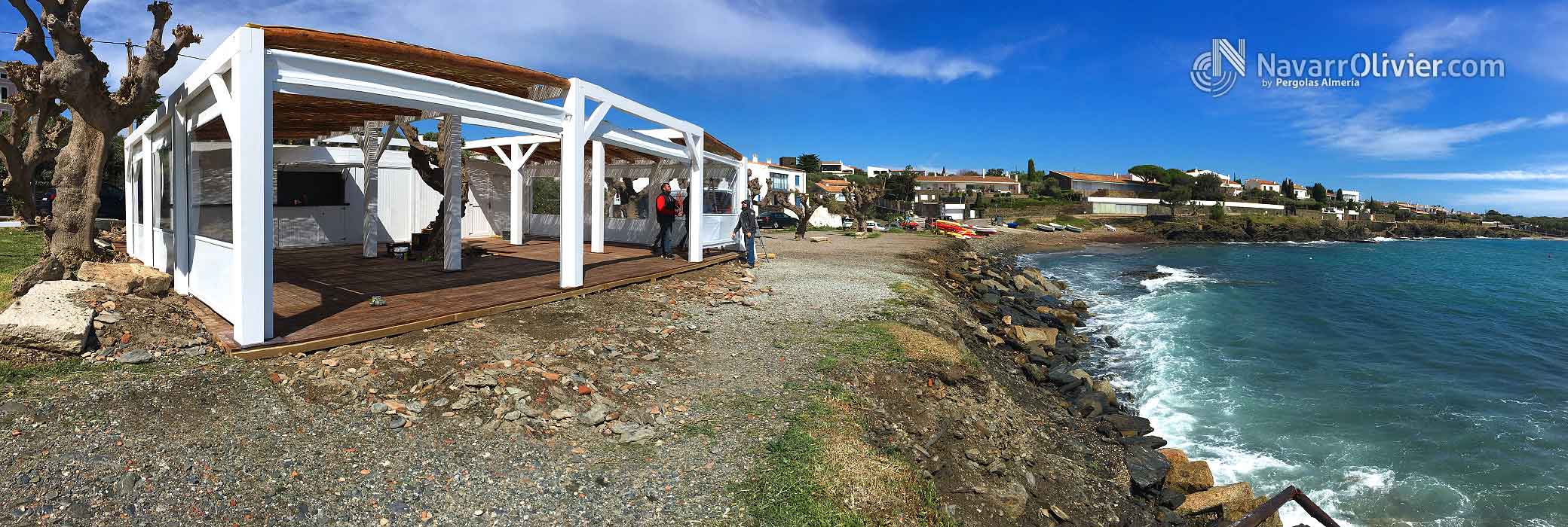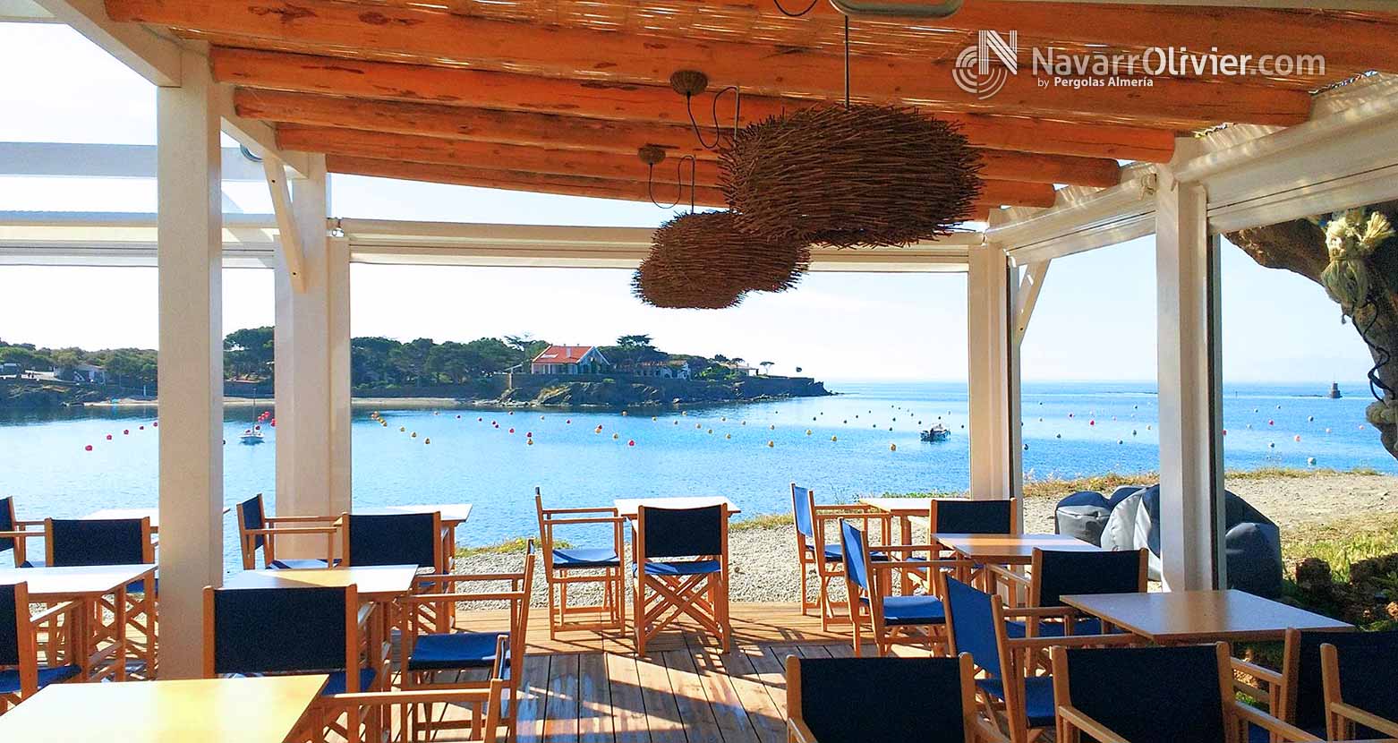 Pérgola desmontable para instalación de temporada para Chiringuito La Sal, Cadaqués, Girona. Estructura para la terraza del establecimiento enclavada en este magnifico entorno, rodea un antiguo árbol existente. La pérgola que cubre el perímetro de la instalación esta construida en vigas de madera laminada encolada para exterior y palo redondo con cubierta parcial en mimbre natural. La terraza cuenta con un cerramiento mediante toldos verticales para protegerse de la brisa marina.