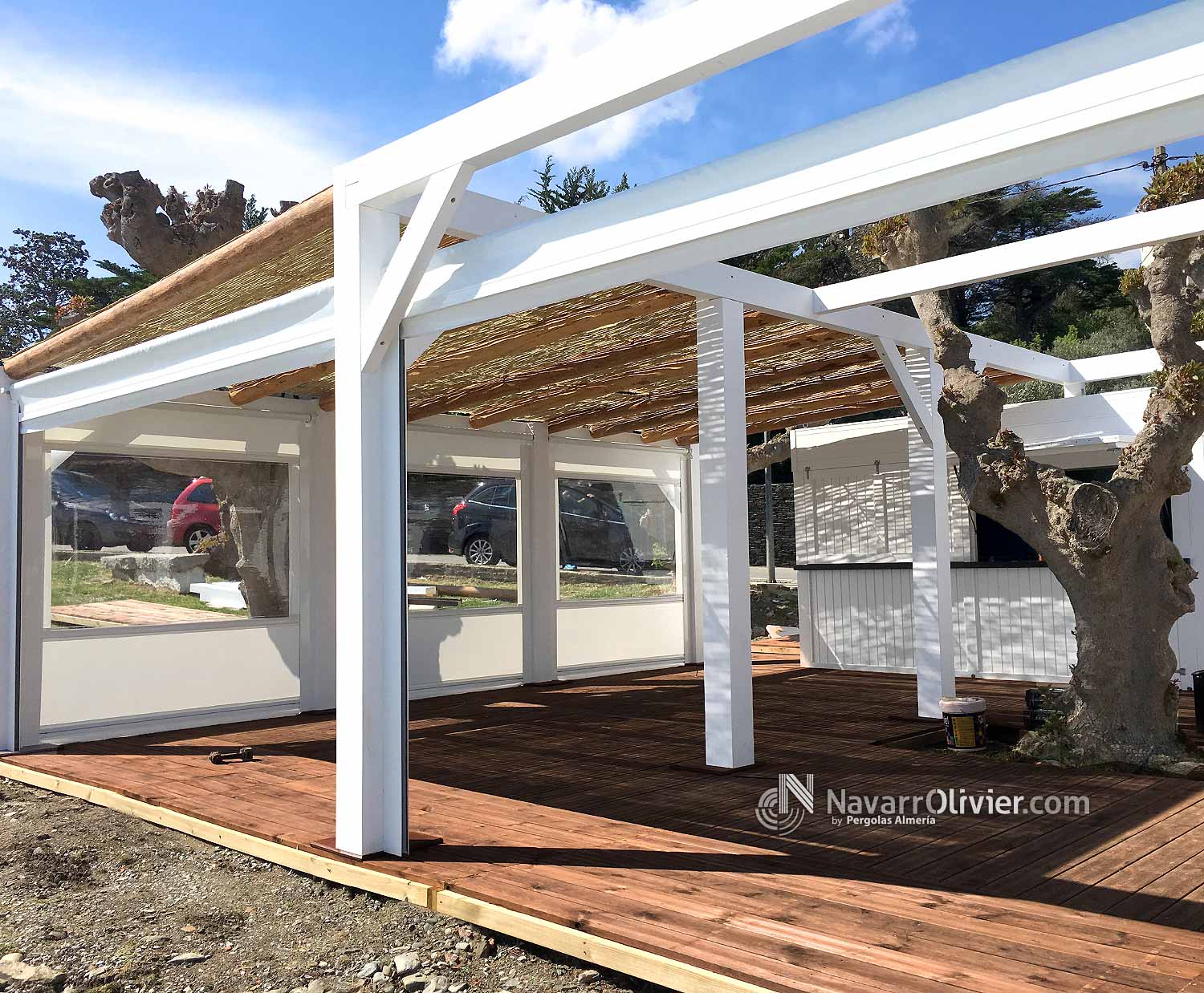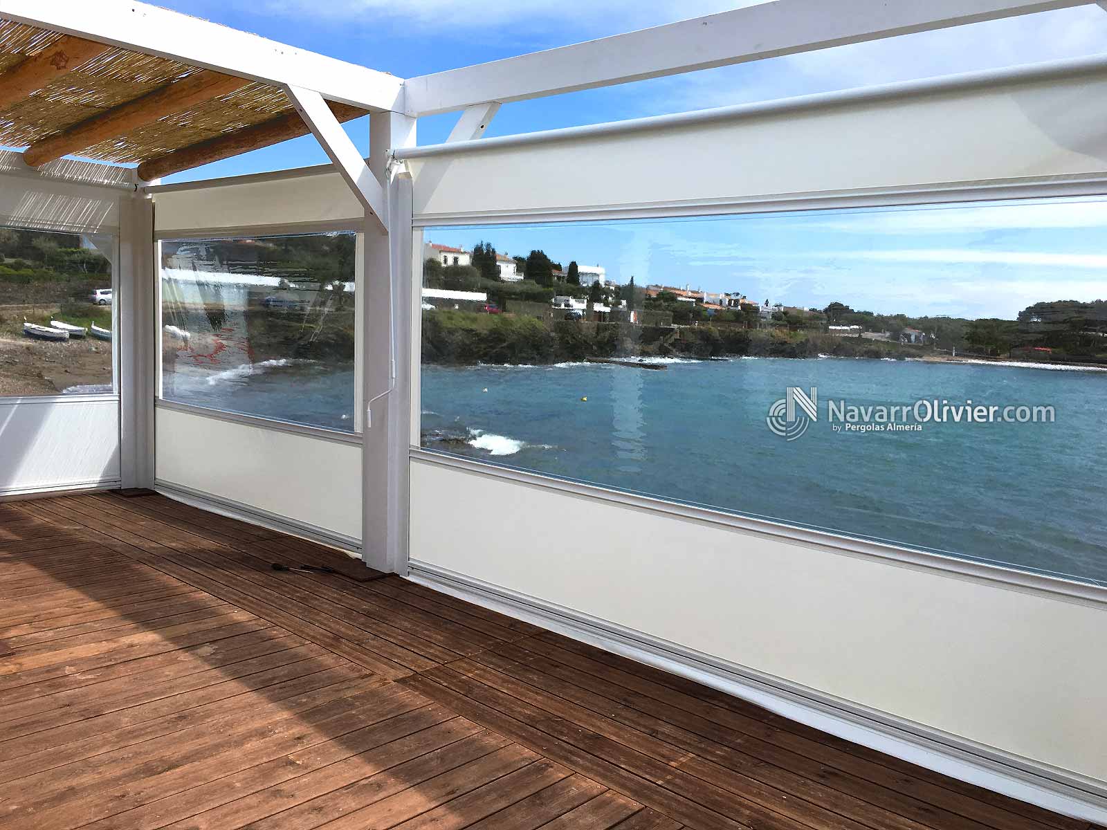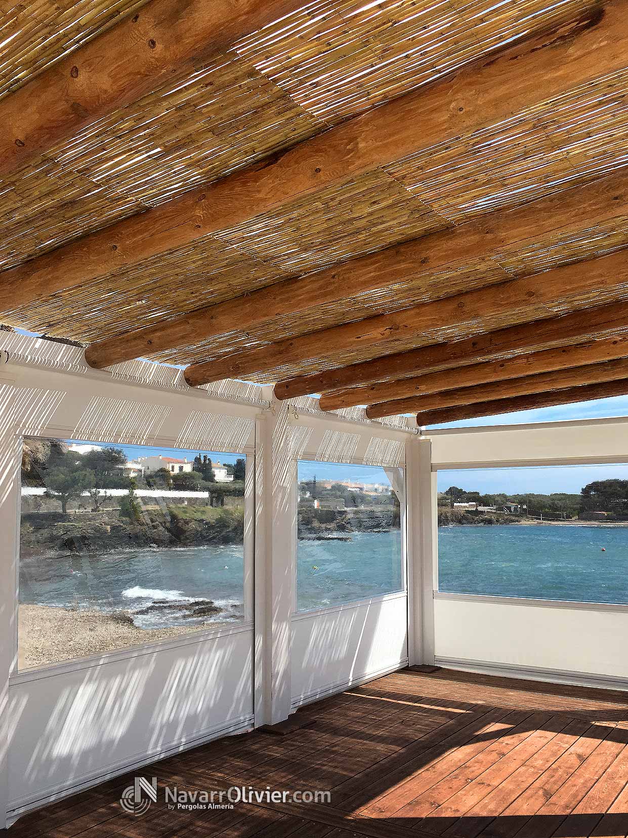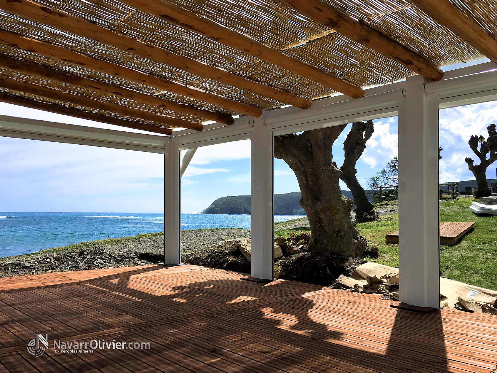 Pérgola desmontable para instalación de temporada para Chiringuito La Sal, Cadaqués, Girona. Estructura para la terraza del establecimiento enclavada en este magnifico entorno, rodea un antiguo árbol existente. La pérgola que cubre el perímetro de la instalación esta construida en vigas de madera laminada encolada para exterior y palo redondo con cubierta parcial en mimbre natural. La terraza cuenta con un cerramiento mediante toldos verticales para protegerse de la brisa marina.