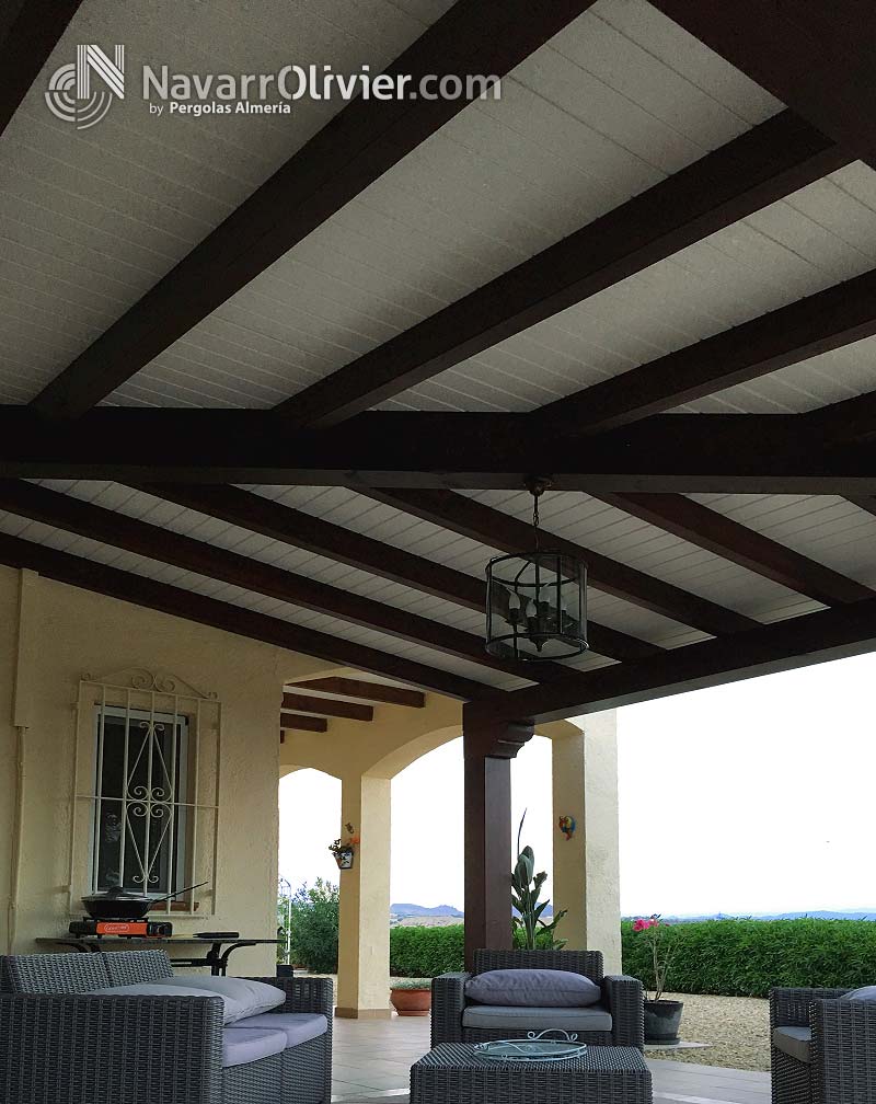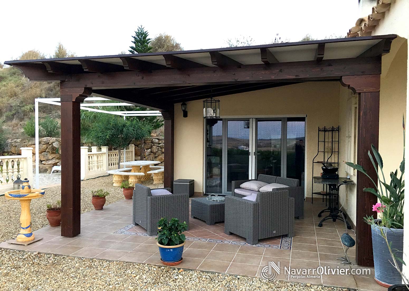 Pérgola para casa familiar en Los Gallardos, Almería. Por su ubicación geográfica este enclave andaluz goza de la cálida luz del sol mas de 300 días al año lo que permite disfrutar todo el año de estas estancias exteriores. La pérgola construida en vigas de madera laminada cuentan con capiteles de remate, la estructura principal acabada en negro contrasta con el friso construido en tablero blanco.