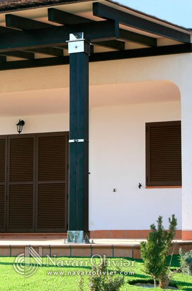 Pérgola para duplex en primera linea de playa construida en madera para exterior. Estructura adosada con pendiente a 1 agua construida en madera laminada encolada GL 24 y maciza C24 con herrajes en acero inoxidable de inspiración marina. Construcción minimalista acabada en barnices de base acuosa y poro abierto en color wengue para la estructura y blanco para el friso de la cubierta. Impermeabilización en tela asfáltica con acabado decorativo exterior en brezo natural nacional. Porche en madera y acero para vivienda particular en urbanización Mar de Pulpí, San Juan de los Terreros, Pulpí, Almería.