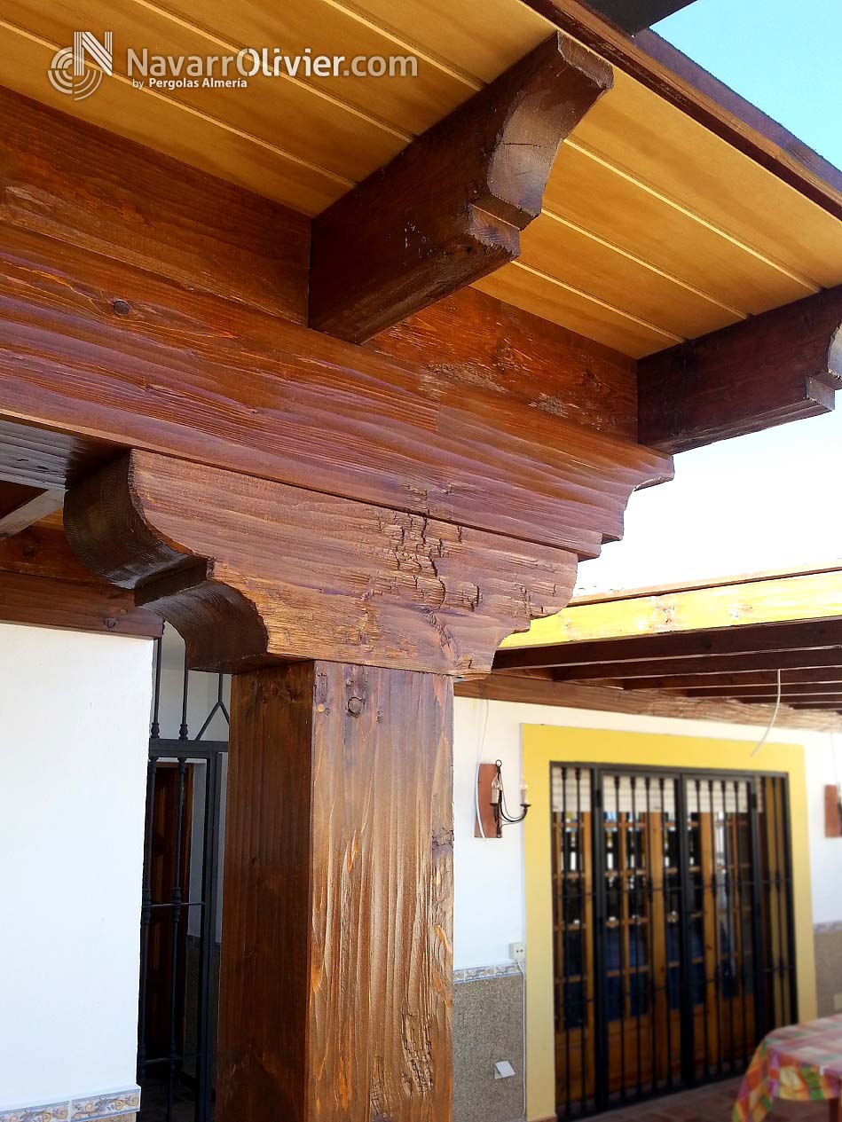Construcción de 2 pérgolas de madera para exterior. Fabricación y montaje de porches en vigas de madera laminada y madera maciza cepillada estilo rústico acabada en barniz satinado. Estructura con pilares rematados por capitel, friso en tablero fenólico ranurado, las construcciones tienen por finalidad reducir las horas de exposición solar de las habitaciones de la vivienda de uso vacacional. Reforma de vivienda con estructuras de madera en Palomares, Almería.