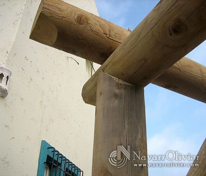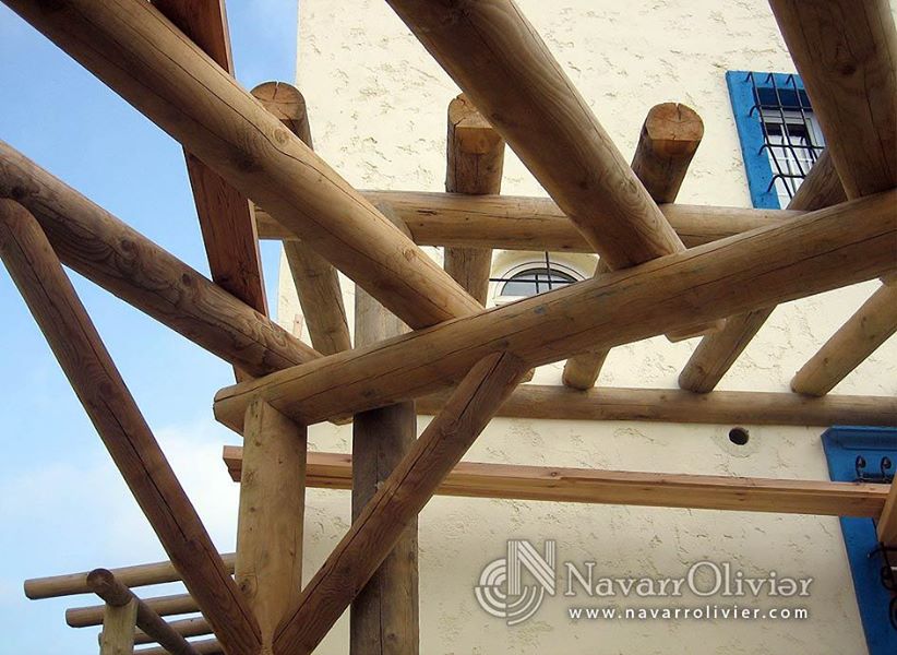 Pérgola adosada para vivienda de segunda residencia, construida en tronco de madera calibrado.