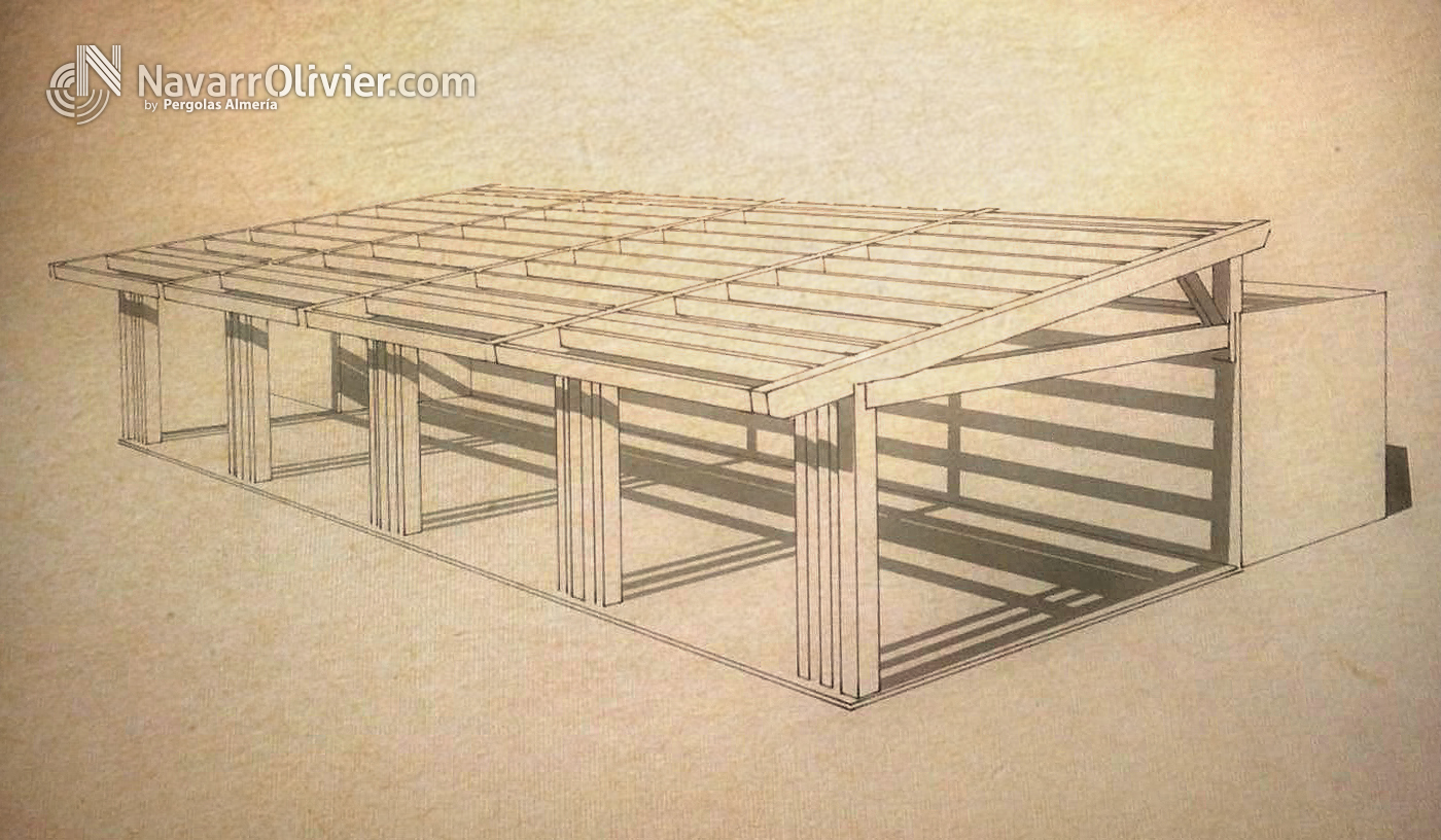 La pérgola adosada con pendiente a un agua se farbrico en vigas de madera laminada encolada con machihembrado acabado en decape blanco, con acabado exterior en brezo natural decorativo.