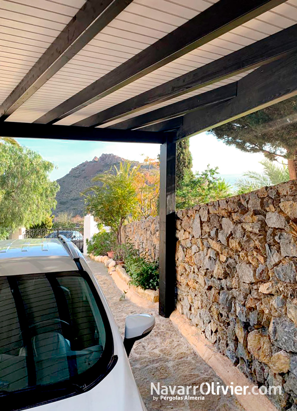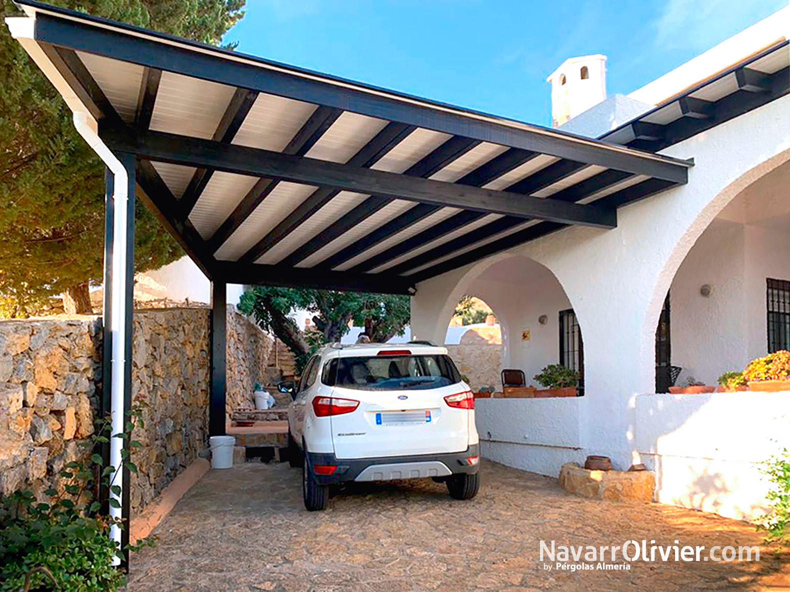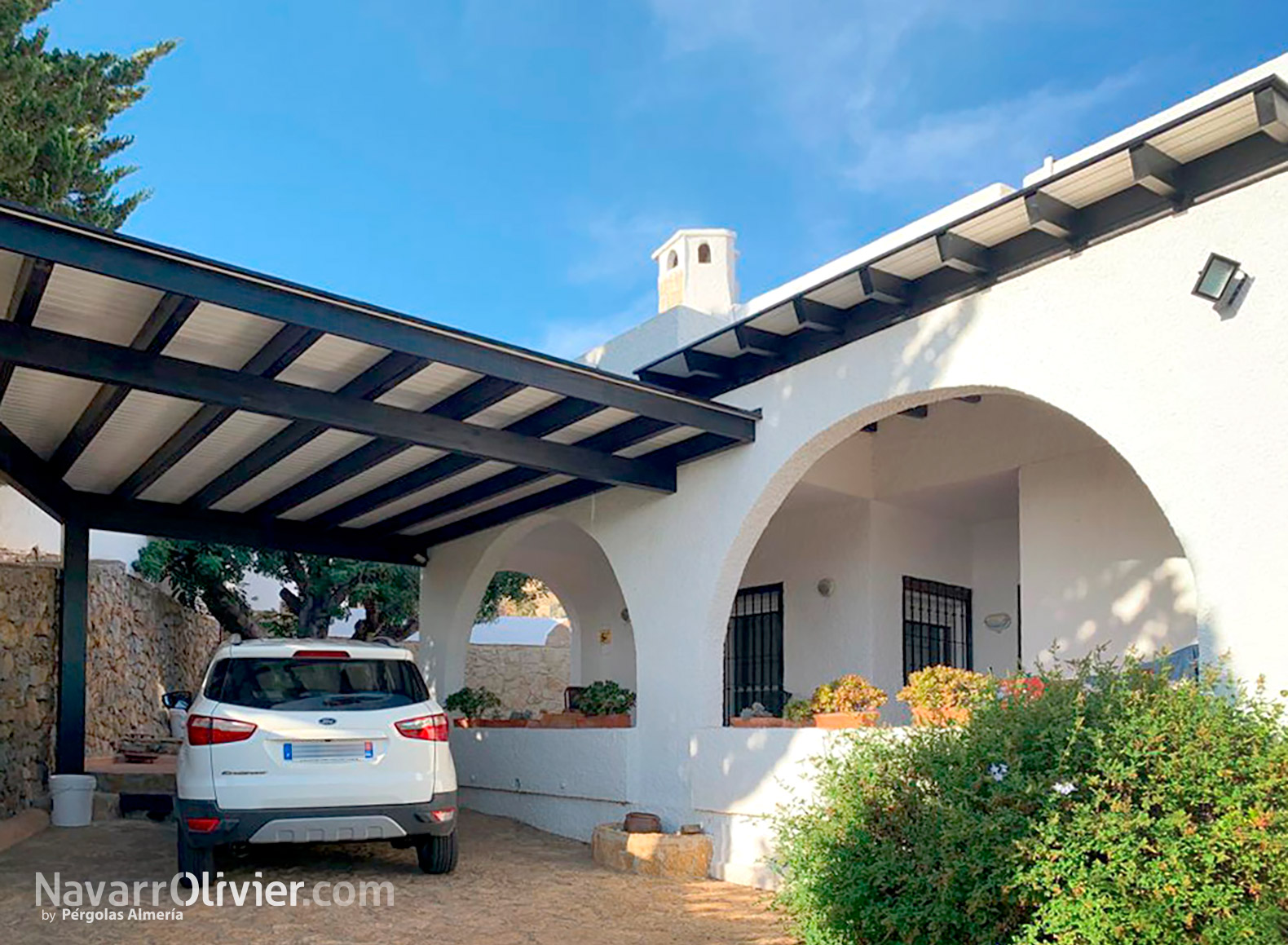 En la zona lateral de la casa se construyo una cubierta adosada trapezoidal, siguiendo la forma del terreno, que sirve de refugio o aparcamiento para vehículos.