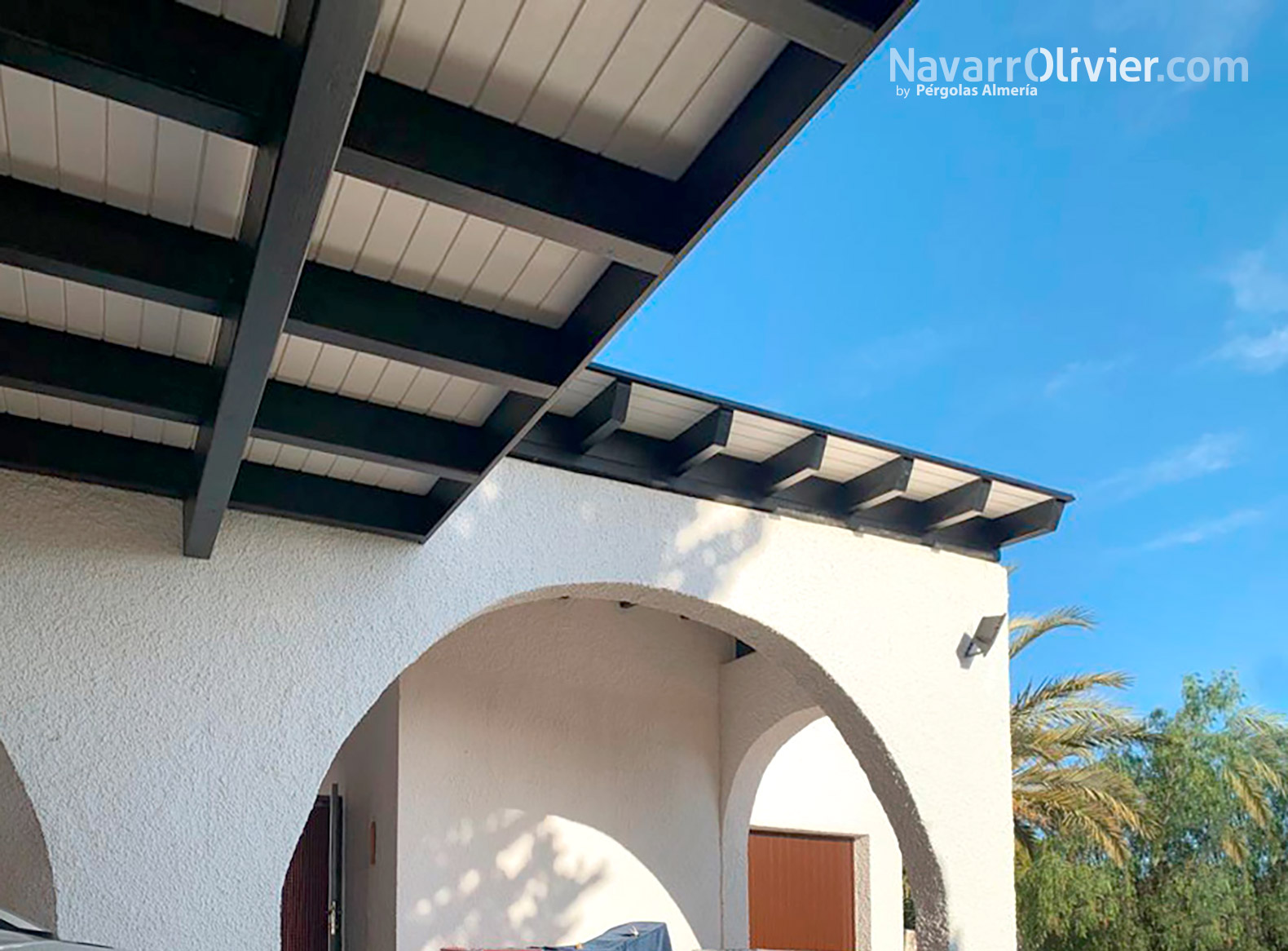 La construcción fabricada en madera laminada descansa sobre pilares de madera laminada de 20 x 20 cm, con cubierta, al igual que la del porche, acabado en blanco para aportar luminosidad.