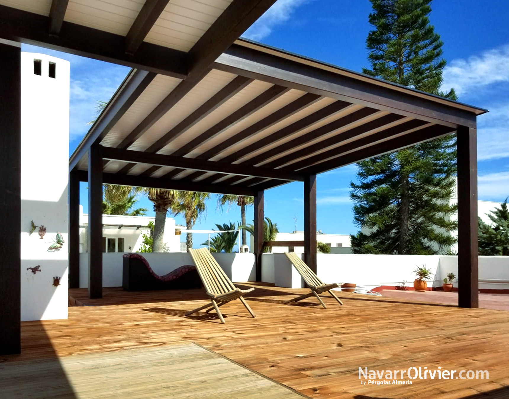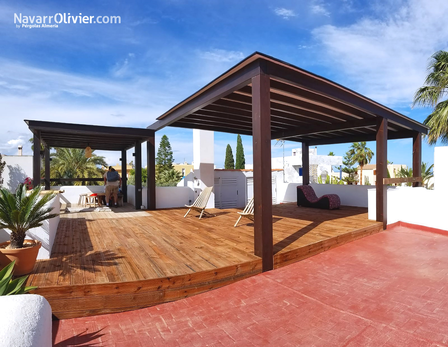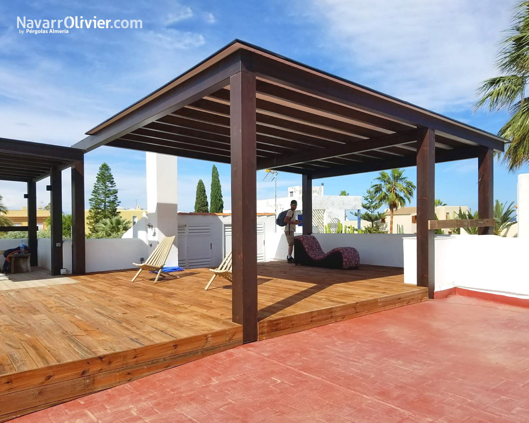 Para poner en valor el espacio irregular de la azotea se construyeron 2 pérgolas de madera cuya estructura principal y pilares se fabricaron en madera laminada GL24 que les aportan la solidez estructural que, en conjunto con los cabios de madera maciza y la cubierta de tablero fenólico ranurado crean un espacio estético, durable y de bajo mantenimiento.