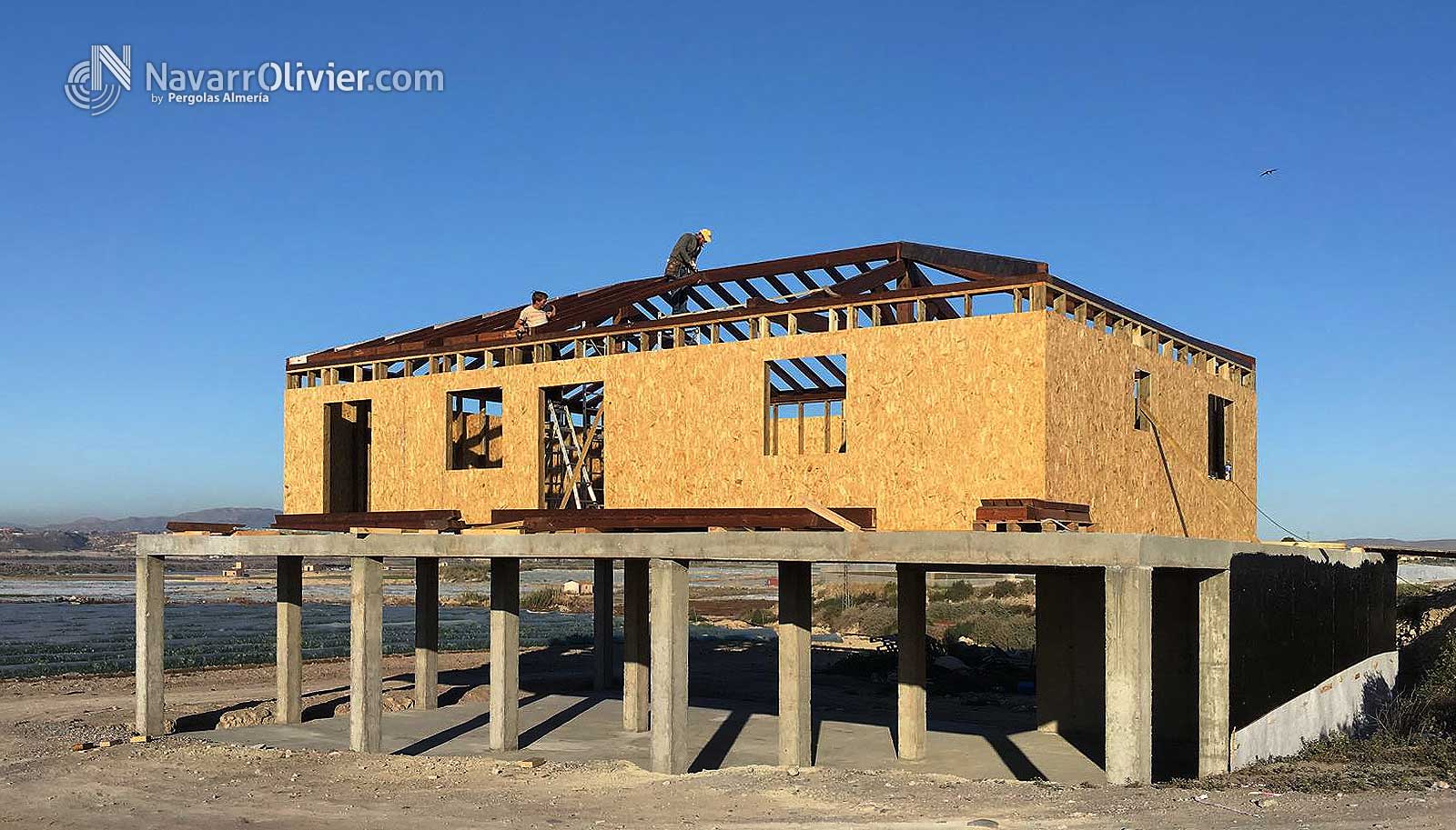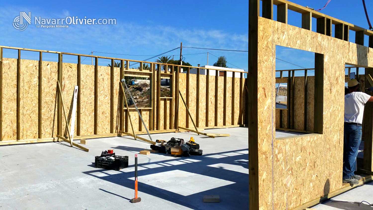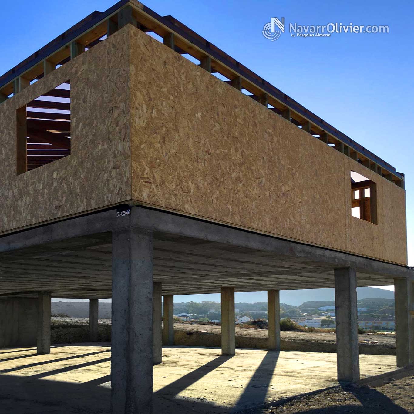 Construcción de vivienda unifamiliar de 180 m2 sobre forjado de obra. La edificación construida en entramado ligero con muros en panel osb con 14 cm de aislación en lana de roca barrera de vapor, para evitar la condensación, vacio técnico para cañerías e instalación eléctrica acabado en al interior en pladur. El exterior de los muros lleva un recubrimiento aislante de paneles de poliuretano, con malla de armadura en fibra de vidrio y mortero acrílico de acabado: SATE (Sistema de Aislamiento Térmico para Exterior).