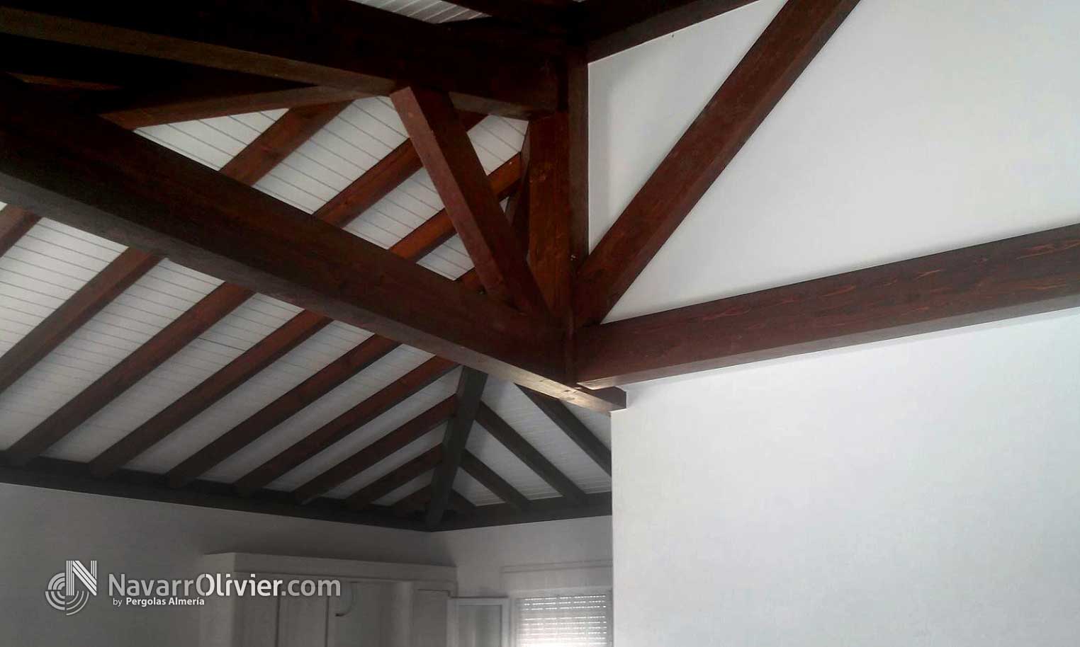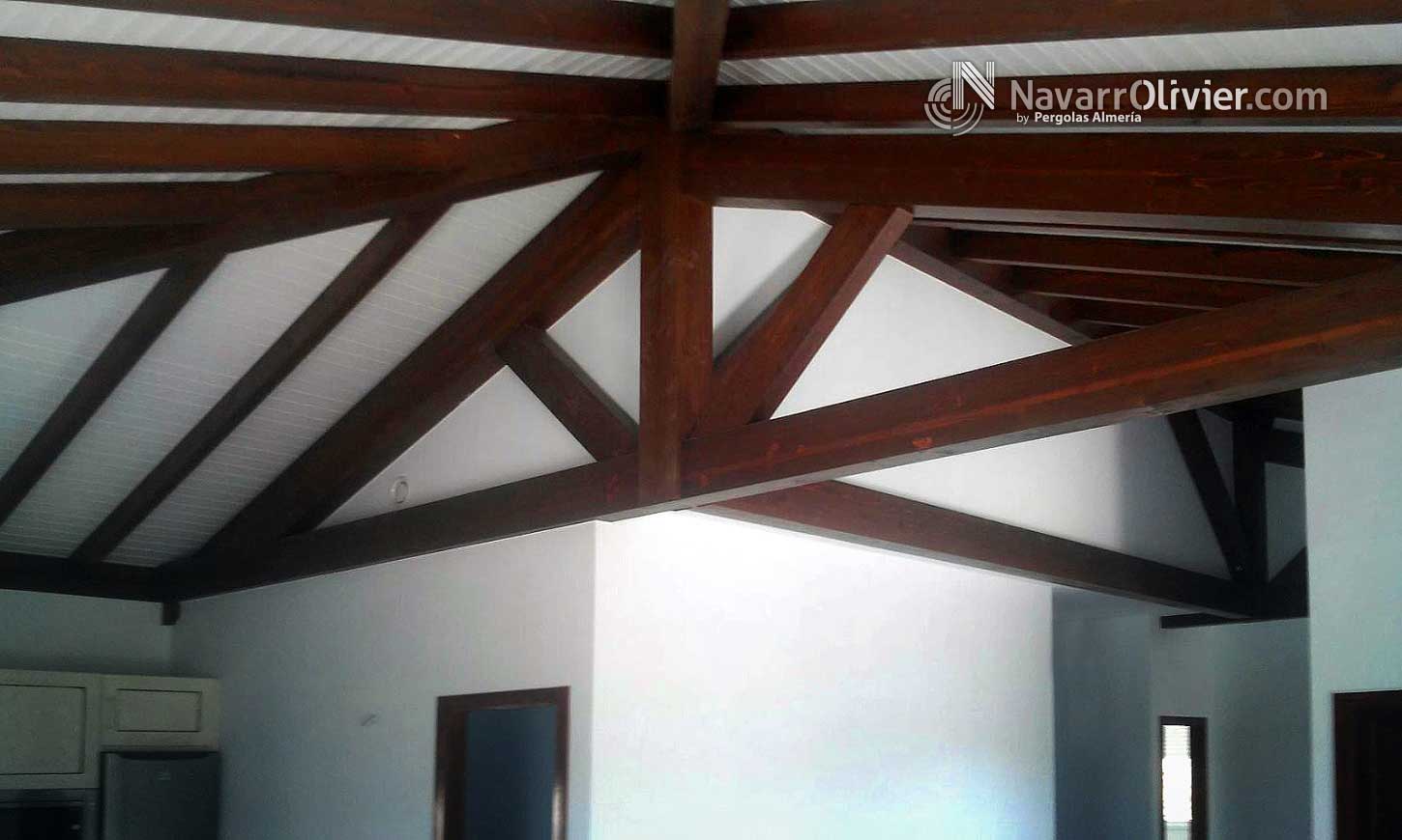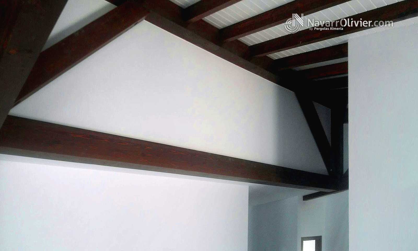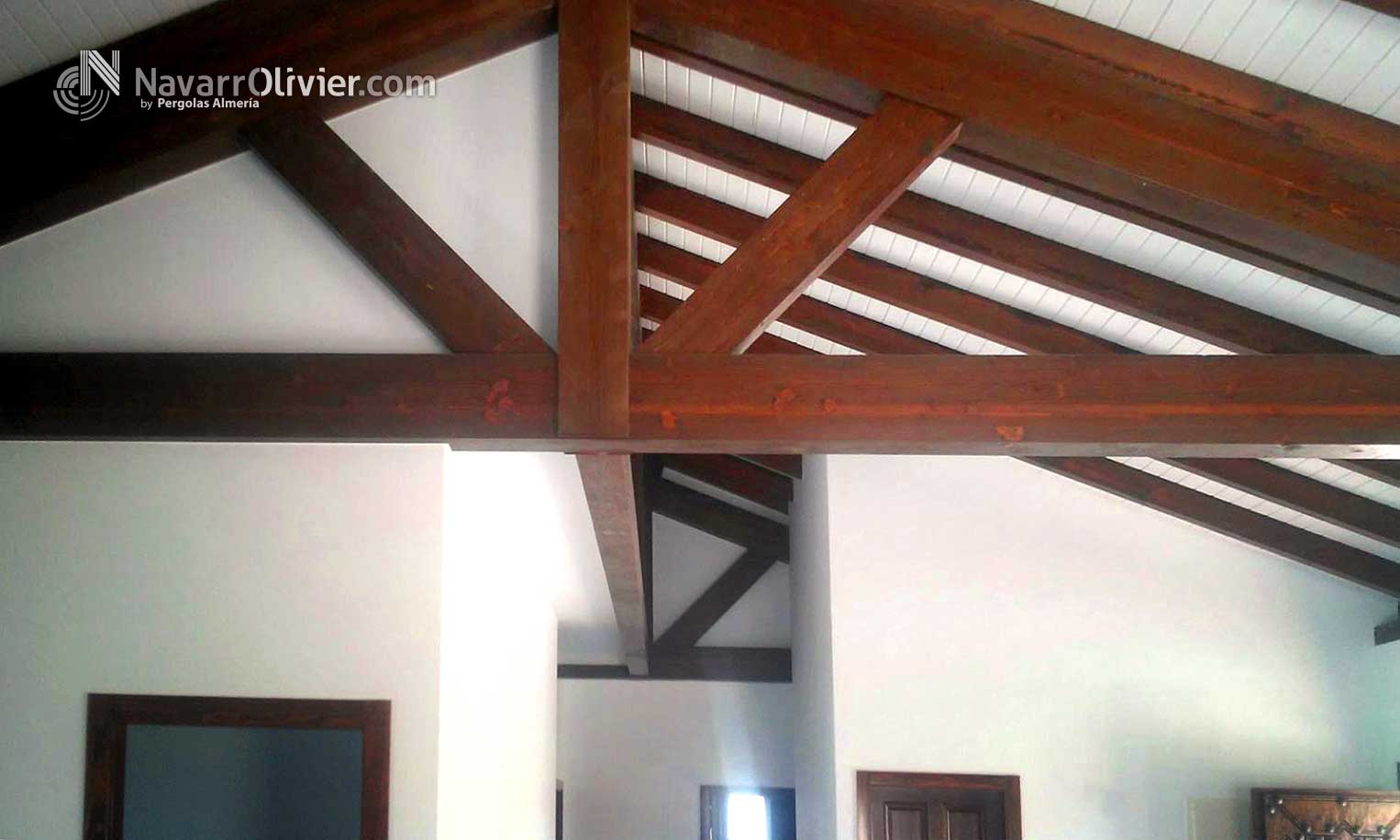 La estructura principal de la cubierta está construida en vigas de madera laminar GL 24 con correas en madera maciza C24, panel sandwich con machihembrado visto, tela Tyvek y teja envejecida ventilada.