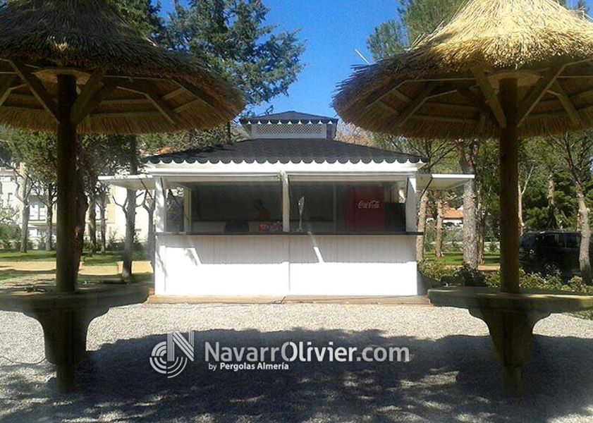 El chiringuito de madera a 4 aguas modelo Mojácar es sin duda una de las construcciones de temporada mas popular en las playas españolas. Las unidades de 20 m2 se componen de 2 volúmenes transportables equipadas con instalación eléctrica, listas para situar con un medio de elevación en cualquier emplazamiento. Chiringuitos con grandes posibilidades de configuración y acabados personalizables.