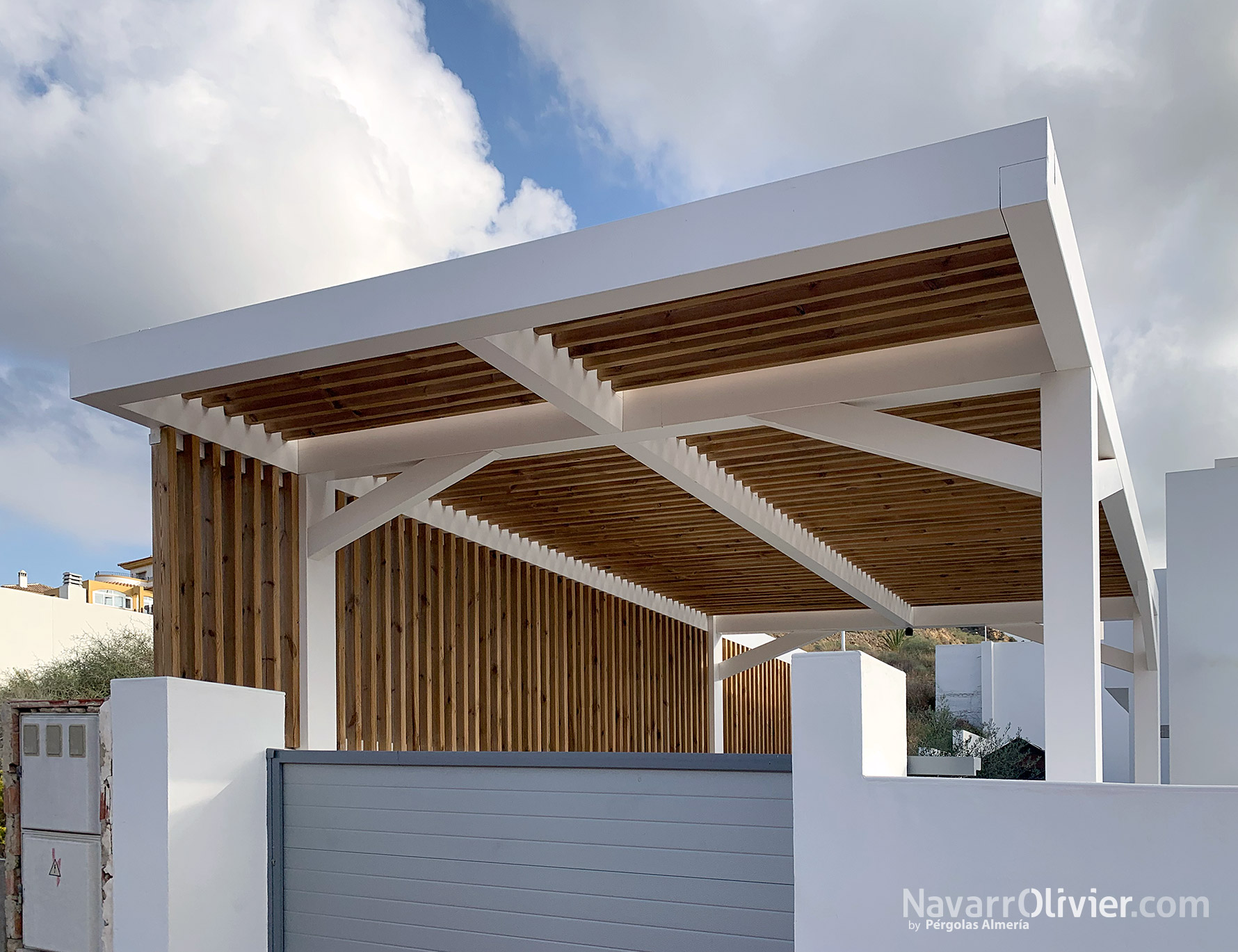 Para este proyecto utilizamos vigas de madera laminada estructural con un tratamiento para exterior acabado en blanco.