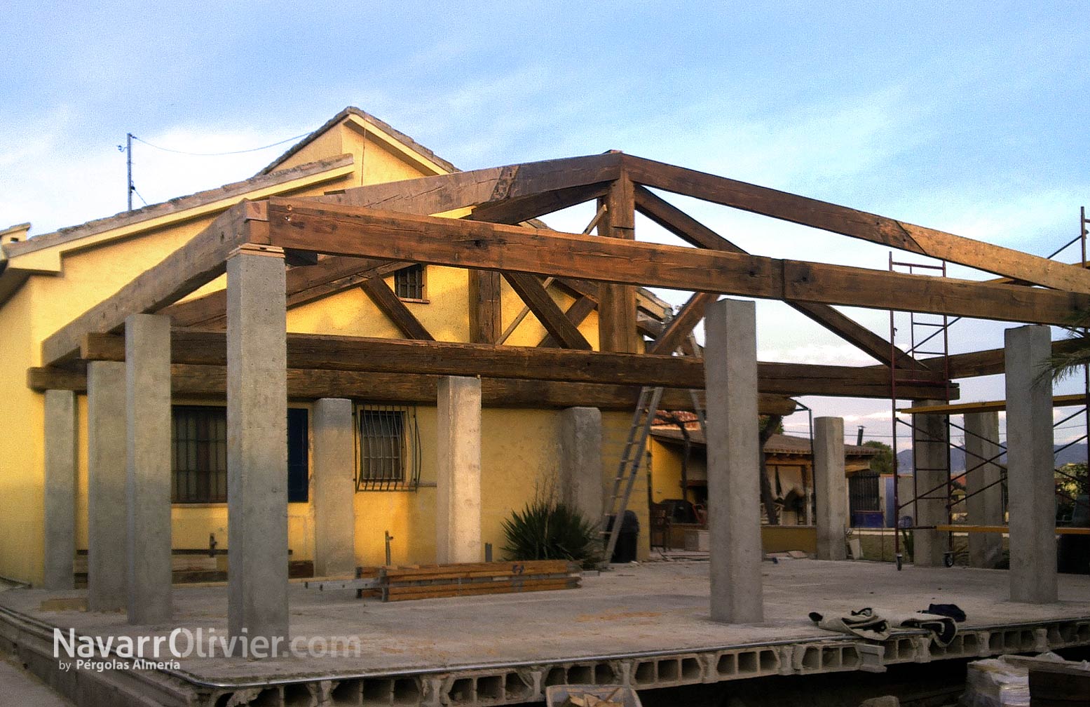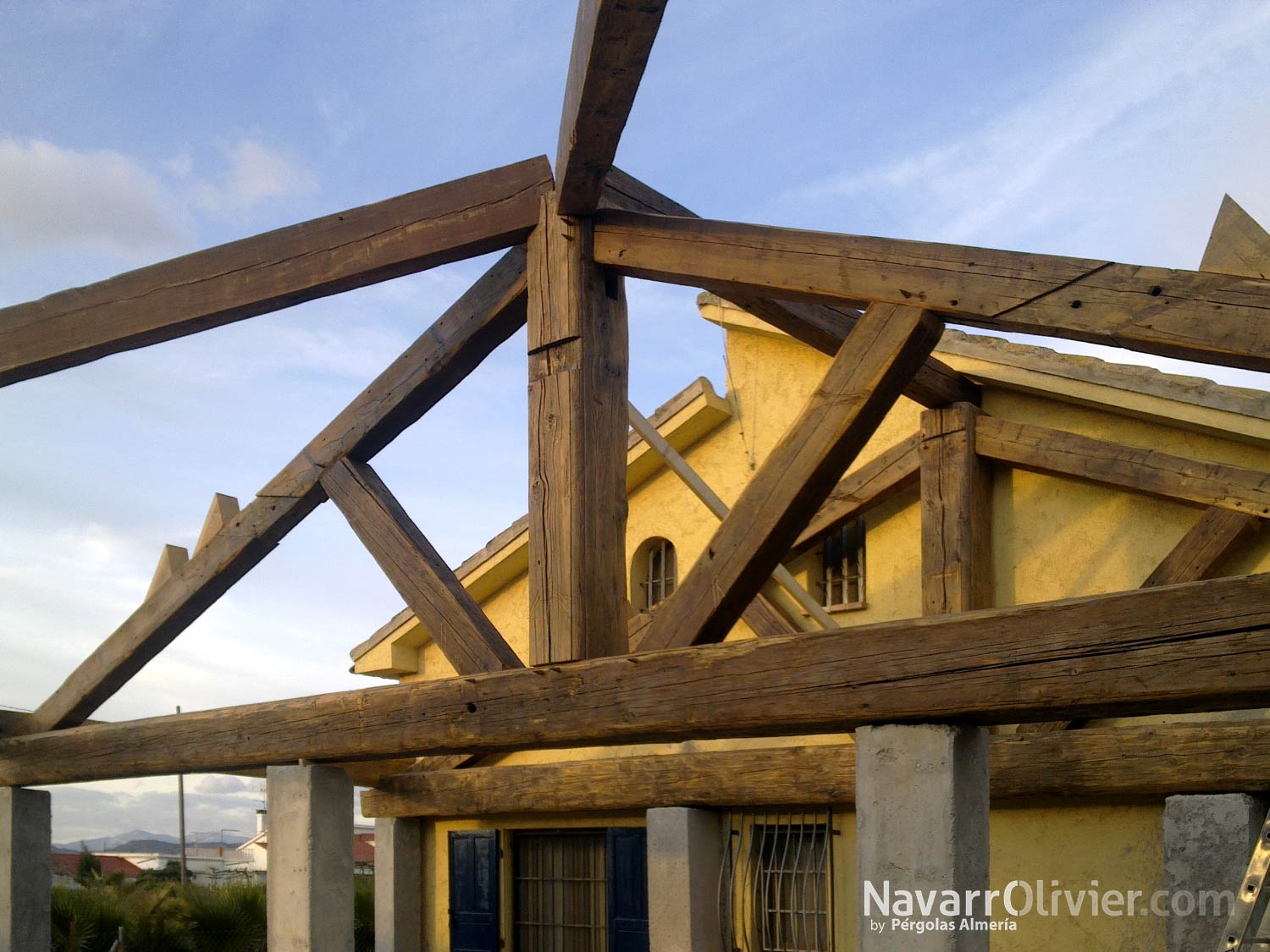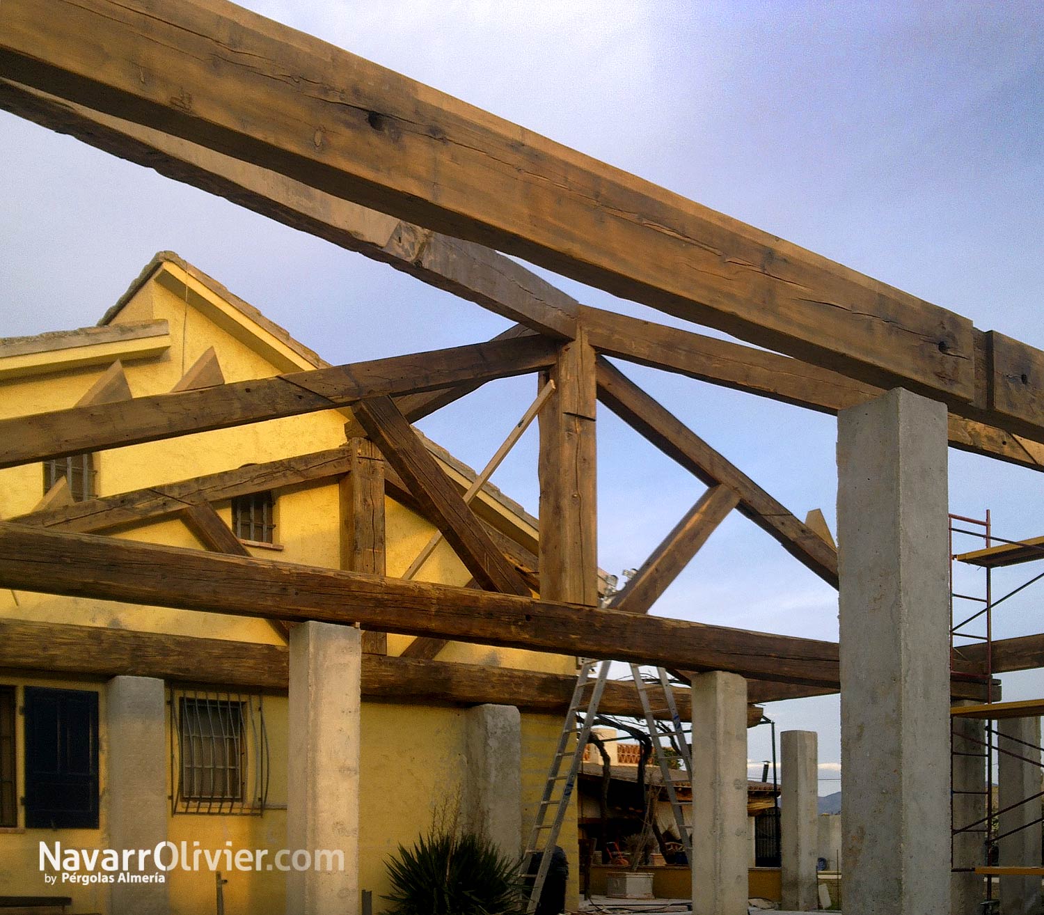 Construcción de tejado a 3 aguas para vivienda rural. Estructura construida en vigas de gran sección de madera centenaria recuperada de derribos, el aspecto rústico y sobre dimensionado de la madera reciclada le confiere calidez y alto valor estético a la techumbre.