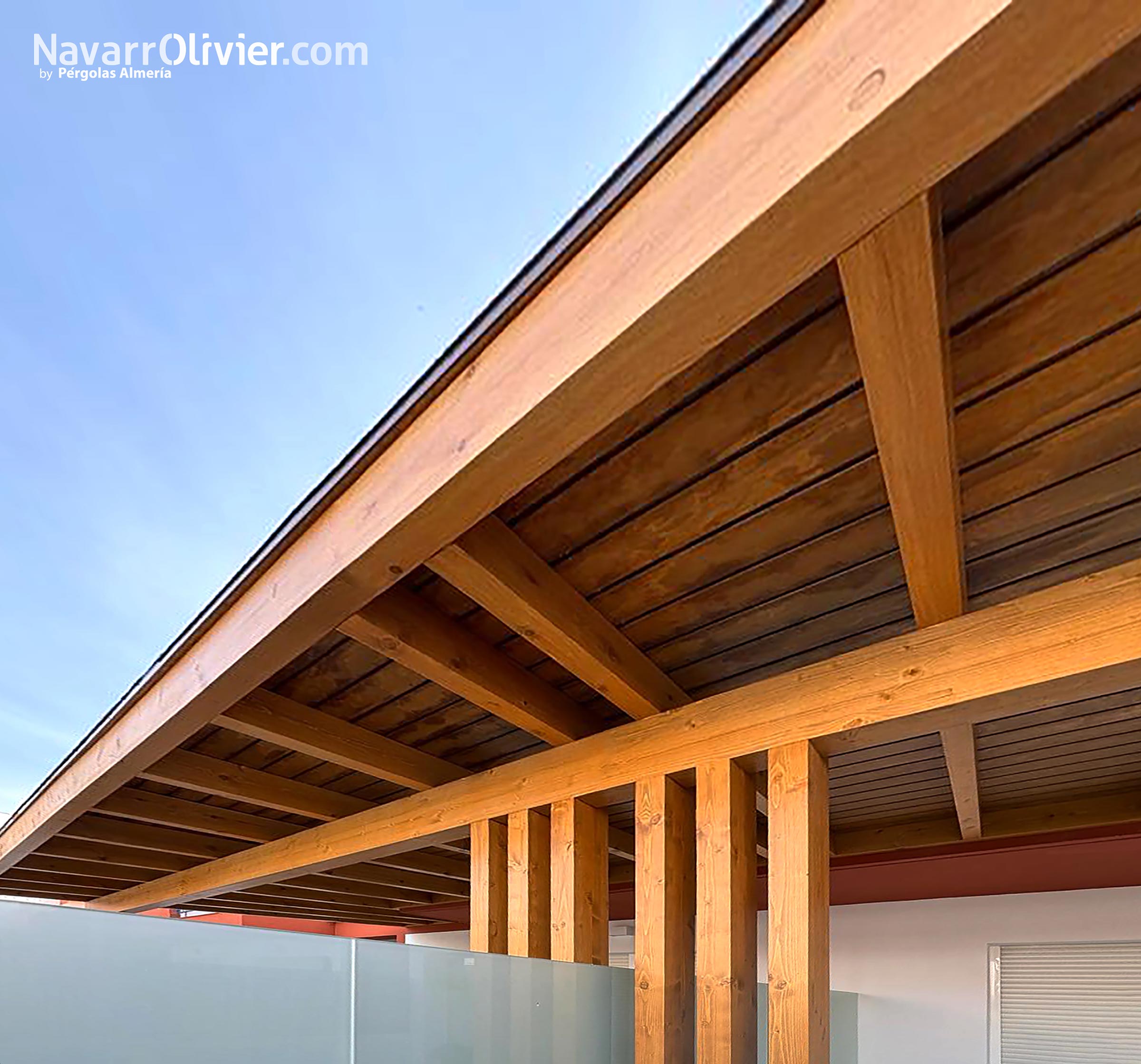 La pérgola de diseño minimalista y vanguardista de líneas limpias y contemporáneas, combina el aspecto robusto de la madera laminada y maciza que se integra perfectamente con la arquitectura de las viviendas.