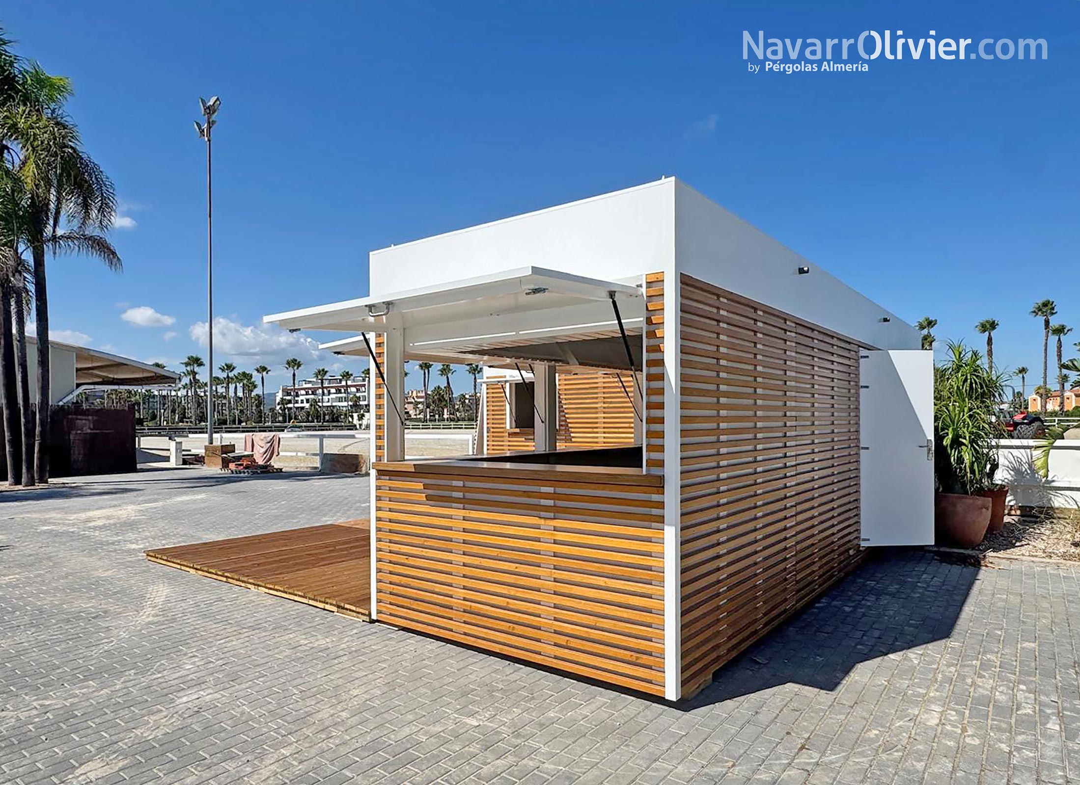 La construcción personalizada modular está configurada en forma de "L" en su interior se integran a la perfección zonas de cocina y barra, optimizando el flujo de trabajo. En el frente del módulo, está la terraza construida con un deck de tarima antideslizante de madera tratada en autoclave, que no solo amplía el espacio, sino que delimita un espacio acogedor y exclusivo.