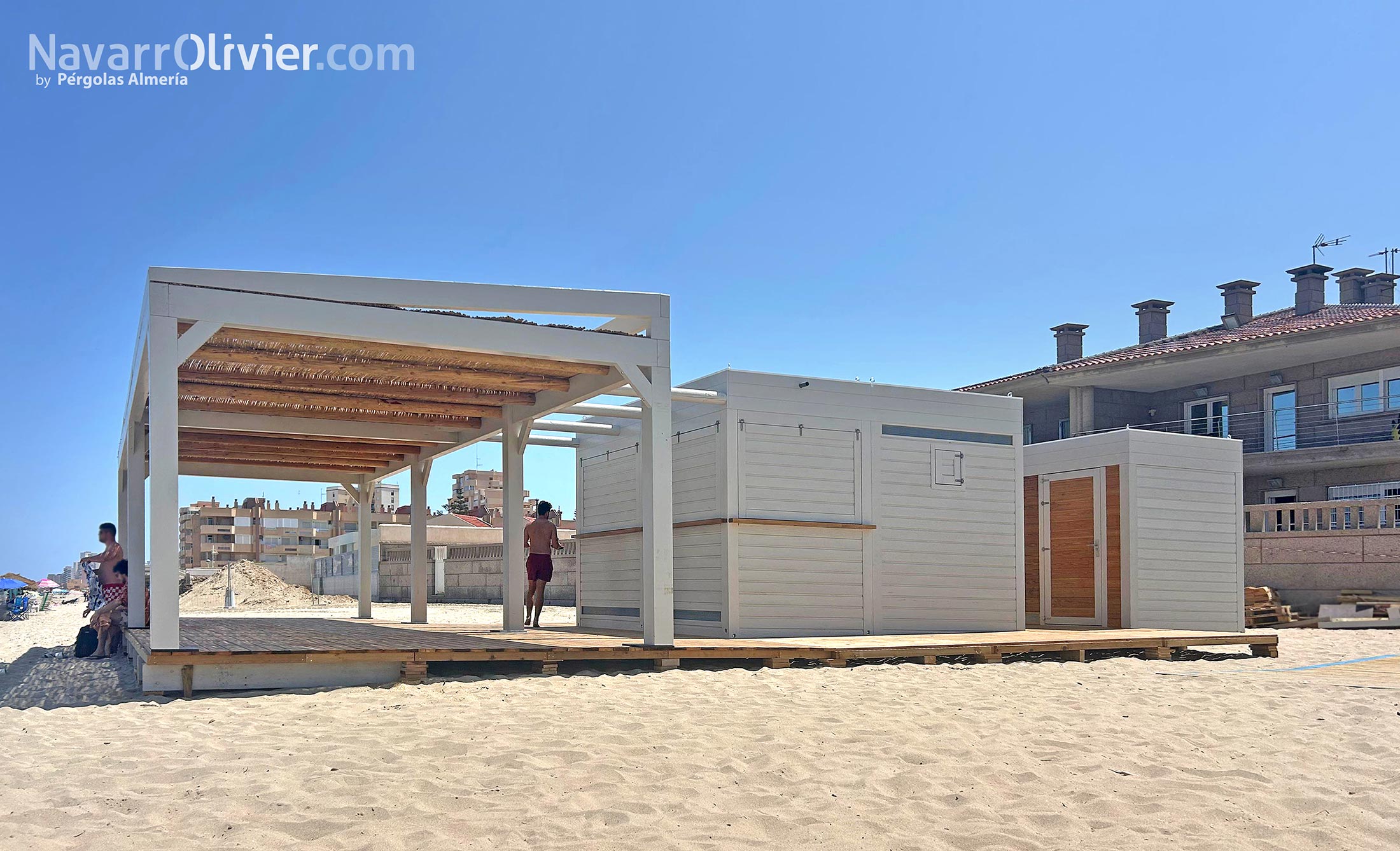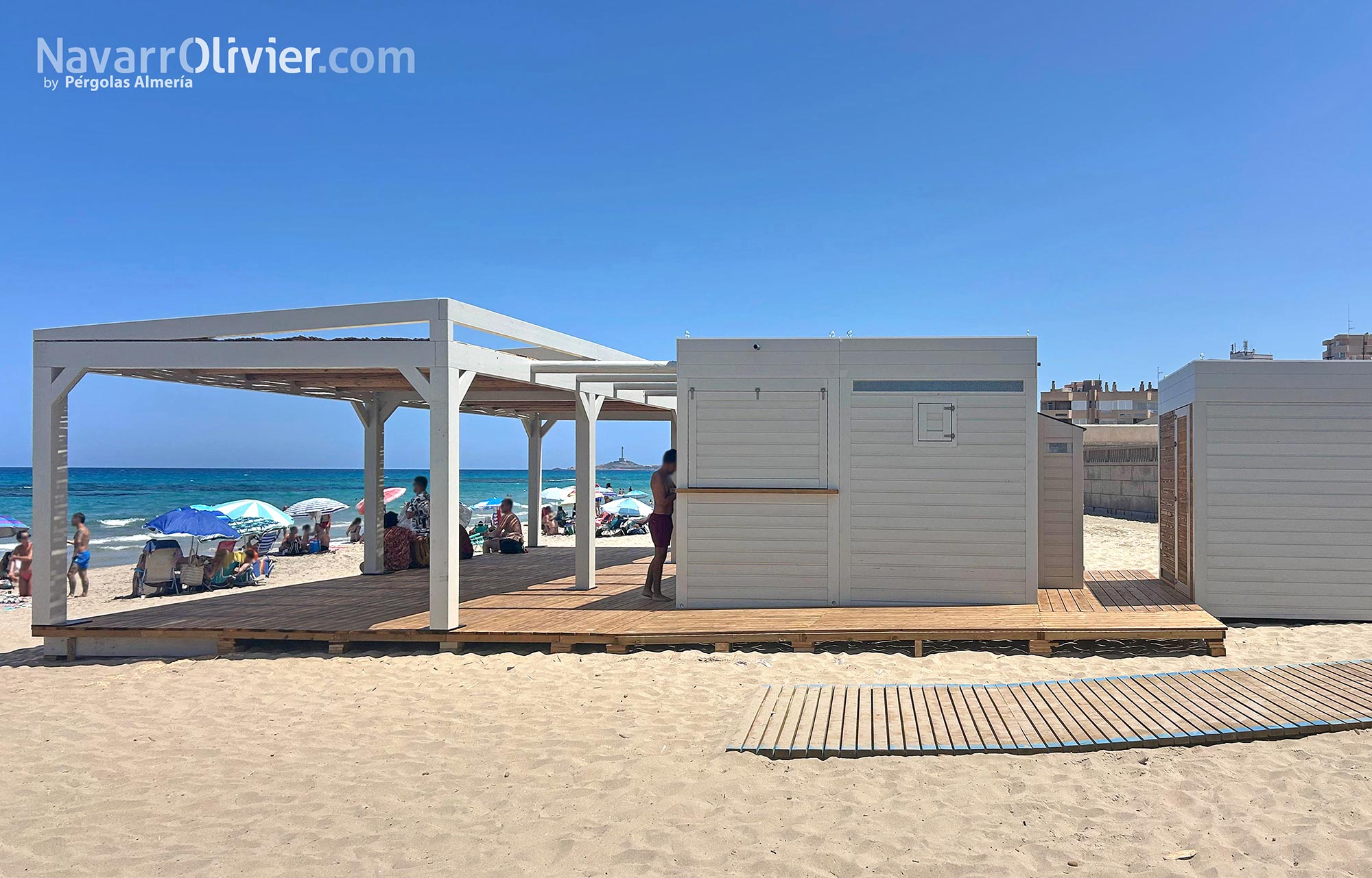 El perímetro del chiringuito al igual que la terraza cuentan con un pavimento desmontable construido en módulos de tarima autoclave anti deslizante, que facilita el montaje, desmontaje, transporte y almacenamiento. La terraza cuenta con una pérgola desmontable de aspecto natural construida en madera tratada, con cubierta de tronco calibrado y cañizo de caña entera ecológico.