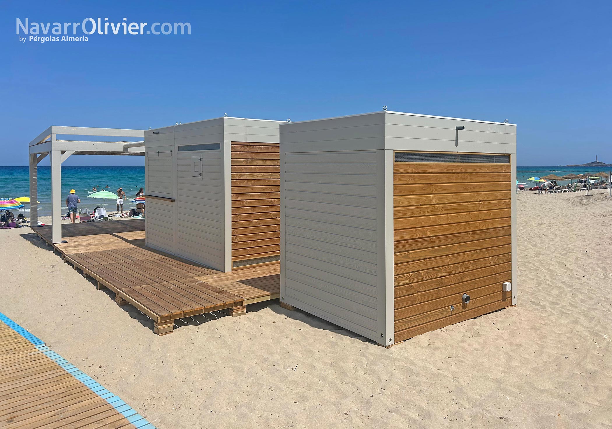 El establecimiento cuenta con un módulo separado, que mantiene la estética del chiringuito dedicado a los aseos accesibles con instalación sanitaria y eléctrica completa, preparada para conectar al suministro de agua y saneamiento.