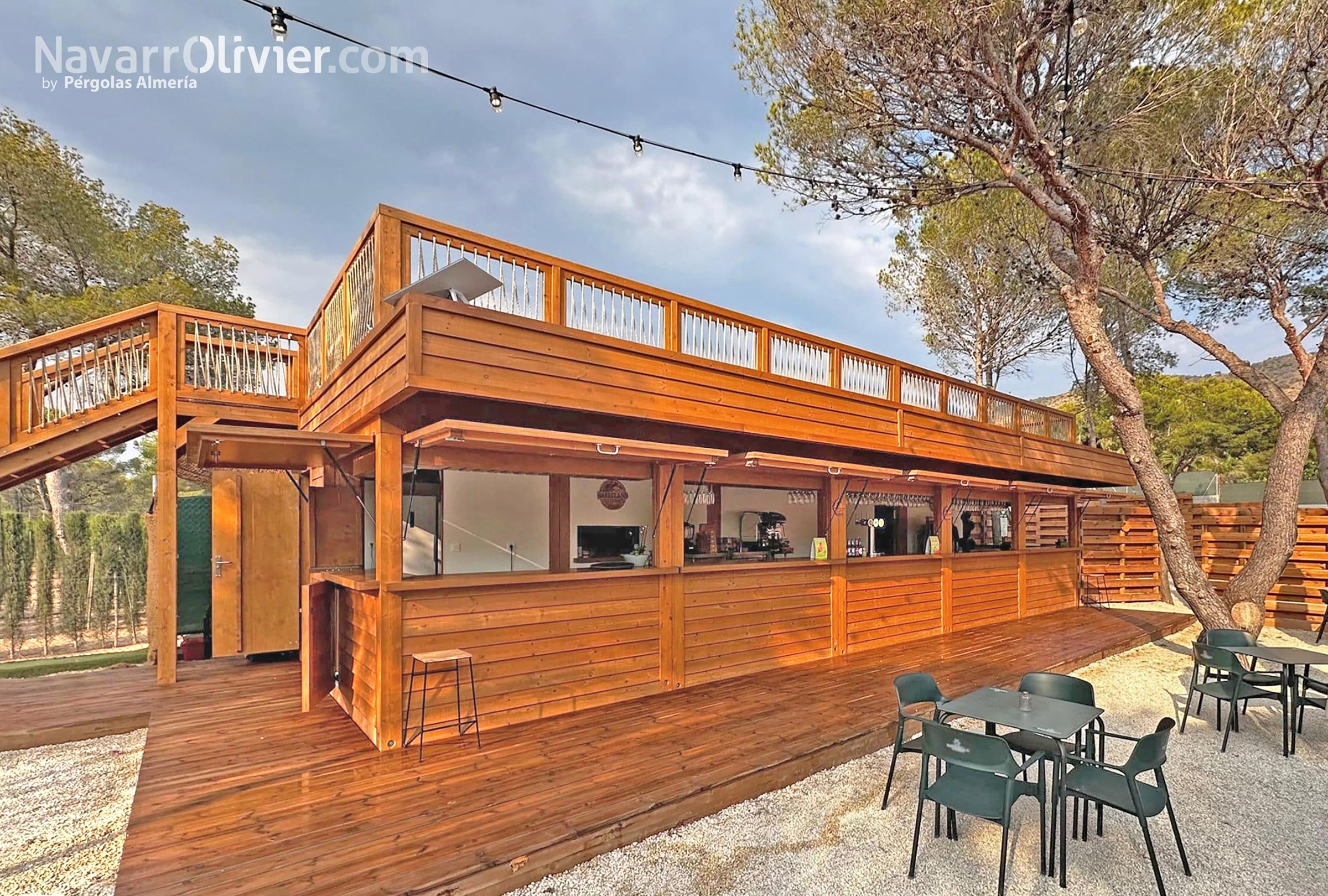 Construimos un chiringuito personalizado de madera de 50 m² preparado para dar servicio de bar cafetería a los visitantes. El chiringuito construido en módulos transportables se instaló sobre un forjado de madera asentado sobre pilotes hincados en el terreno, siguiendo con el compromiso de sostenibilidad del emprendimiento.