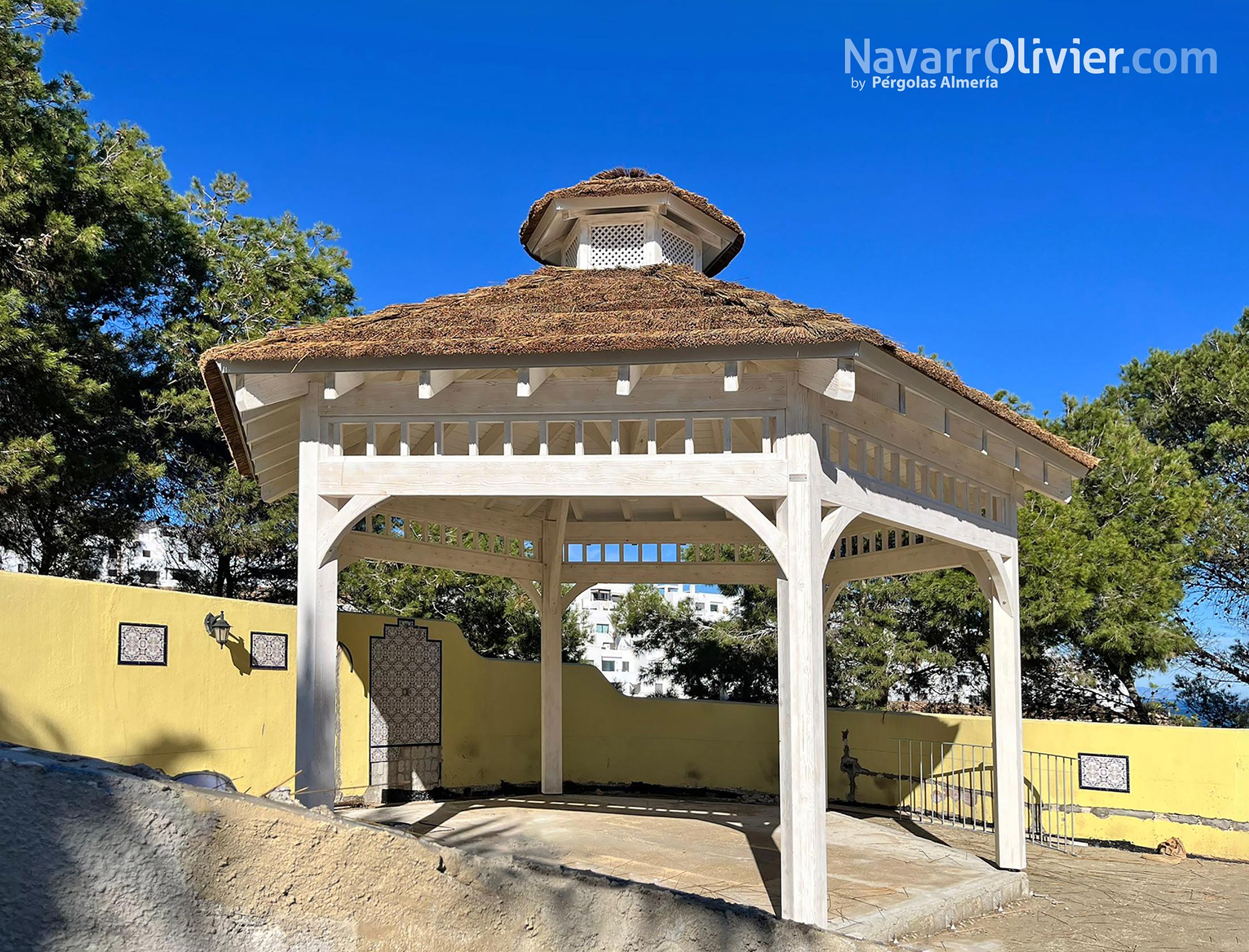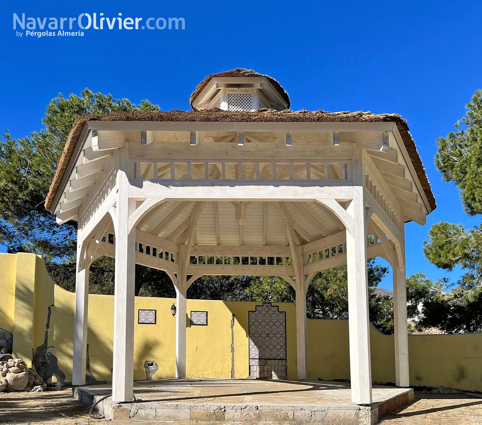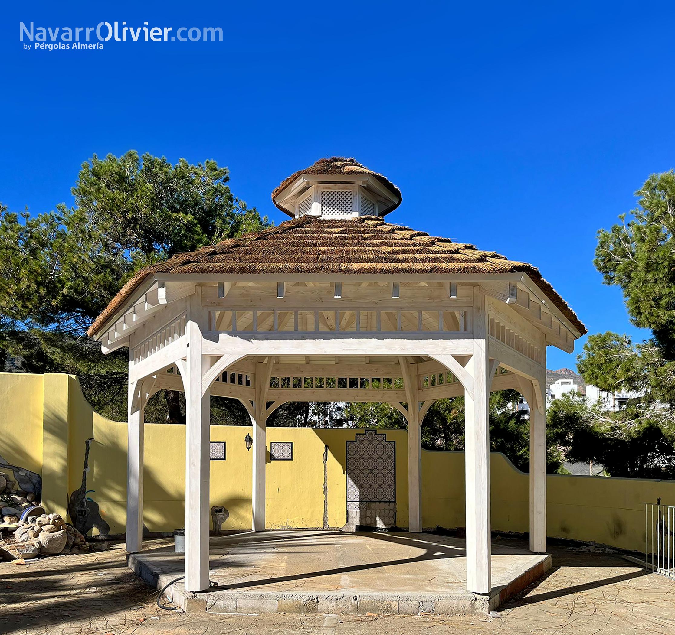 Gazebo hexagonal de madera para jardín en Macenas, Mojácar, Almería, Andalucía.