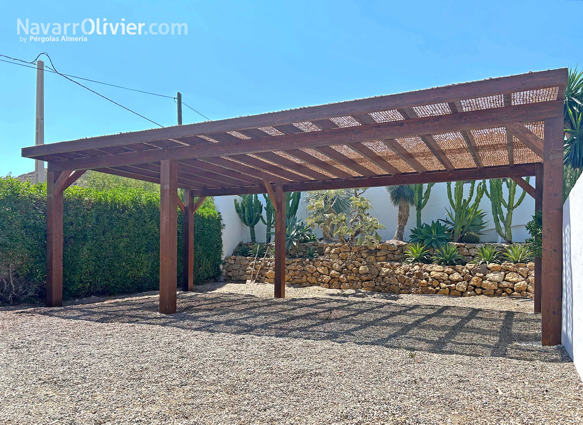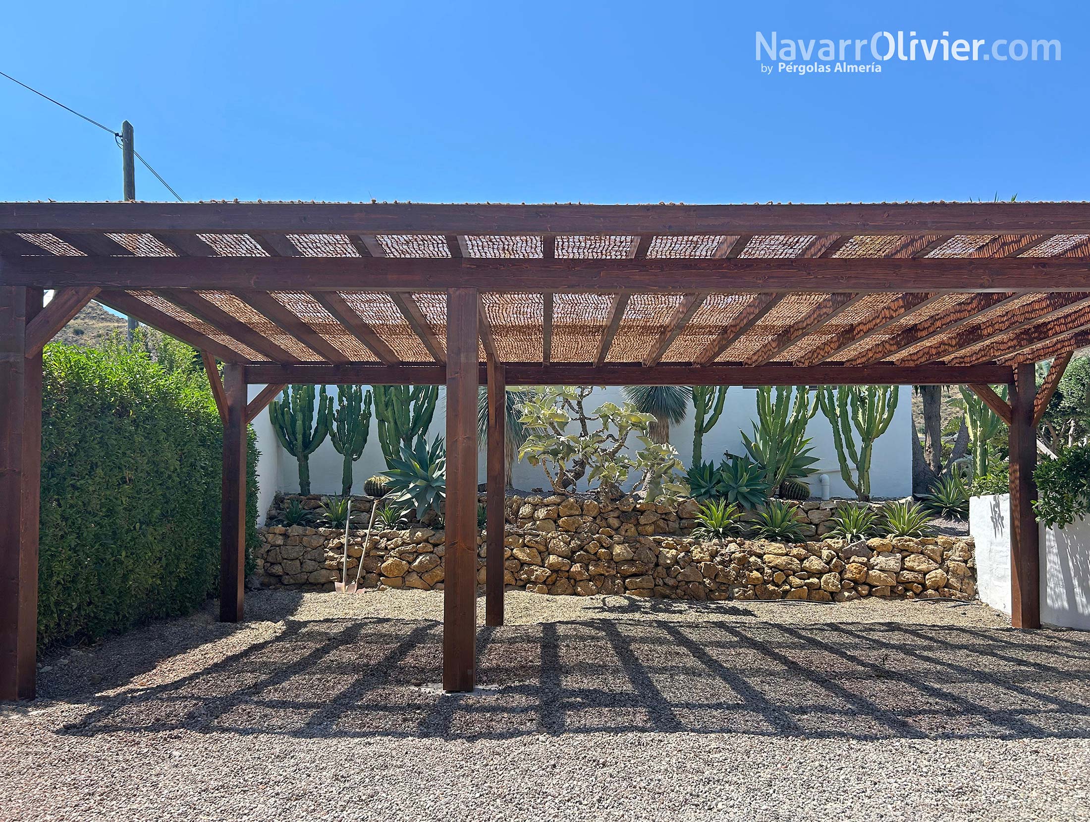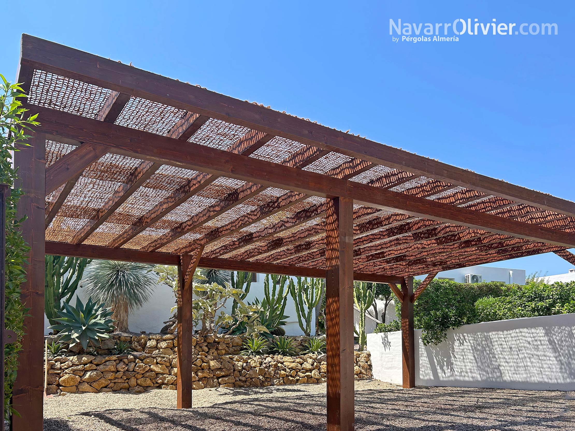 Bajo la red de fibra vegetal de la pérgola, el sol se filtra creando un juego luces y sombras orgánicas dibujando patrones sobre las texturas del jardín desértico, acariciando la piel de los cactus y realzando la calidez de la madera tratada.