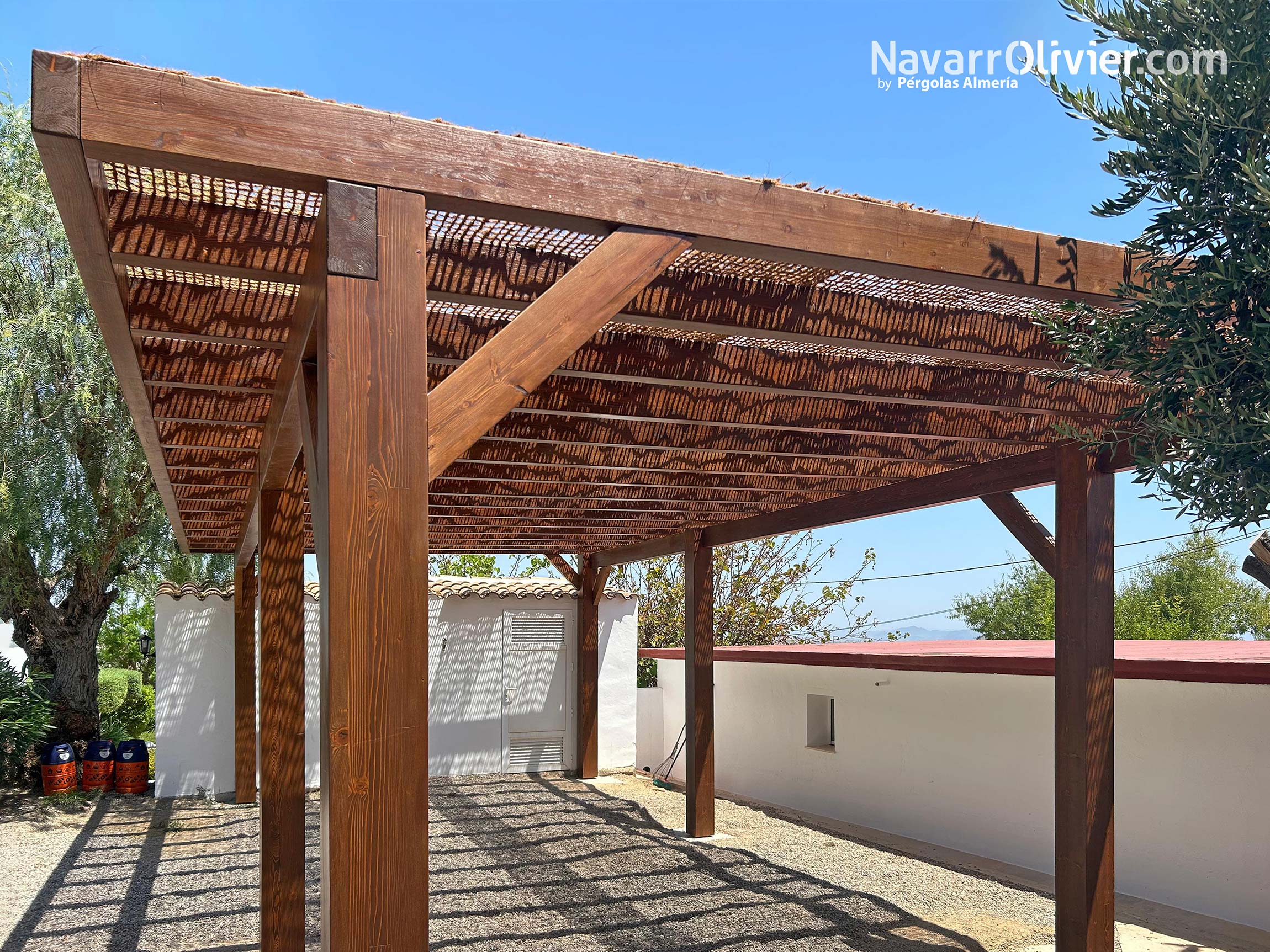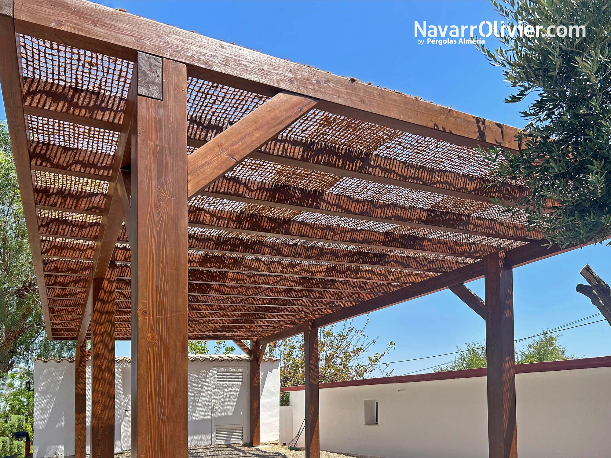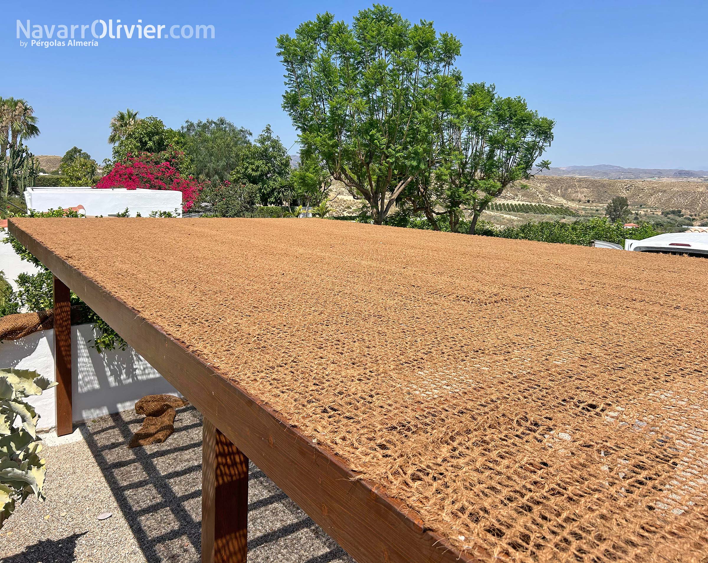 Pérgola de madera y red de fibra vegetal para 𝗖𝗼𝗿𝘁𝗶𝗷𝗼 𝗘𝗹 𝗦𝗮𝗿𝗺𝗶𝗲𝗻𝘁𝗼, casa rural con encanto, ubicada en 𝗠𝗼𝗷𝗮́𝗰𝗮𝗿, Costa de Almería, Andalucía.