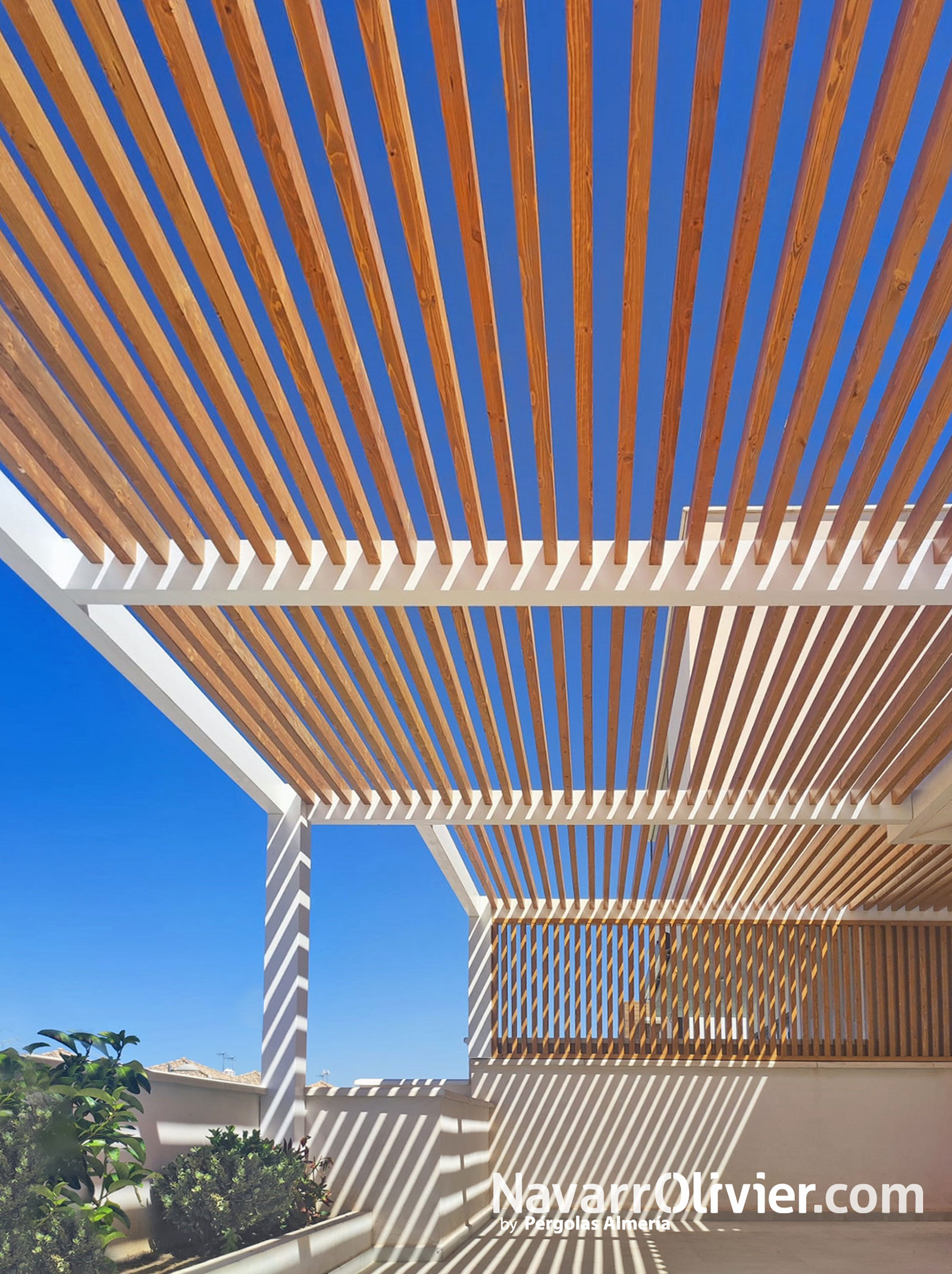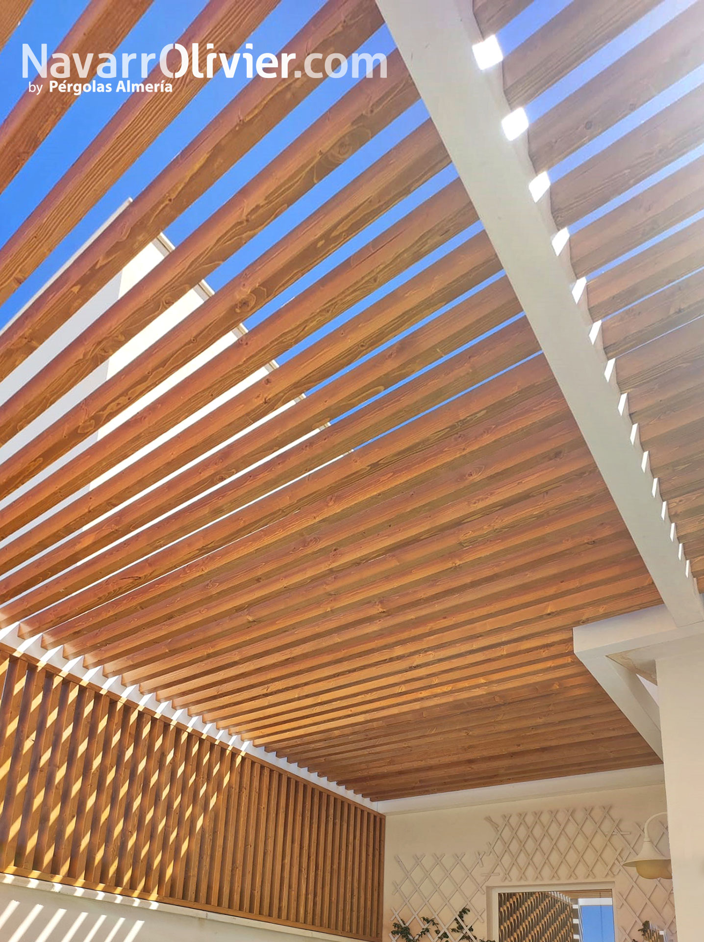 La cubierta está compuesta por un emparrillado de vigas de madera maciza, dispuestas en paralelo y tratadas para exterior con un tinte acabado en color roble para dar un toque cálido y natural al sombraje.