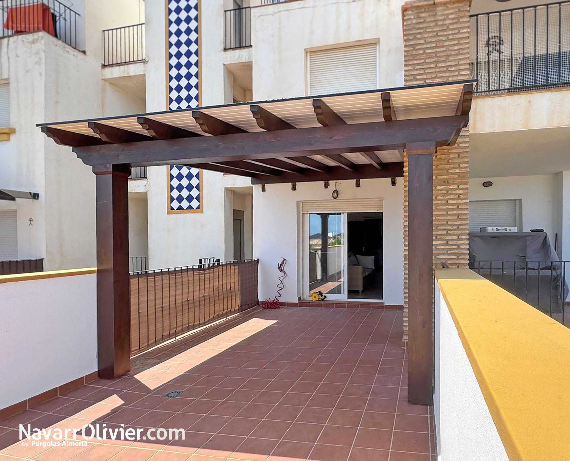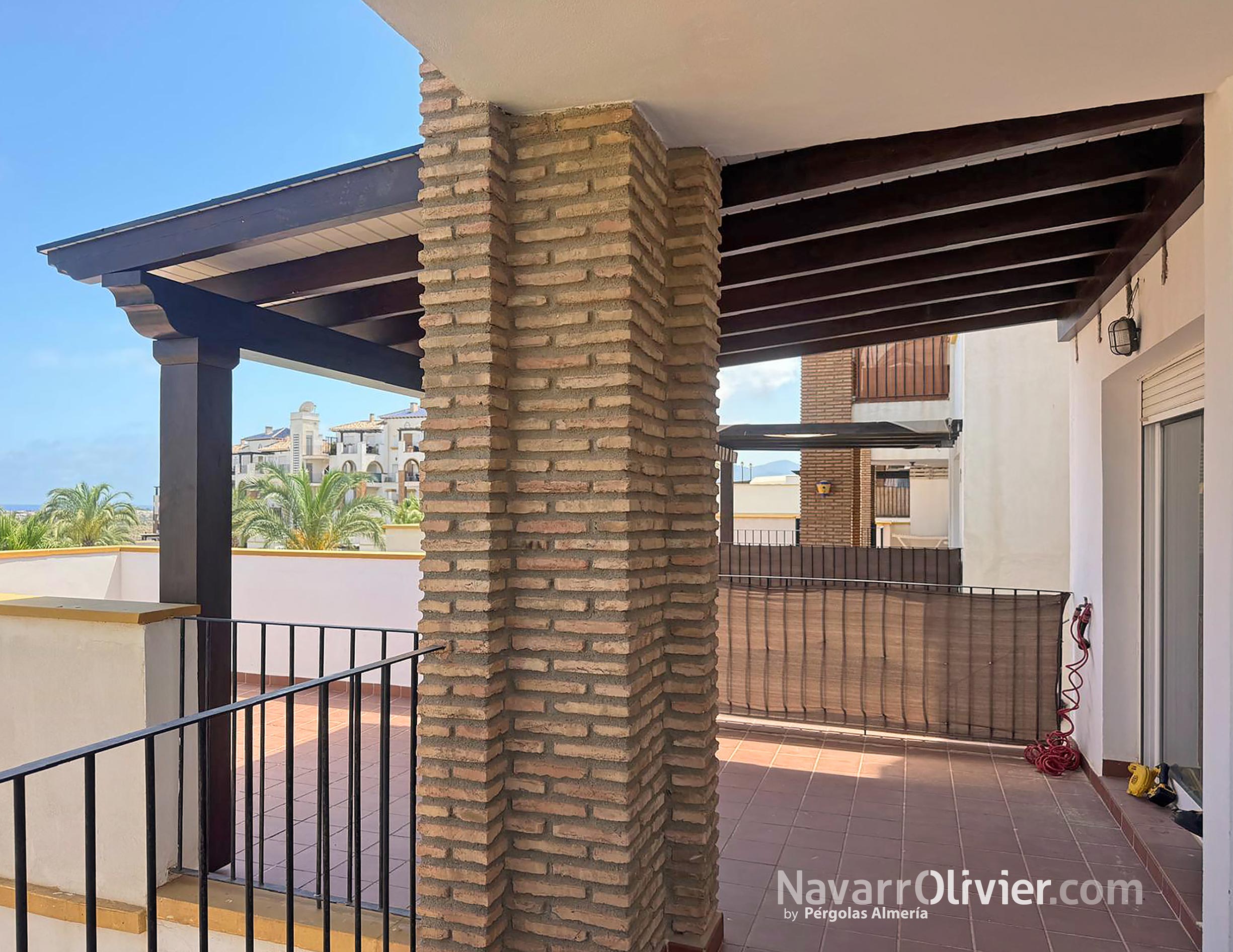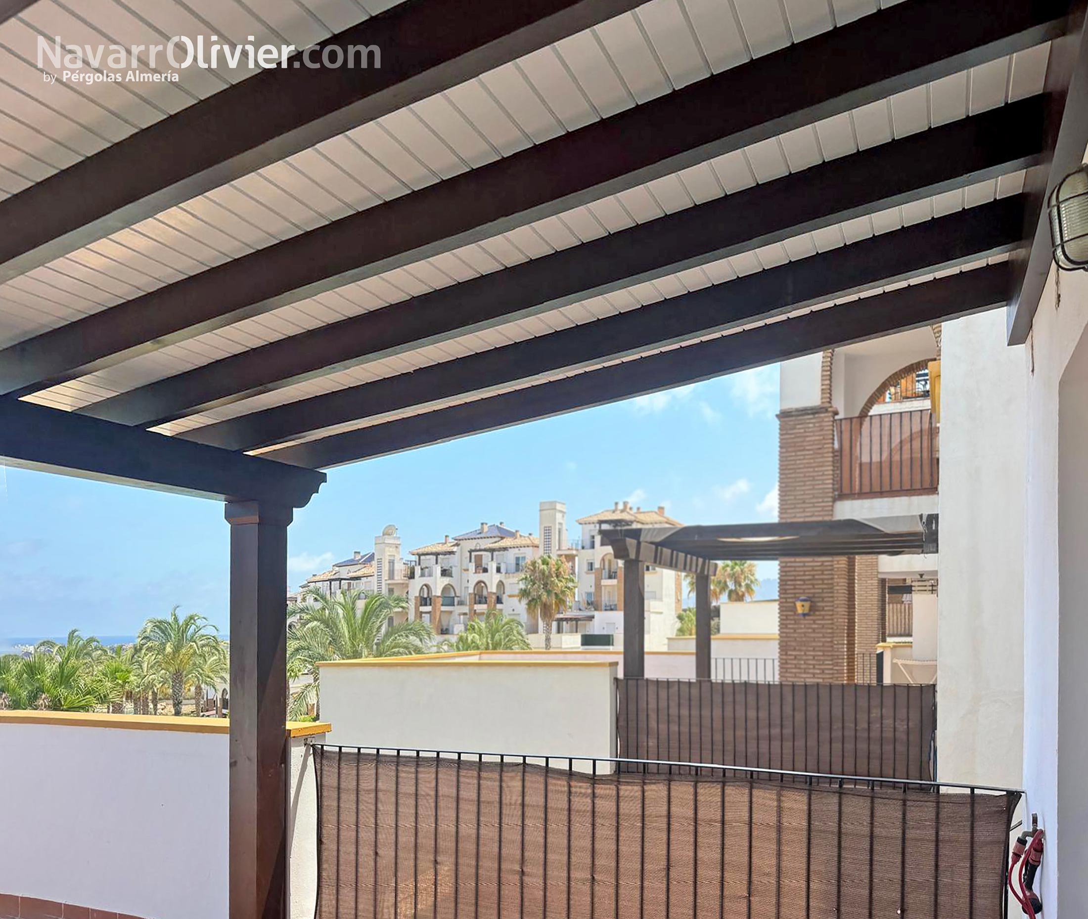Esta pérgola de madera aporta esa sensación de calidez, acogida y un toque rústico-elegante que se integra con el estilo de la urbanización ubicada en Vera Playa, Costa de Almería.