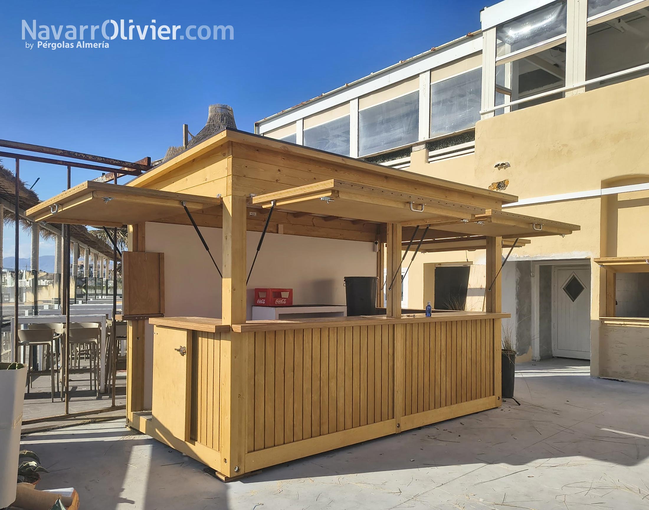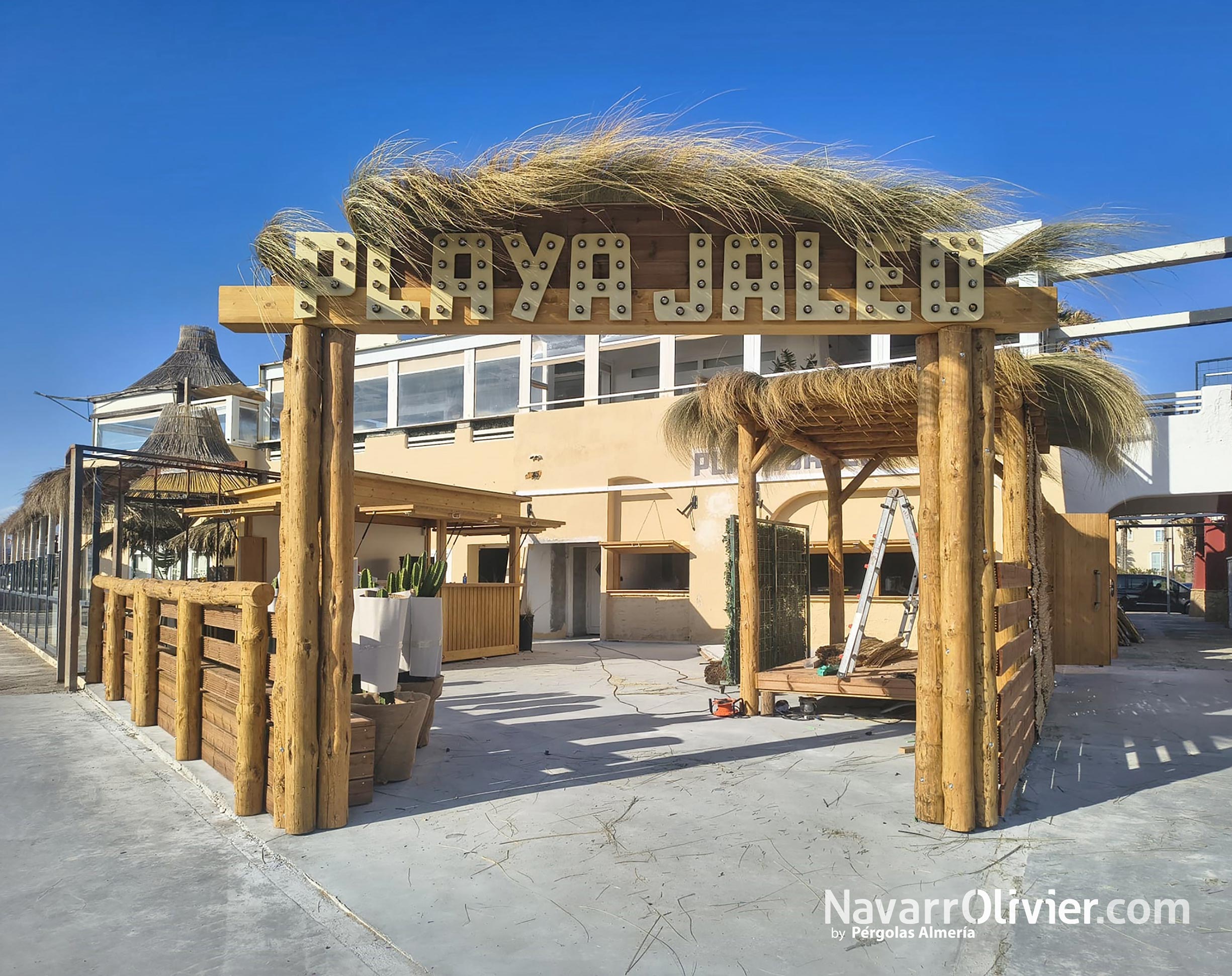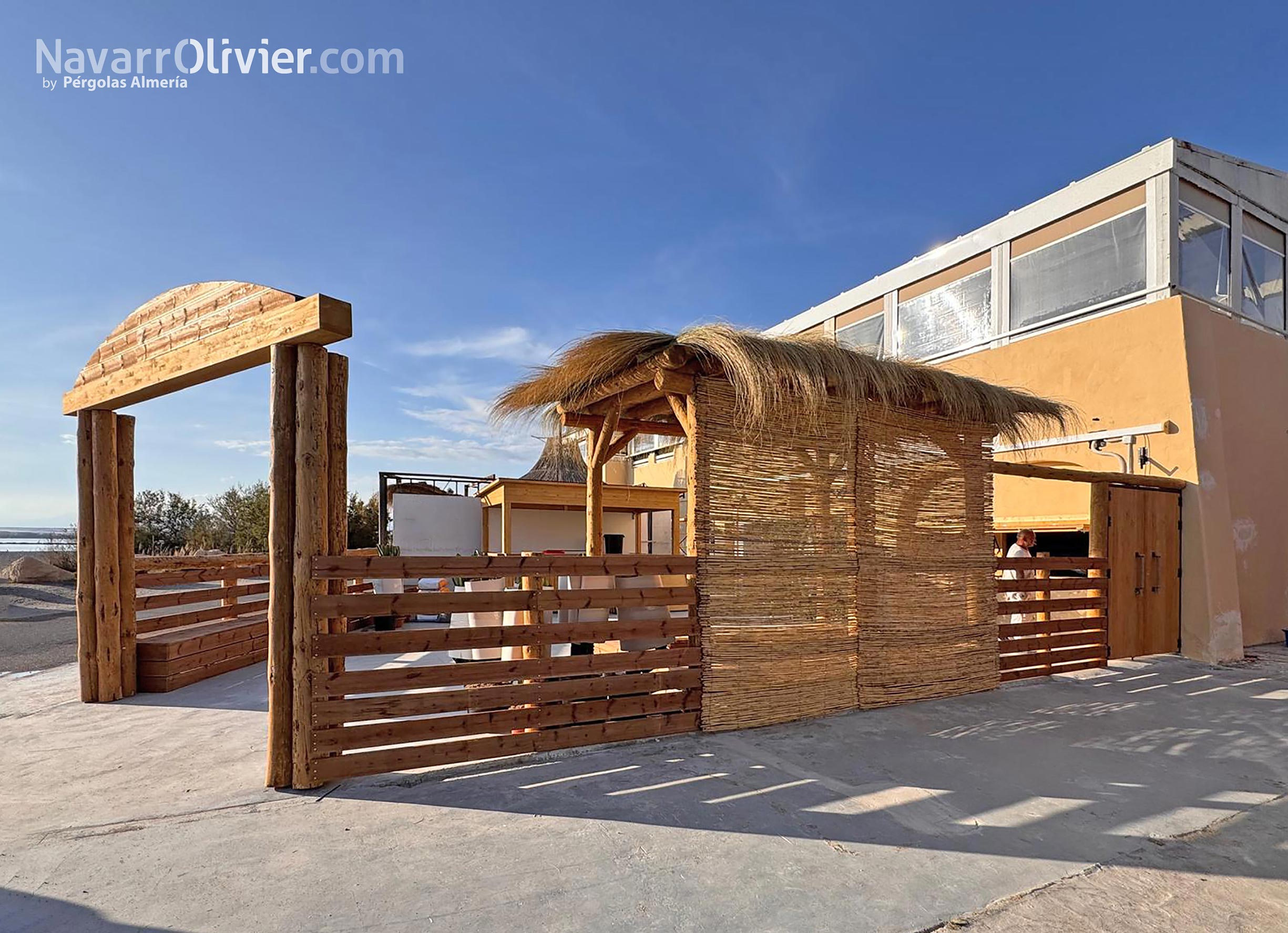 Siguiendo el estilo rústico construimos la tarima con cubierta de tronco, cañizo y carritx para la cabina del dj, además de un chiringuito modular modelo Campello de 10 m² equipado con instalación eléctrica preparado para dar servicio a la terraza de Playa Jaleo este local de ocio ideal para tardeos junto al mar ubicado en la playa de Almerimar, Costa de Almería.