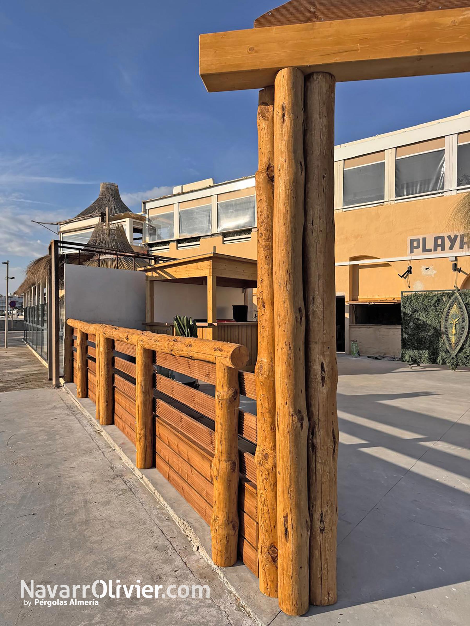 Construimos esta terraza rústica de estilo mediterráneo delimitada por una valla de tronco descortezado tratado para exterior y lamas de tarima autoclave.En la esquina de la terraza fabricamos un pórtico de entrada de tronco y madera que sirve como soporte para el rótulo de Playa Jaleo, coronado con carritx natural.